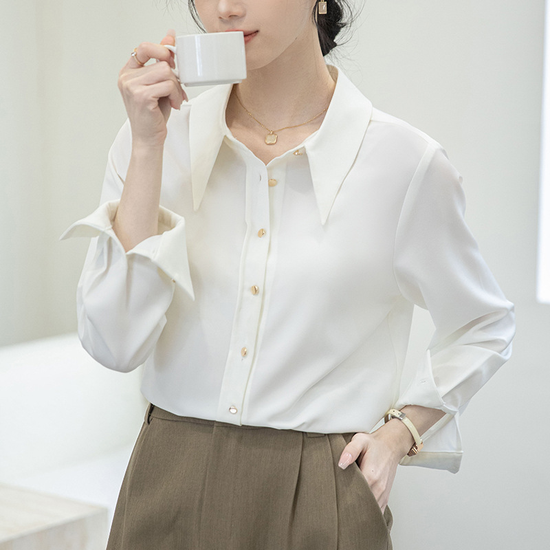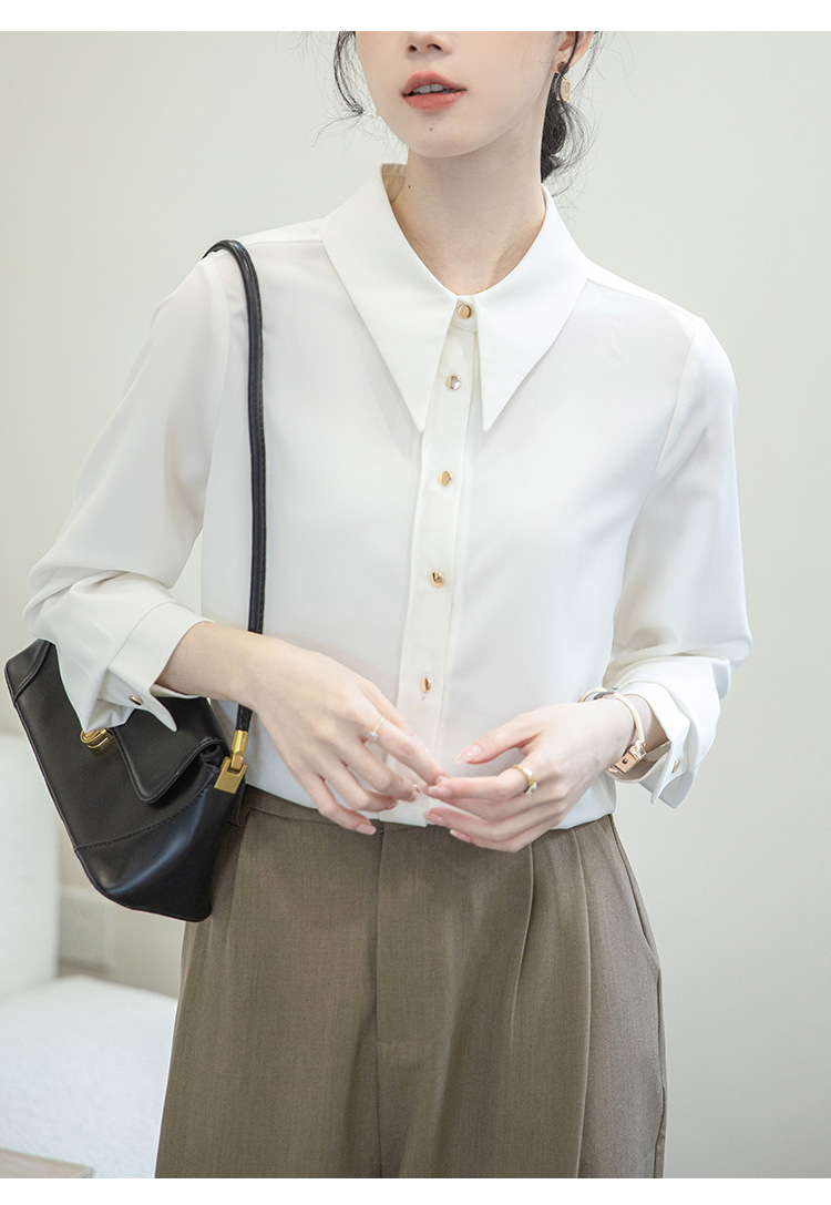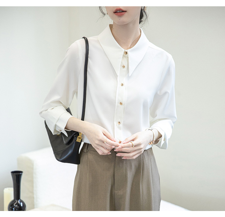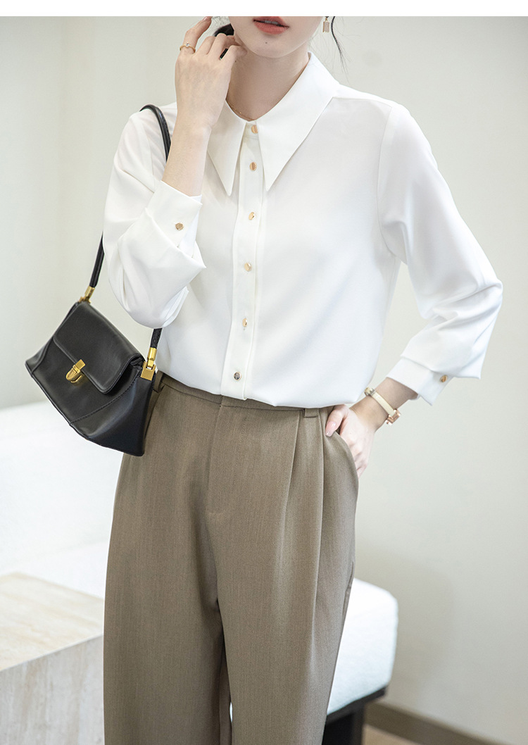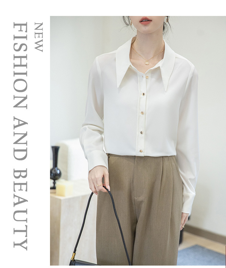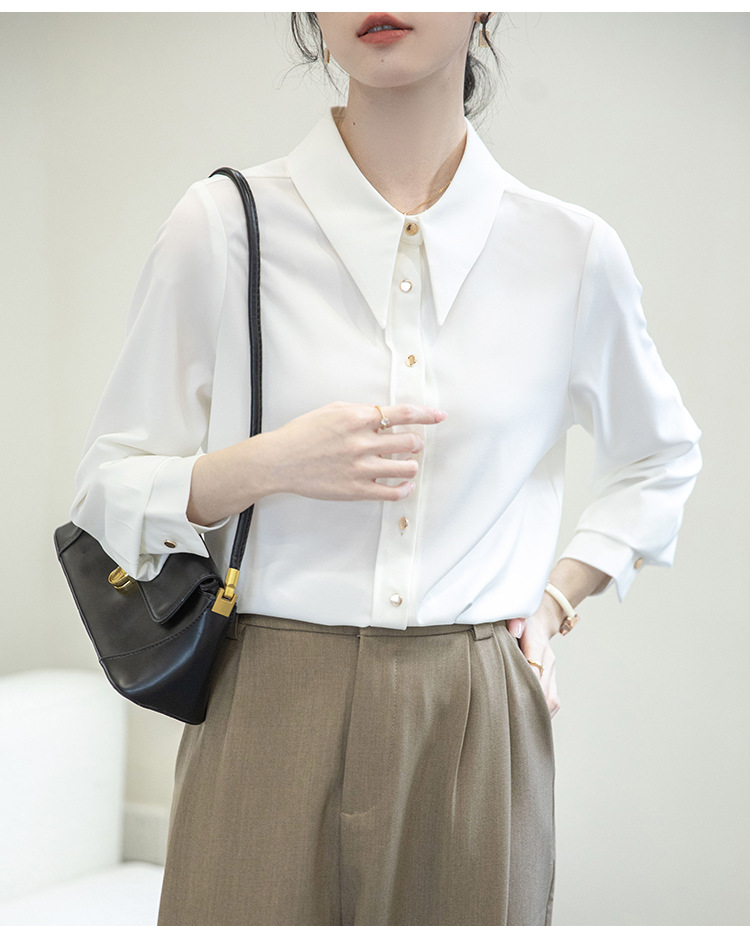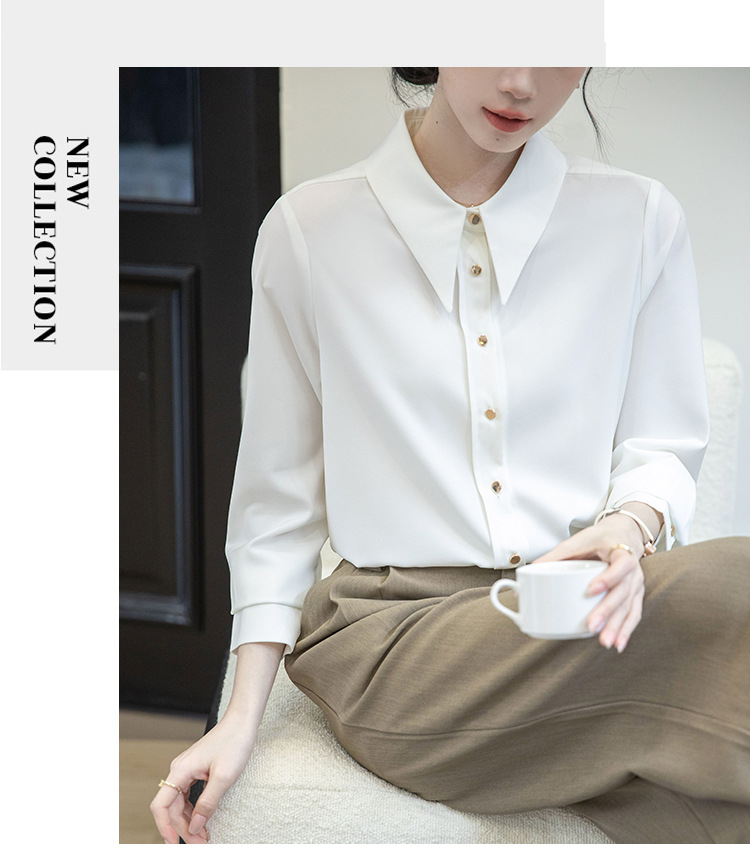 2024 Real Shot Spring Small Point Collar Commuter White Shirt 여성 Satin Draping Professional Top Design Sense Niche
