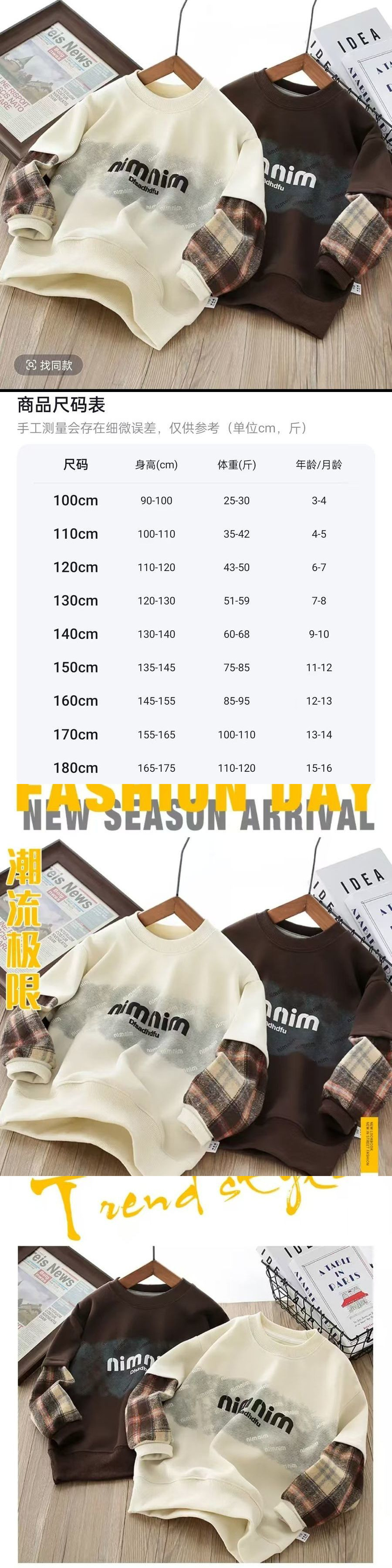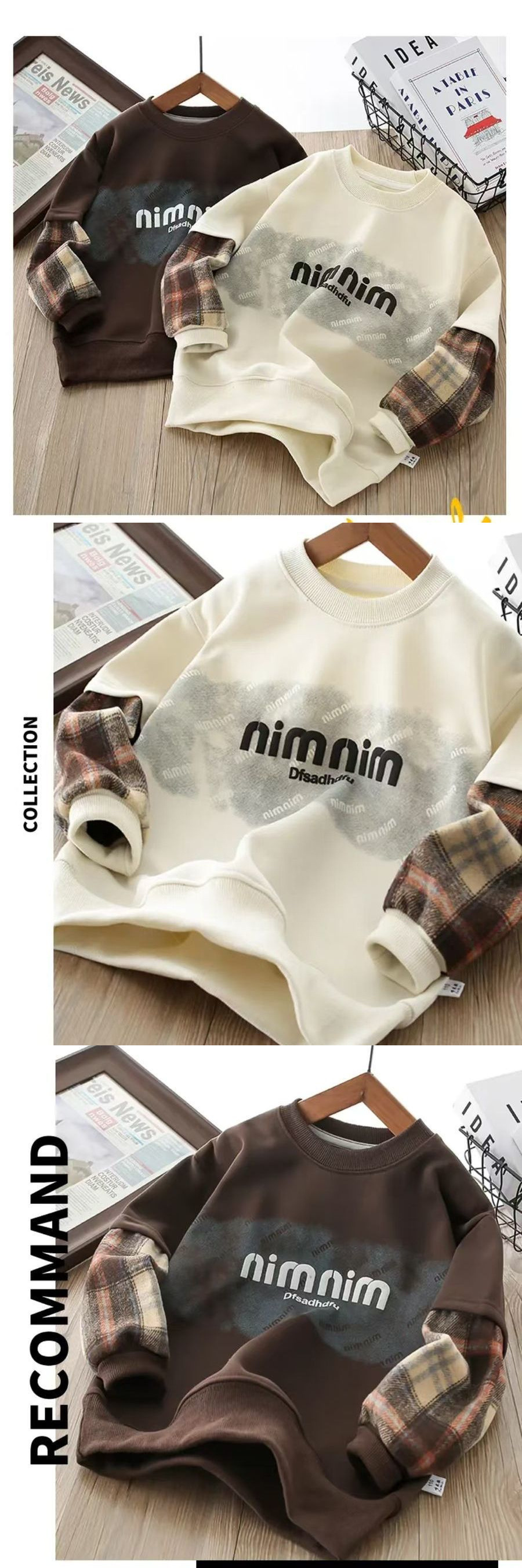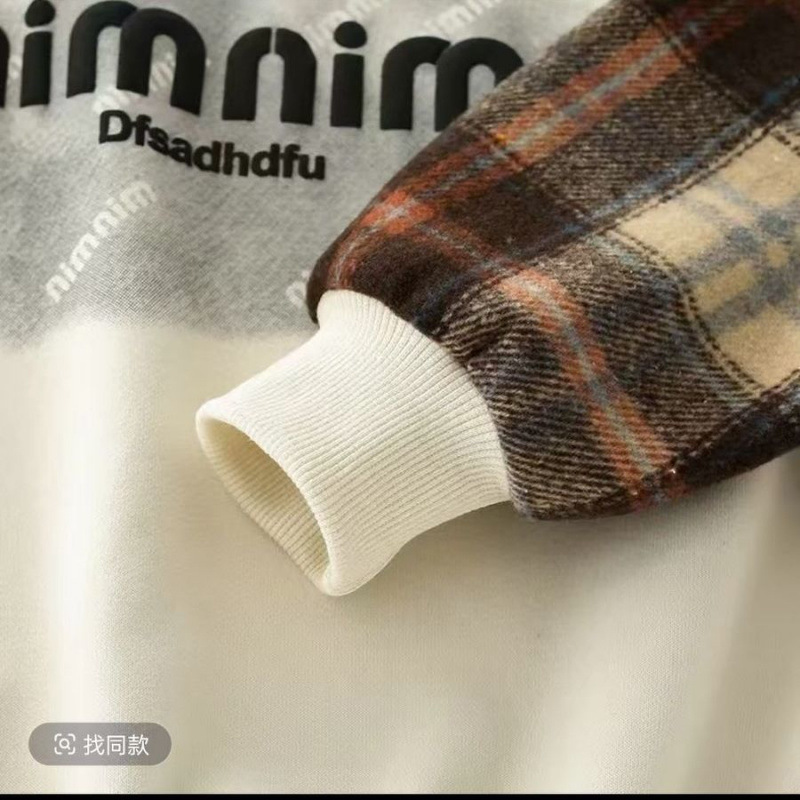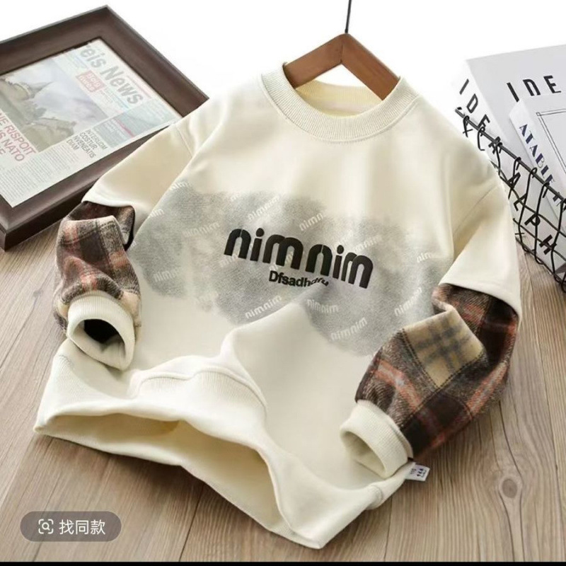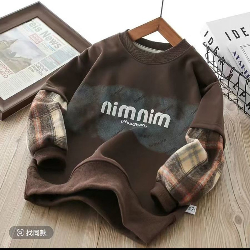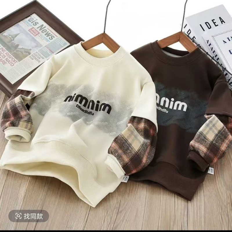 어린이 스웨트 셔츠 2025 봄 새로운 패션 편안한 캐주얼 유행 격자 무늬 크루 넥 가짜 투피스 샘플 옷스토어 가기