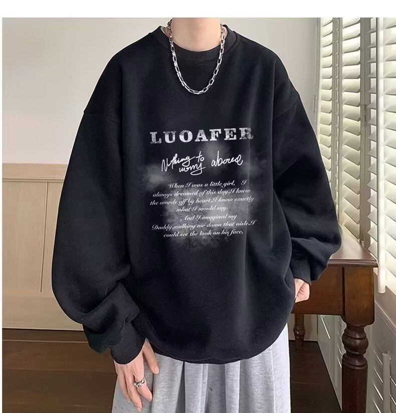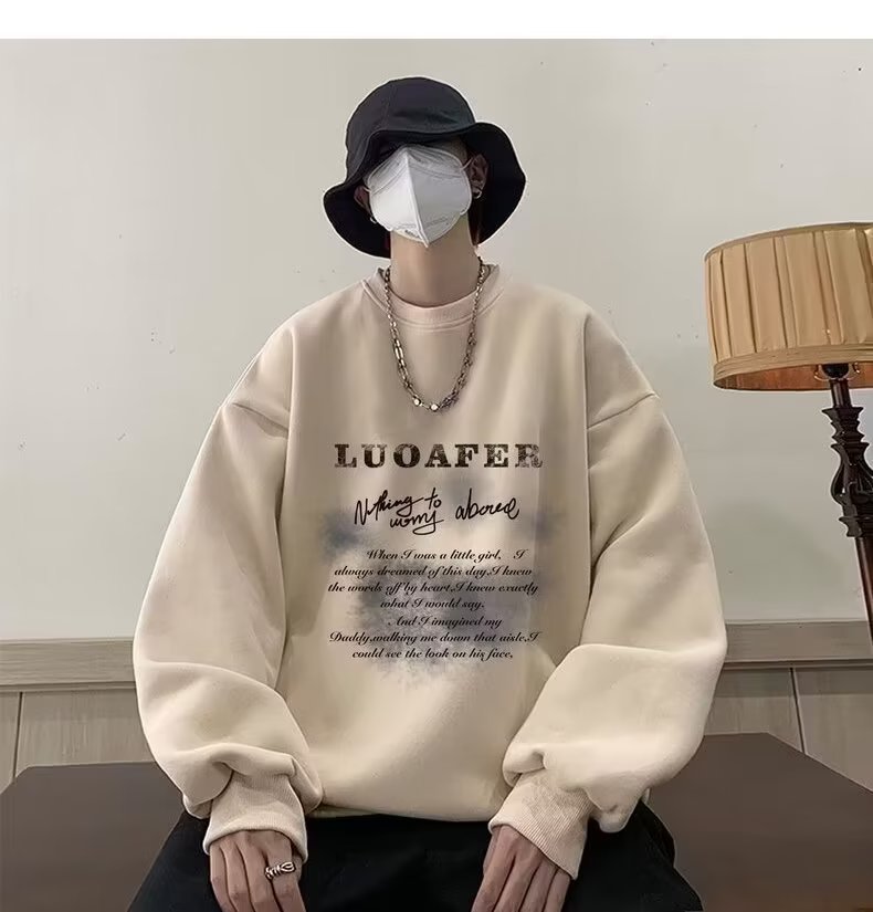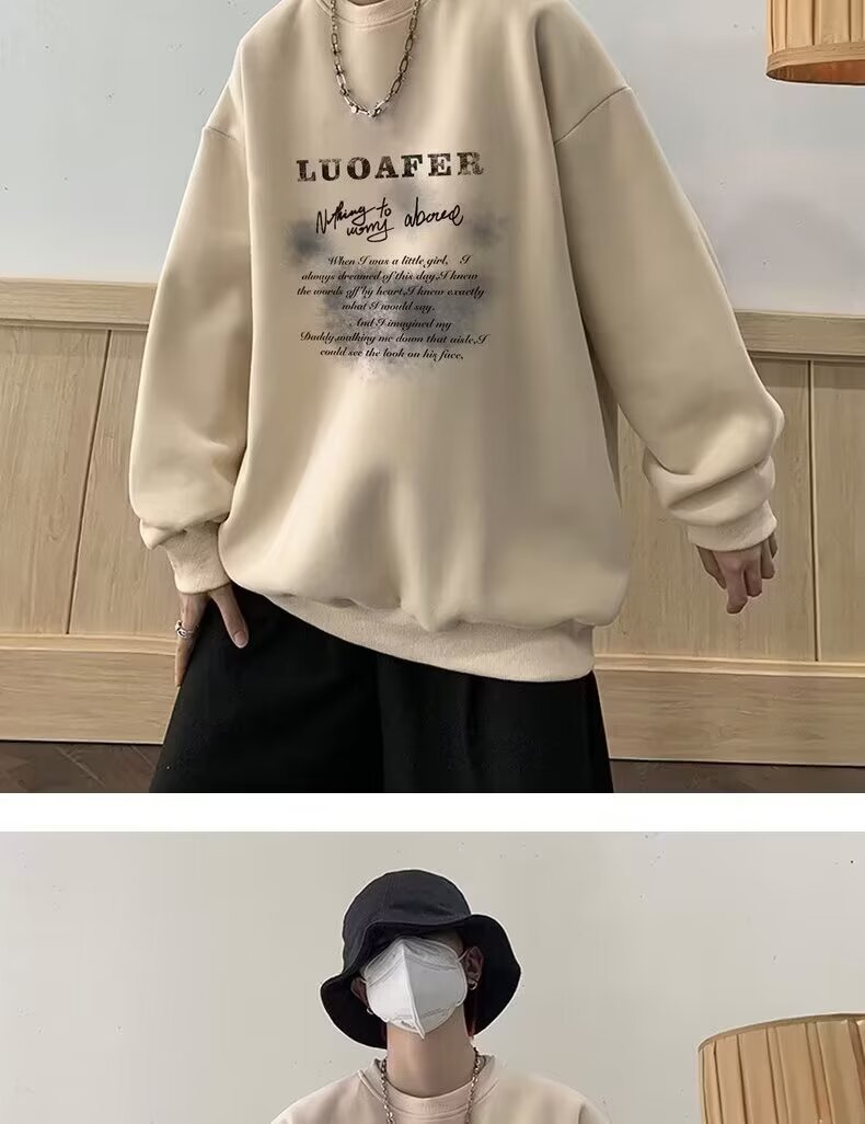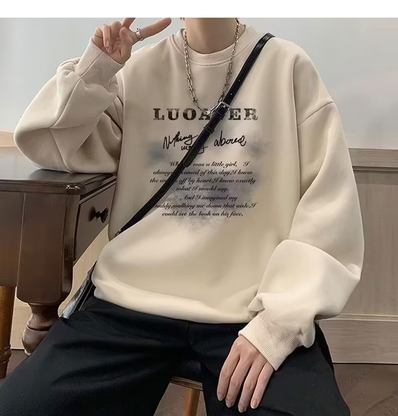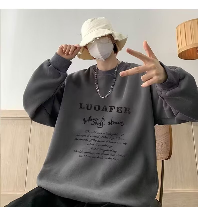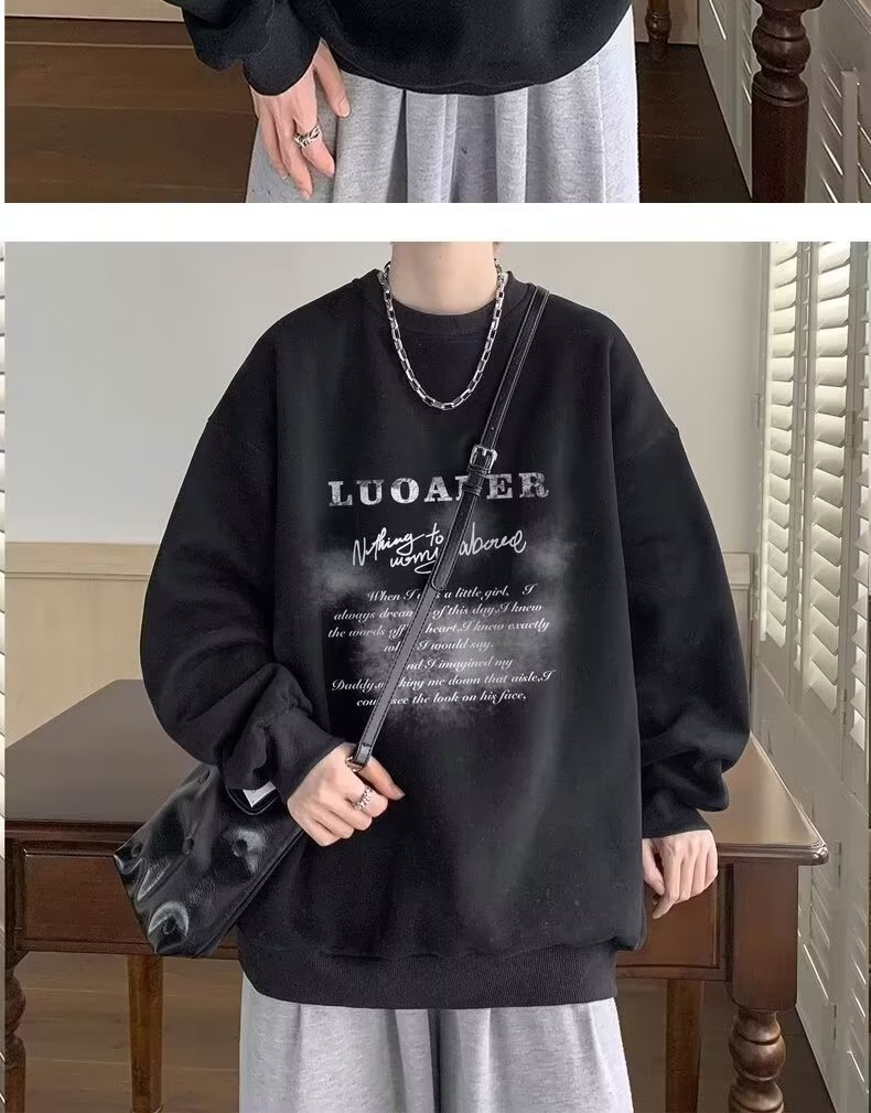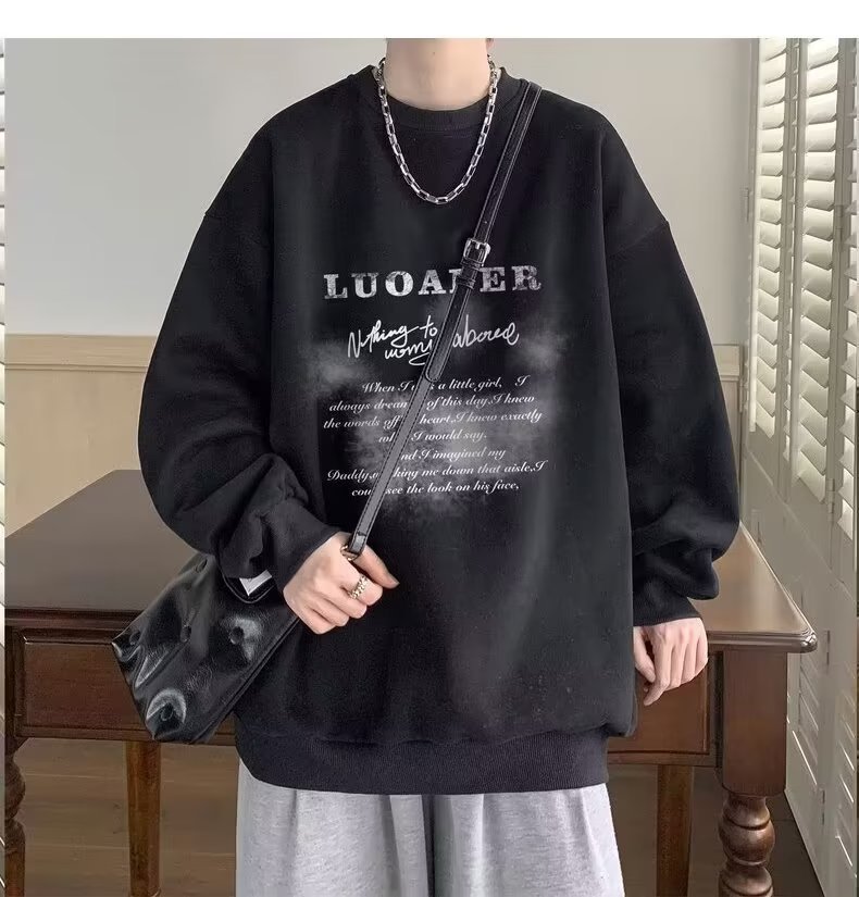 땀 남자 라운드 넥 2024 가을과 겨울 새로운 패션 브랜드 패션 올 매치 프린트 톱 남자 한국 스타일 기모 캐주얼 긴 소매