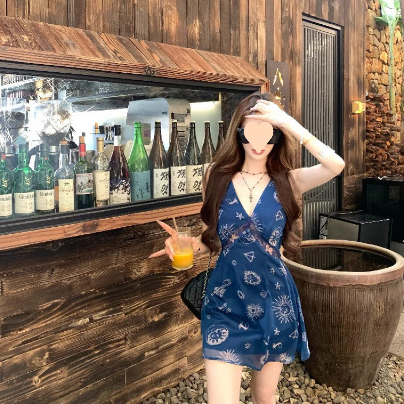 빈티지 프린트 칼라 조끼 원피스 여성 봄과 여름 새로운 우아한 꽉 허리 슬리밍 스파이스 소녀 스타일 휴일 긴 치마