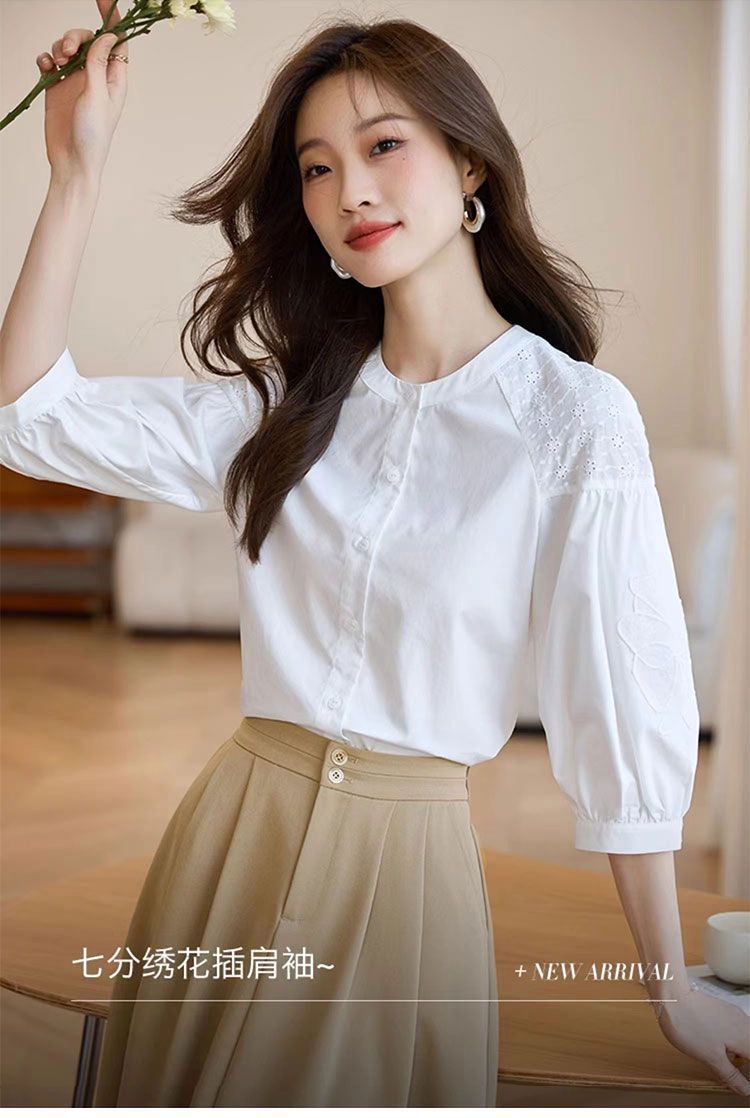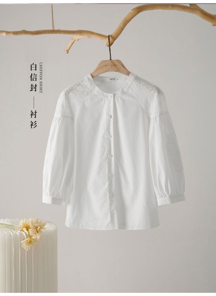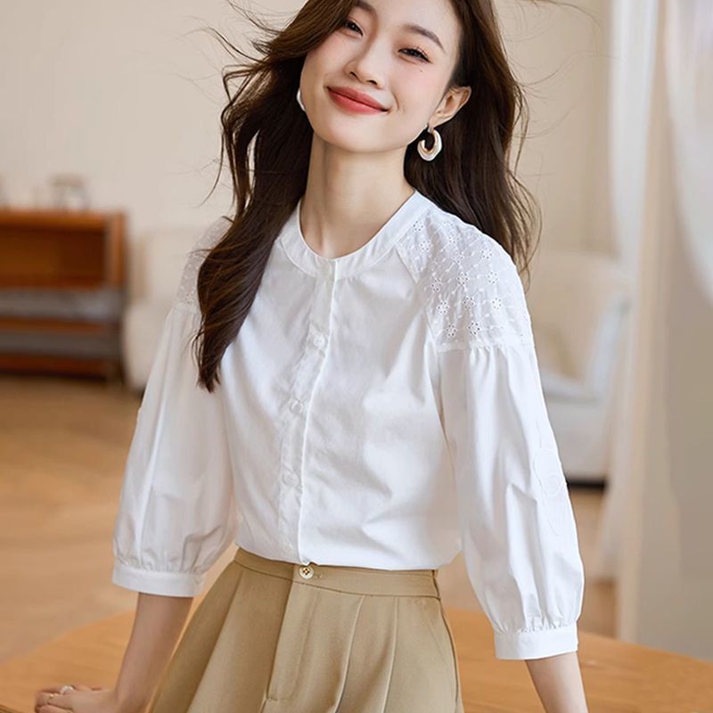 패션 코튼 화이트 세븐 포인트 슬리브 셔츠 여성의 봄과 가을 새로운 느슨한 우아한 모방 텐셀 셔츠