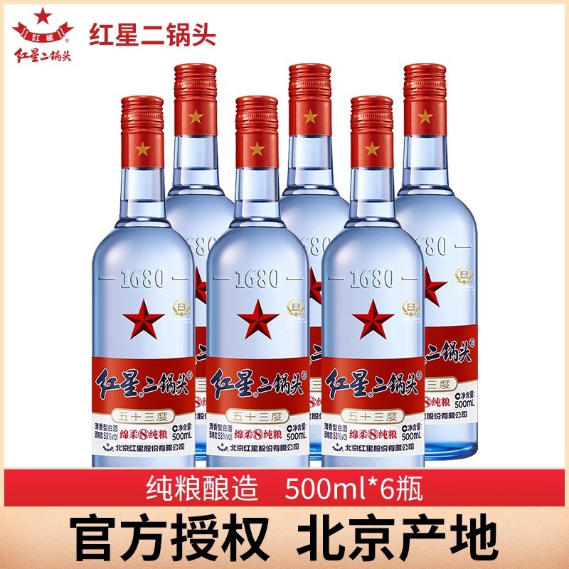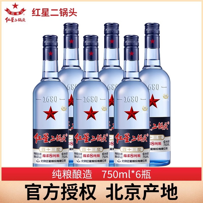 베이징 일반 공장 공식 승인 레드 스타 Erguotou 43/53 블루 병 Mianrou 8 500/750ml 순수 곡물 주류스토어 가기