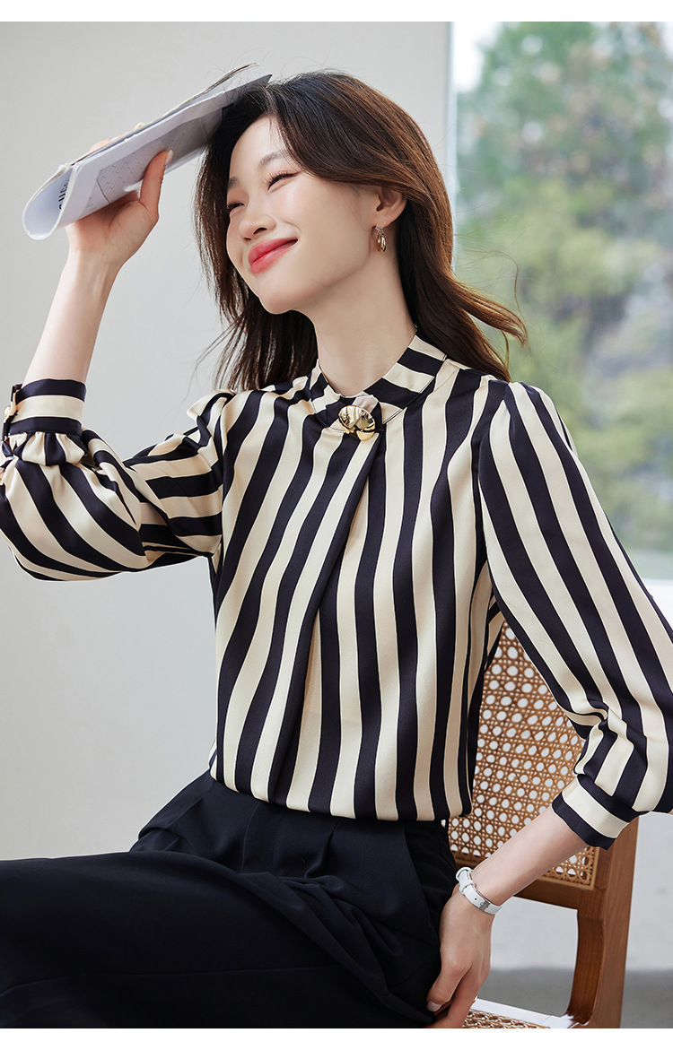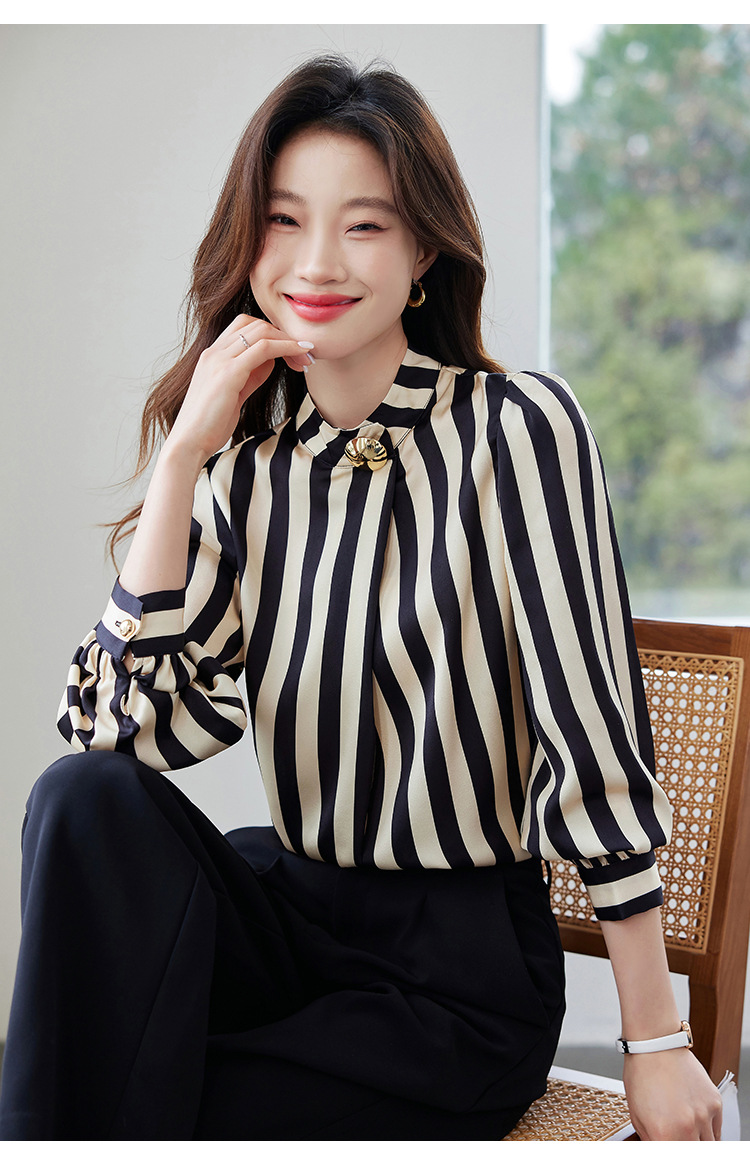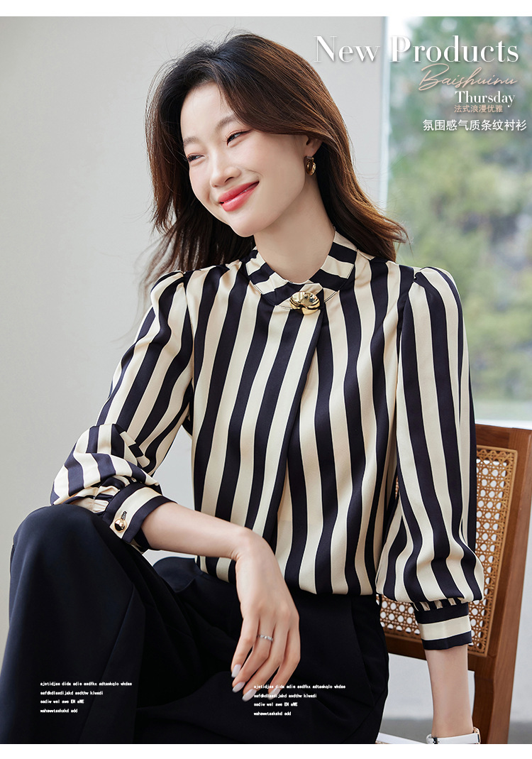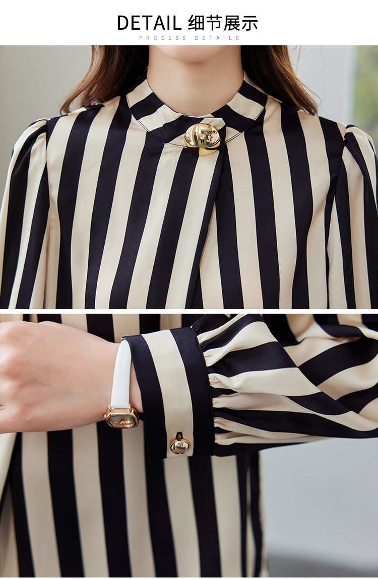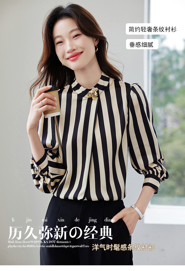 리얼 샷 2025 봄 새로운 하이 엔드 느낌 기질 통근 긴 소매 스탠드 칼라 금속 버튼 스트라이프 셔츠 탑 여성스토어 가기