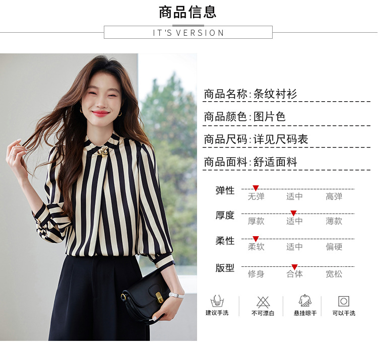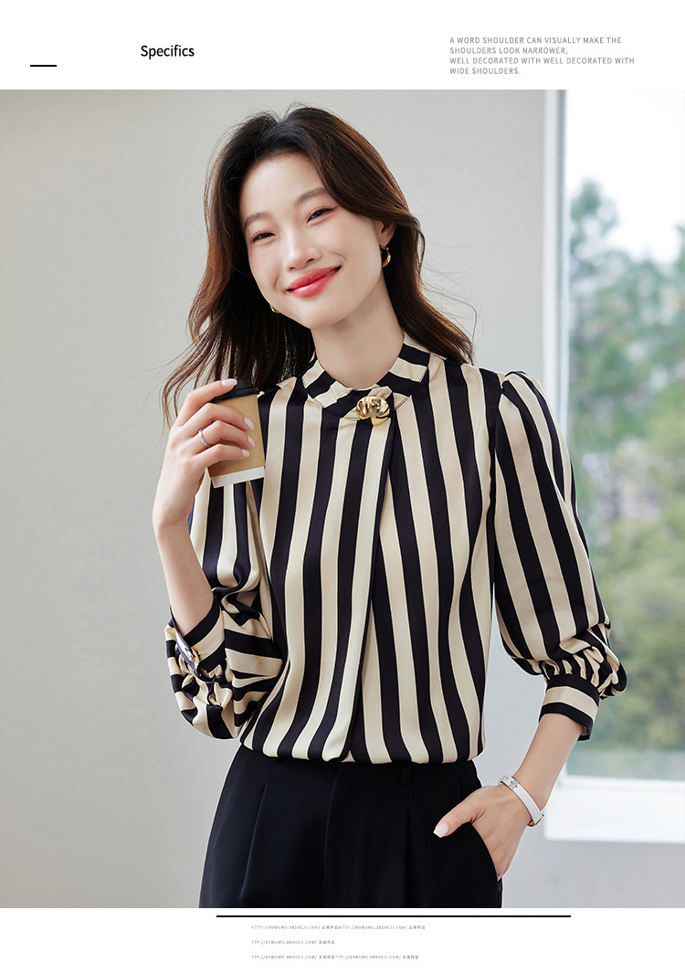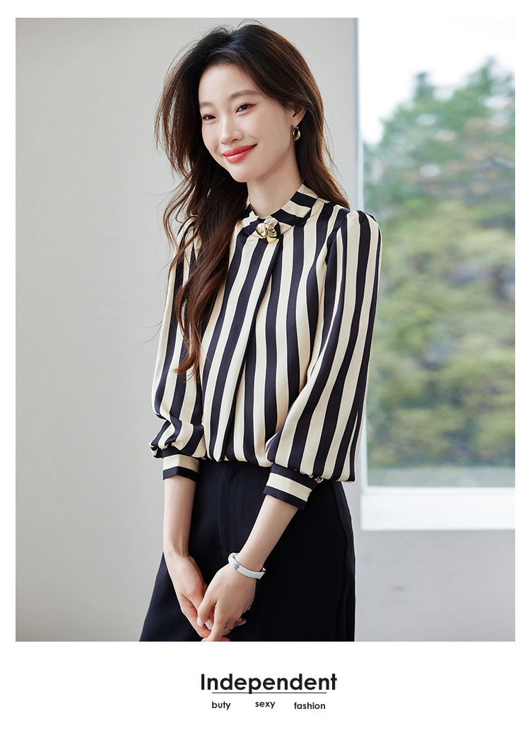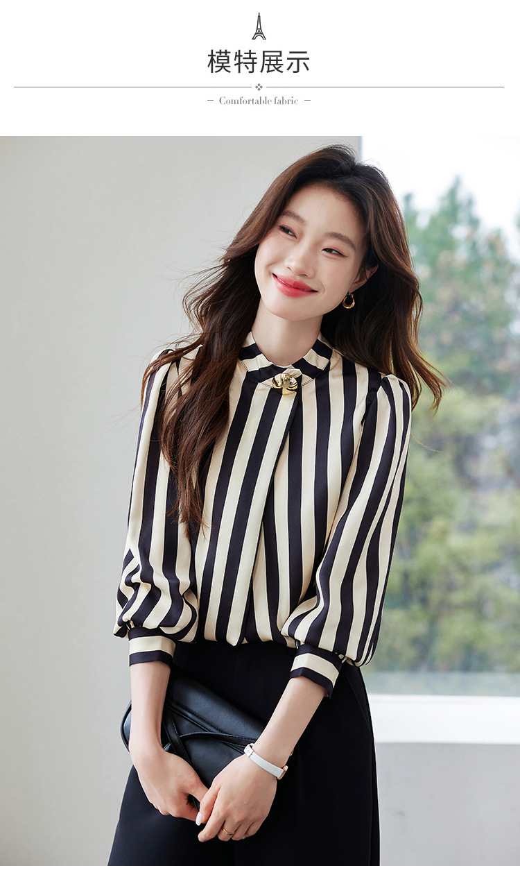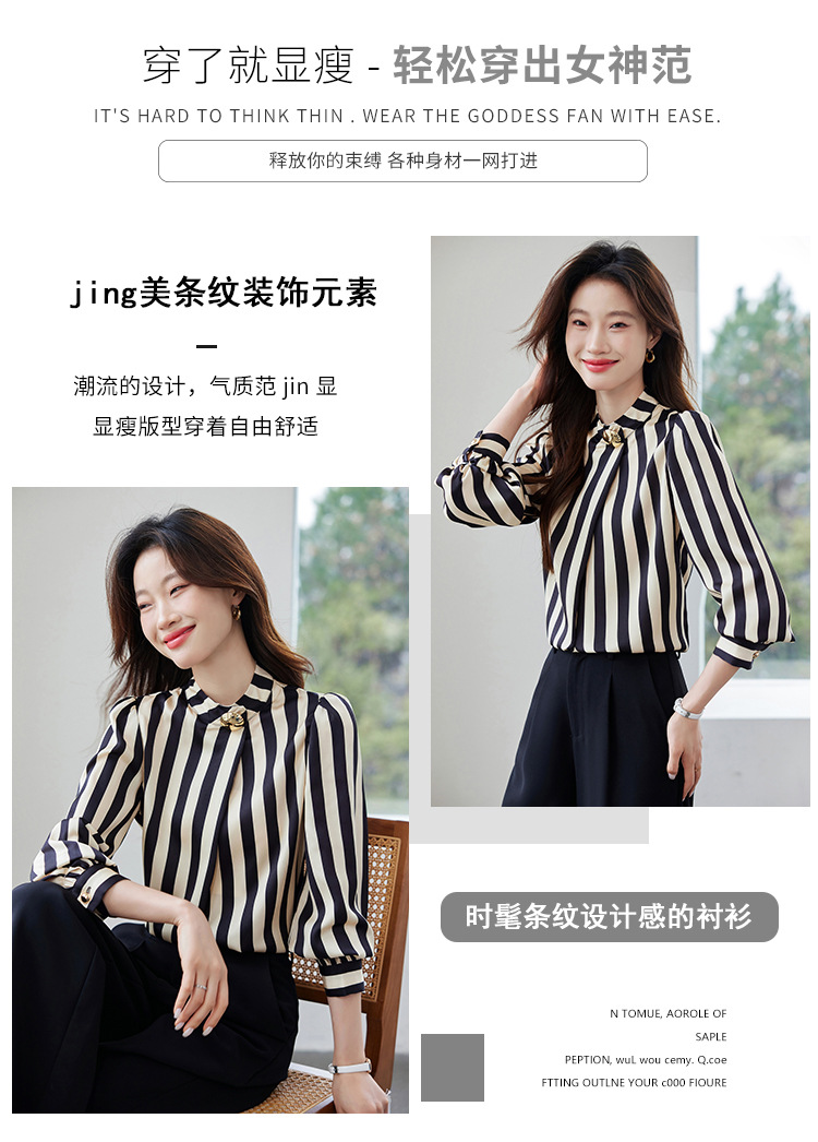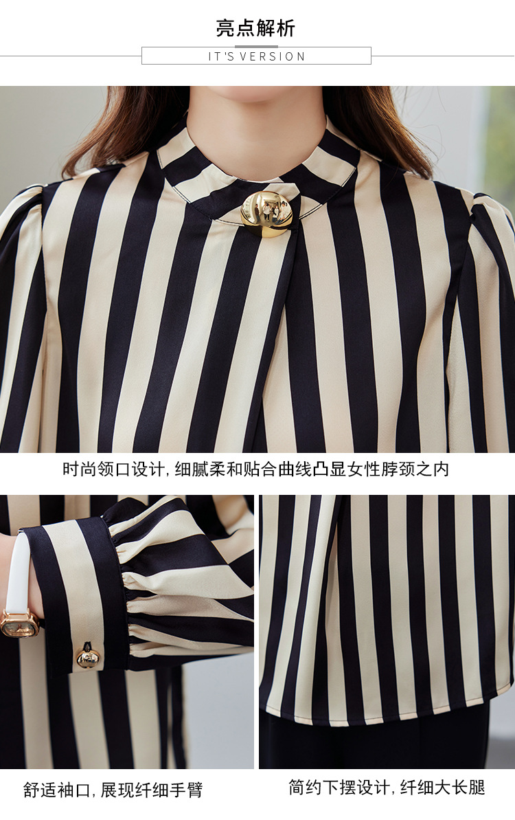 리얼 샷 2025 봄 새로운 하이 엔드 느낌 기질 통근 긴 소매 스탠드 칼라 금속 버튼 스트라이프 셔츠 탑 여성스토어 가기