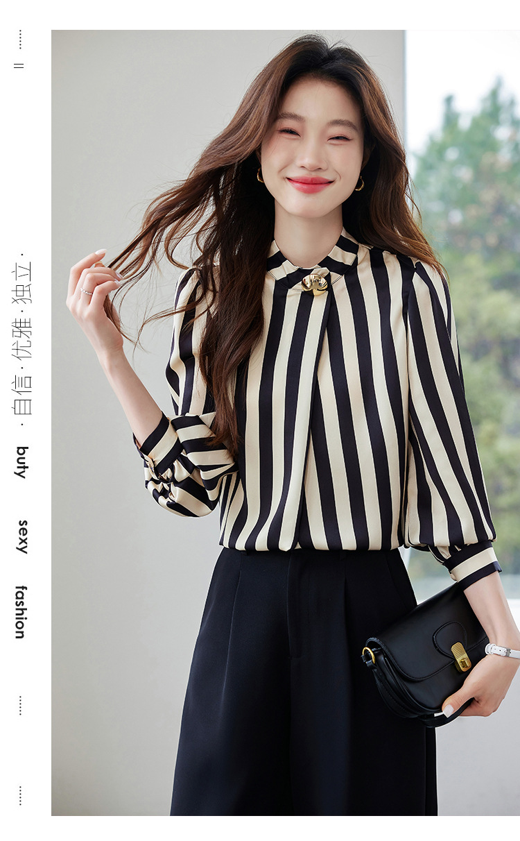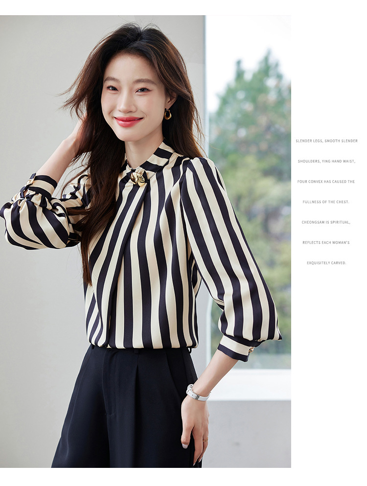 리얼 샷 2025 봄 새로운 하이 엔드 느낌 기질 통근 긴 소매 스탠드 칼라 금속 버튼 스트라이프 셔츠 탑 여성
