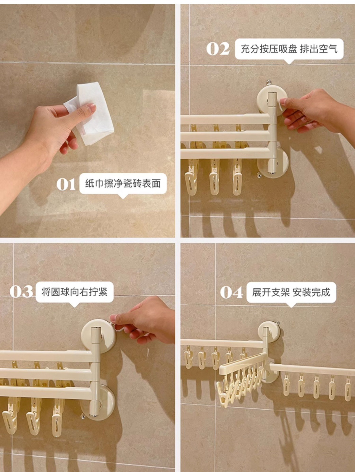 • 흡착컵 의류 건조대 접이식 [4극 28클립] 강력한 클립/흔적 없는 건조