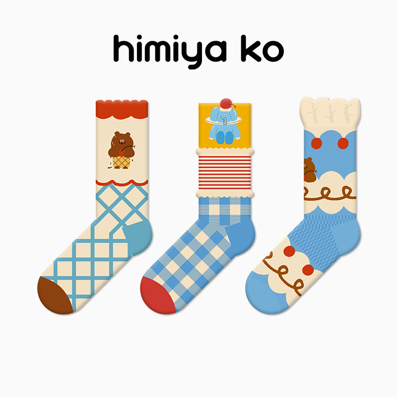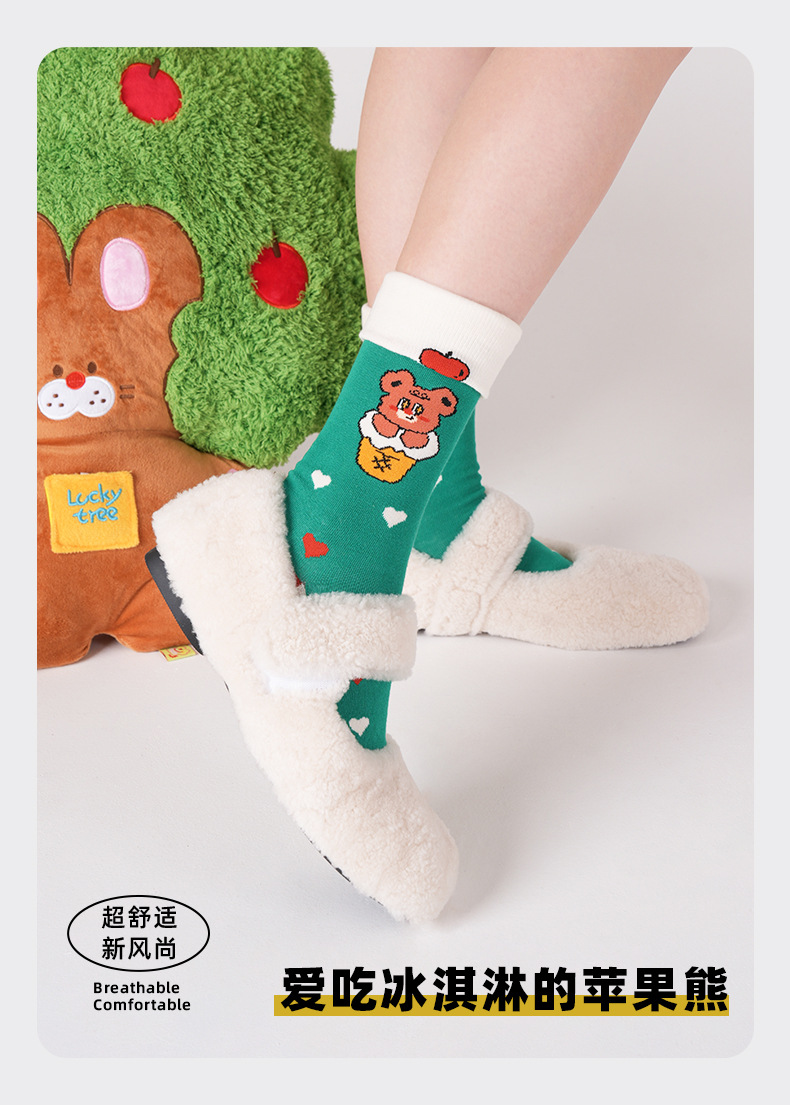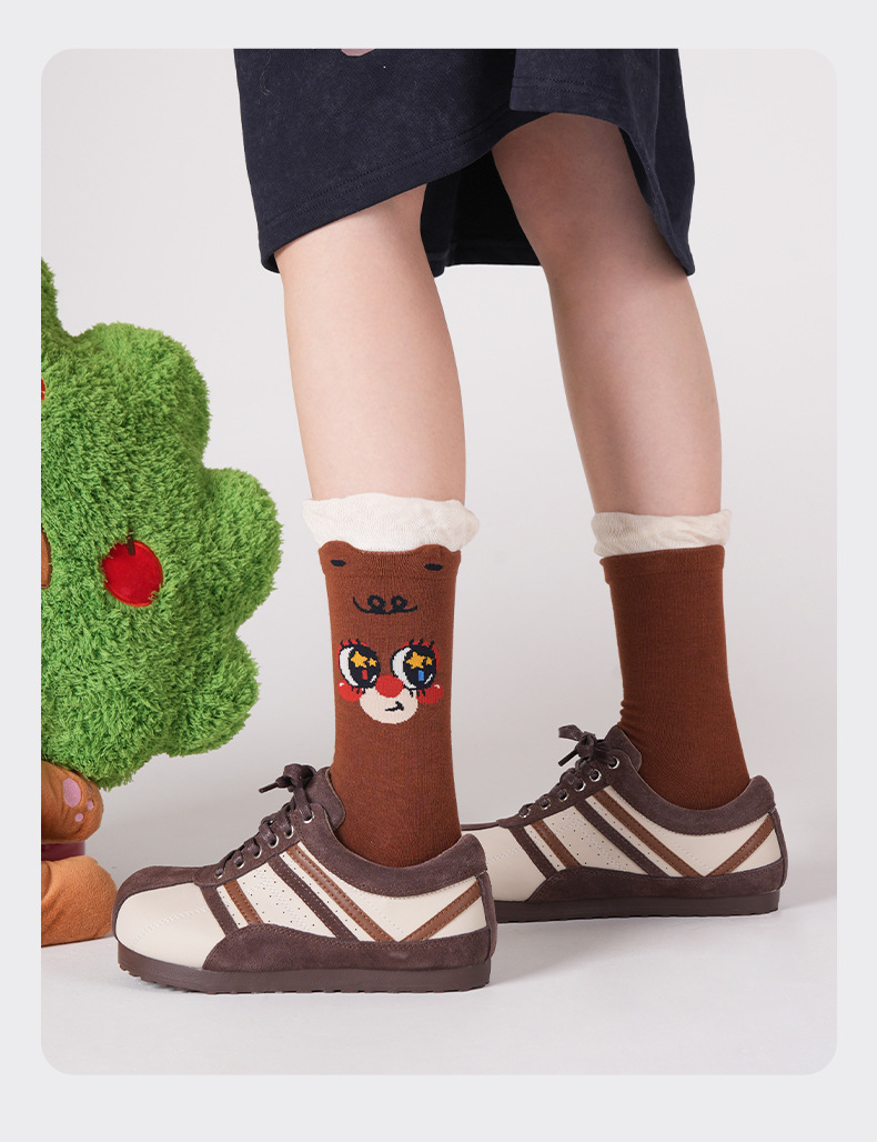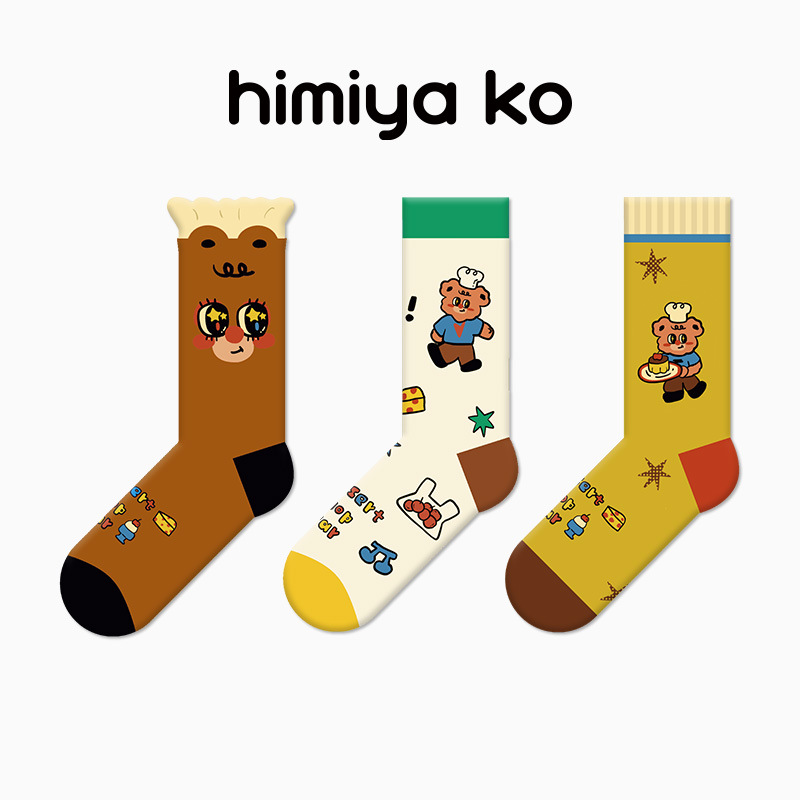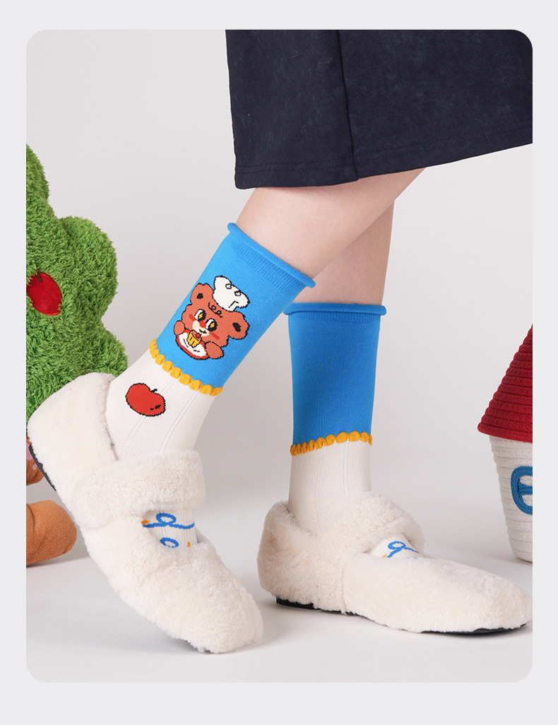 2025 여름 얇은 도파민 조수 양말 귀여운 만화 곰 여성 양말 그림 유리 실크 튜브 양말 통기성 면