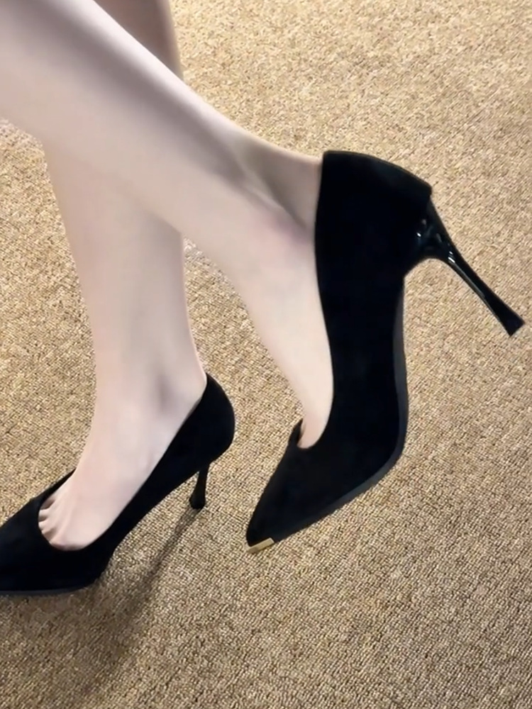 블랙 스웨이드 하이힐 여성 2025 년 봄과 가을 새로운 금속 뾰족한 스틸레토 힐 얕은 입 소시알라이트 우아한 프랑스 스타일 신발스토어 가기