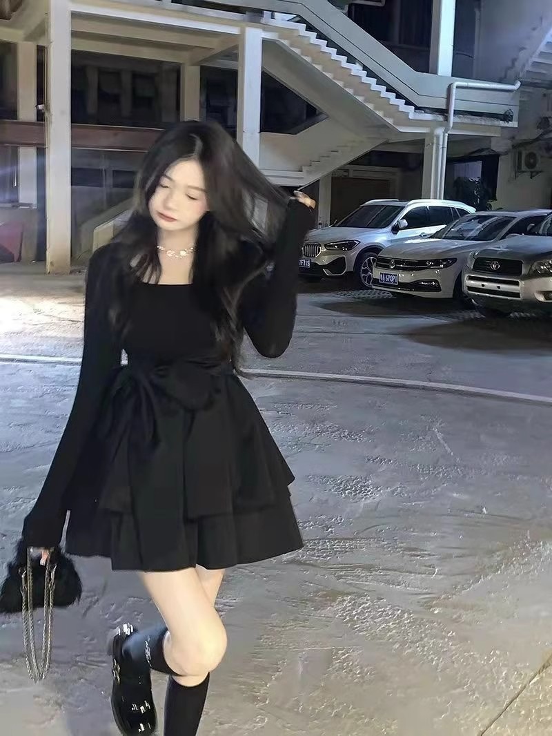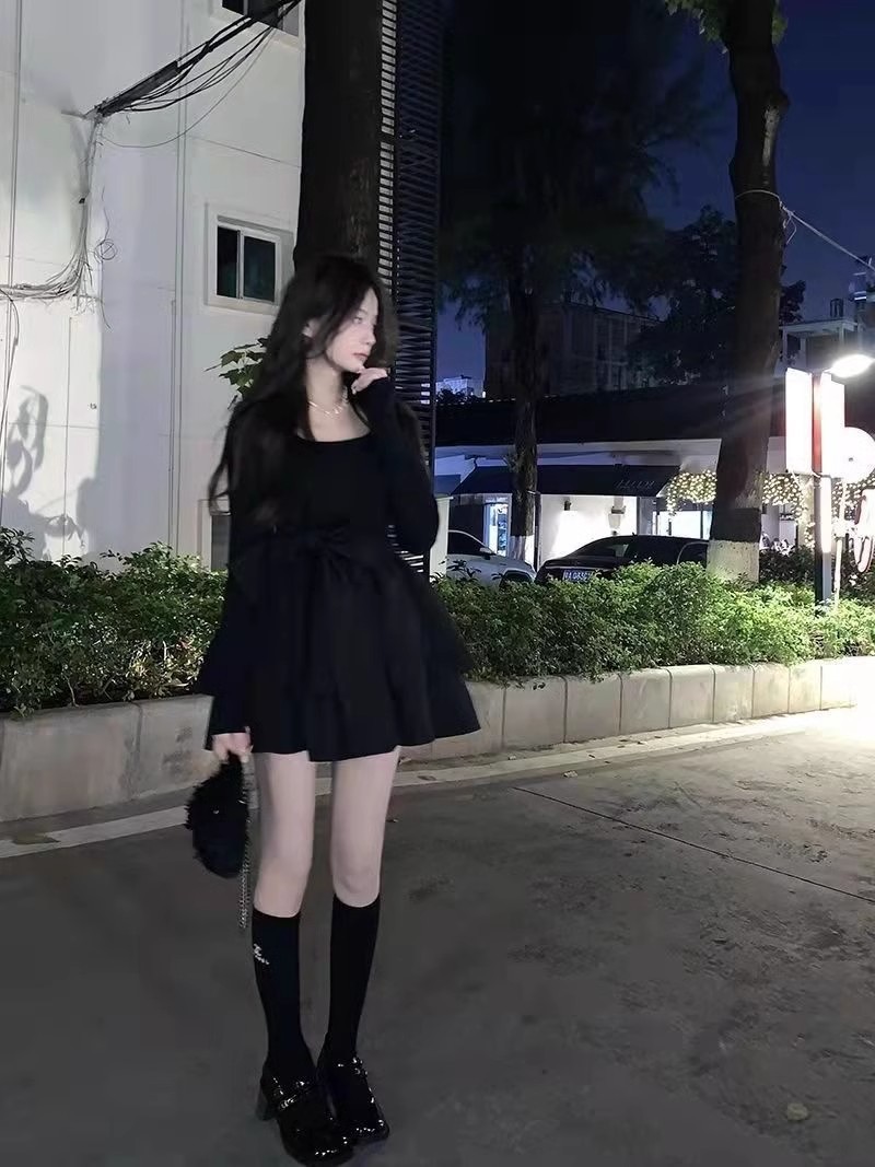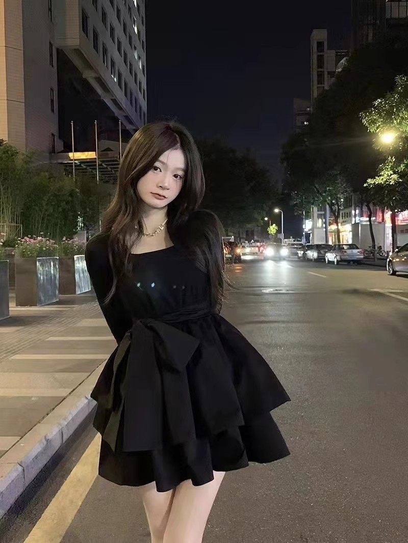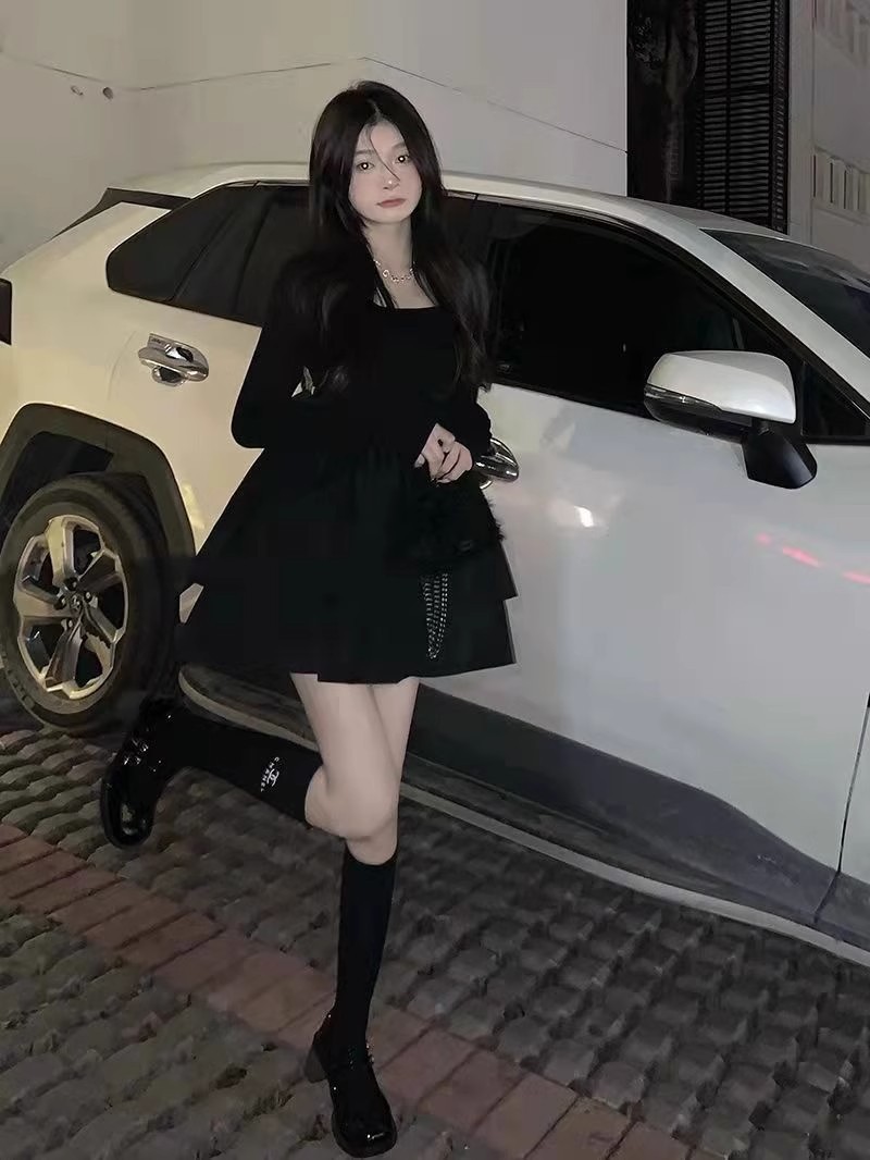 프랑스 스타일 가을과 겨울 여성의 슬림 핏 허리 스퀘어 칼라 틈새 블랙 원피스 우아한 작은 검은 원피스 푹신한 공주 원피스스토어 가기