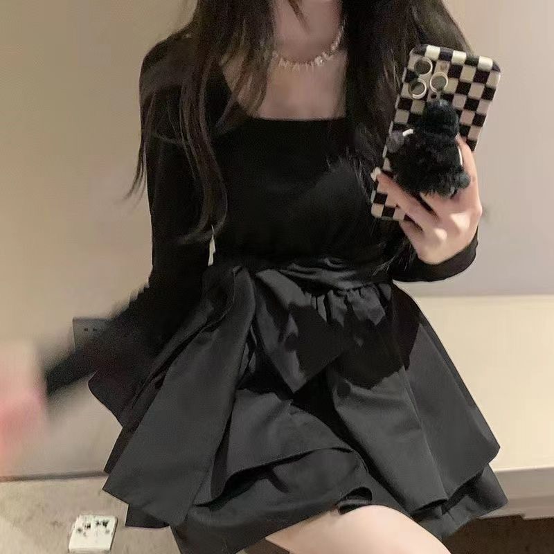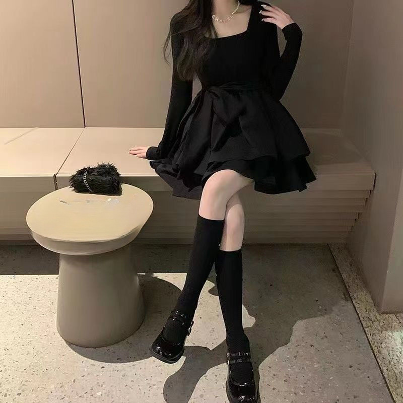 프랑스 스타일 가을과 겨울 여성의 슬림 핏 허리 스퀘어 칼라 틈새 블랙 원피스 우아한 작은 검은 원피스 푹신한 공주 원피스