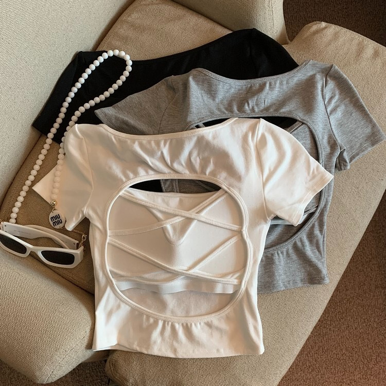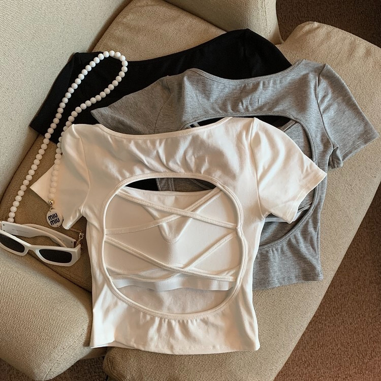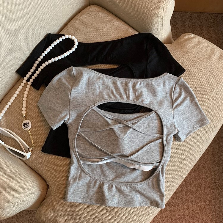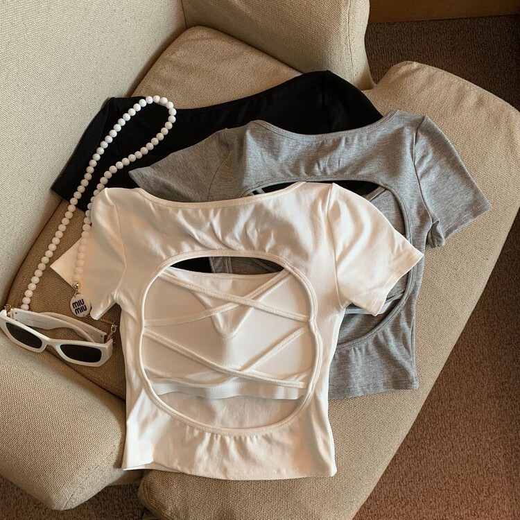 Back Cross Backless Short Sleeve with Chest Pad Women's Summer New Hot Girls 섹시한 슬림 핏 슬리밍 쇼트 탑 티셔츠스토어 가기