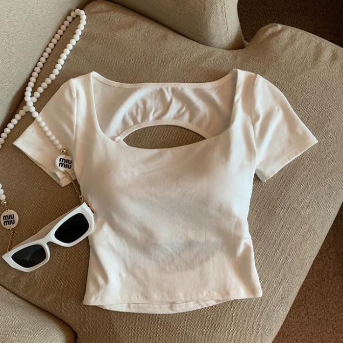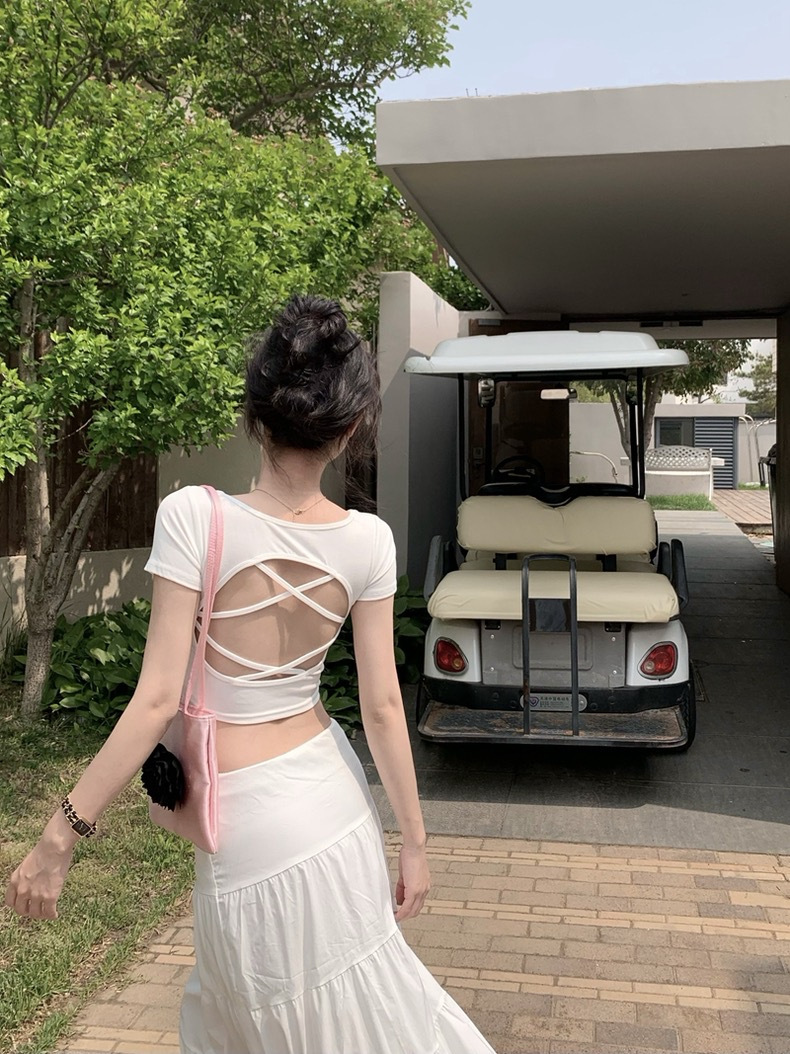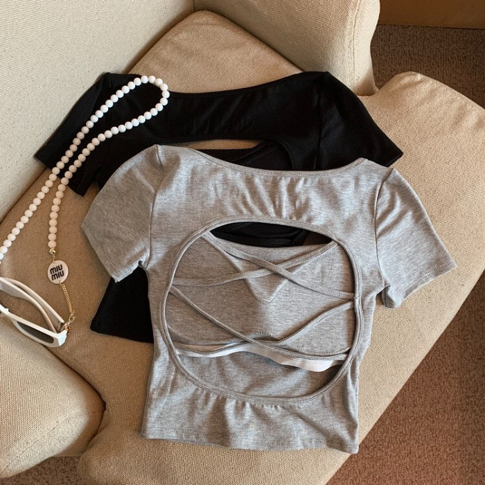 Back Cross Backless Short Sleeve with Chest Pad Women's Summer New Hot Girls 섹시한 슬림 핏 슬리밍 쇼트 탑 티셔츠
