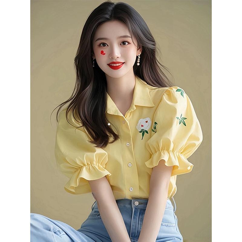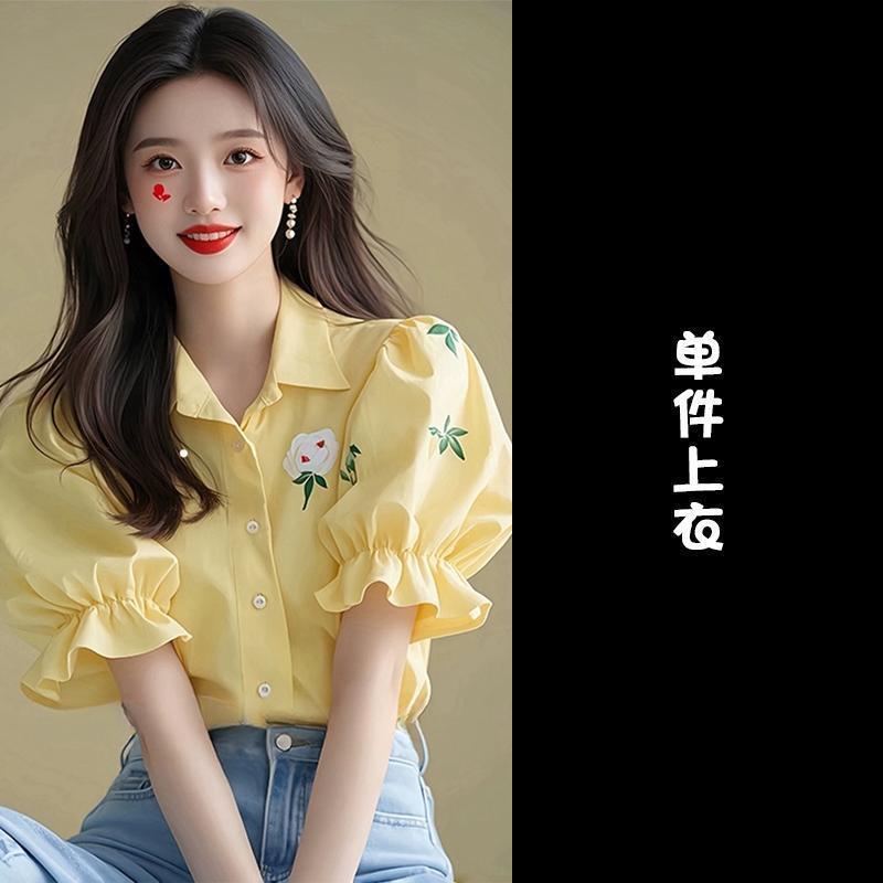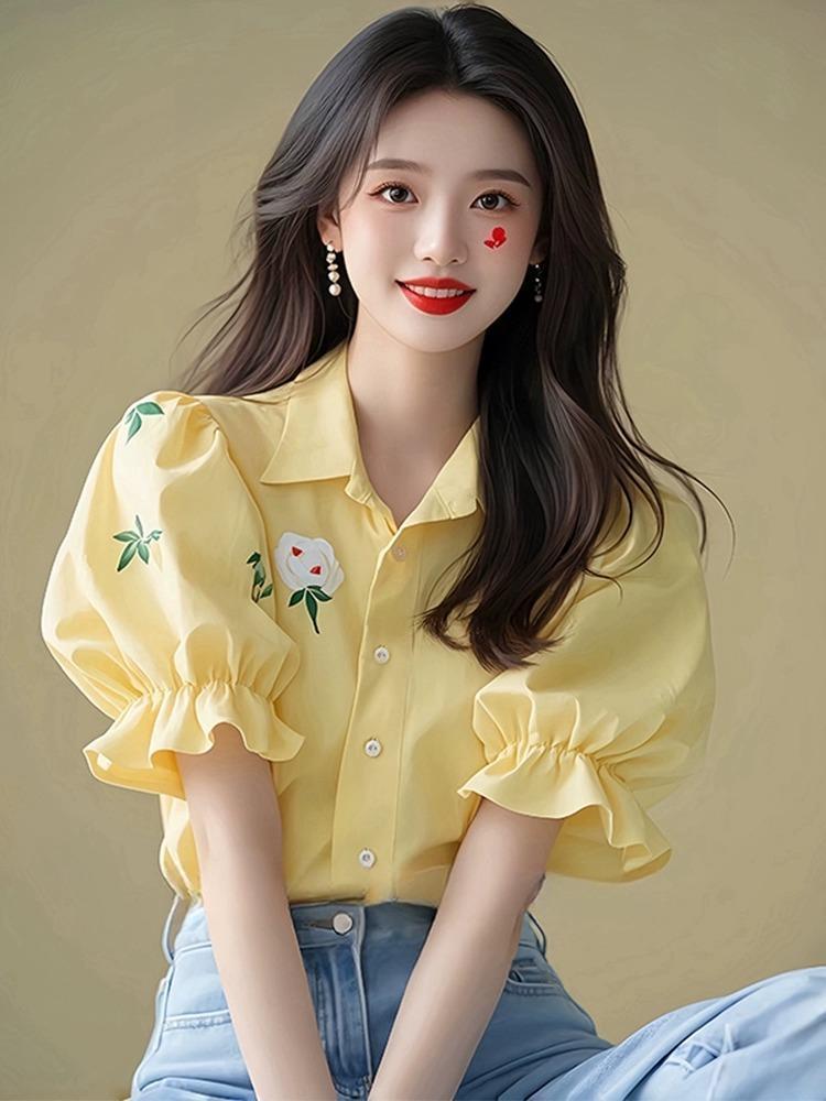올해 인기있는 아름다운 우유 노란색 버블 슬리브 프린트 셔츠 여성 여름 패션 외국 스타일의 하이 엔드 반팔 탑스토어 가기