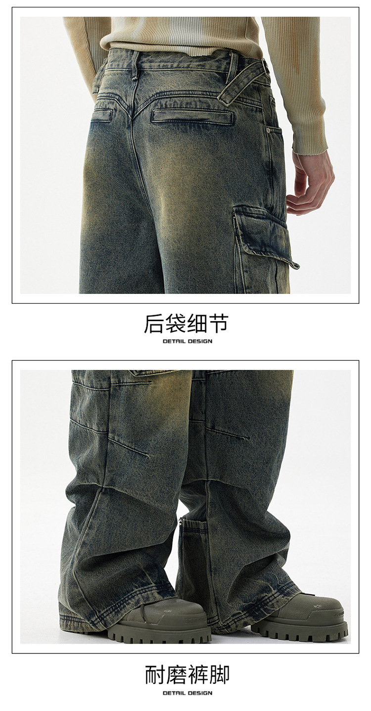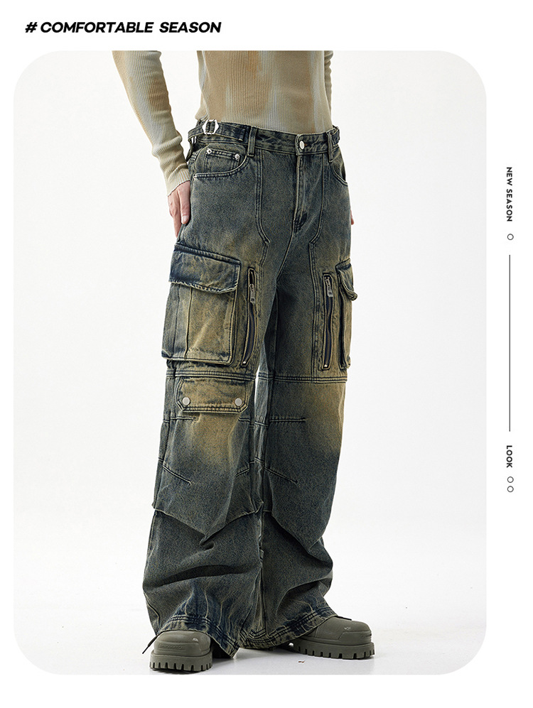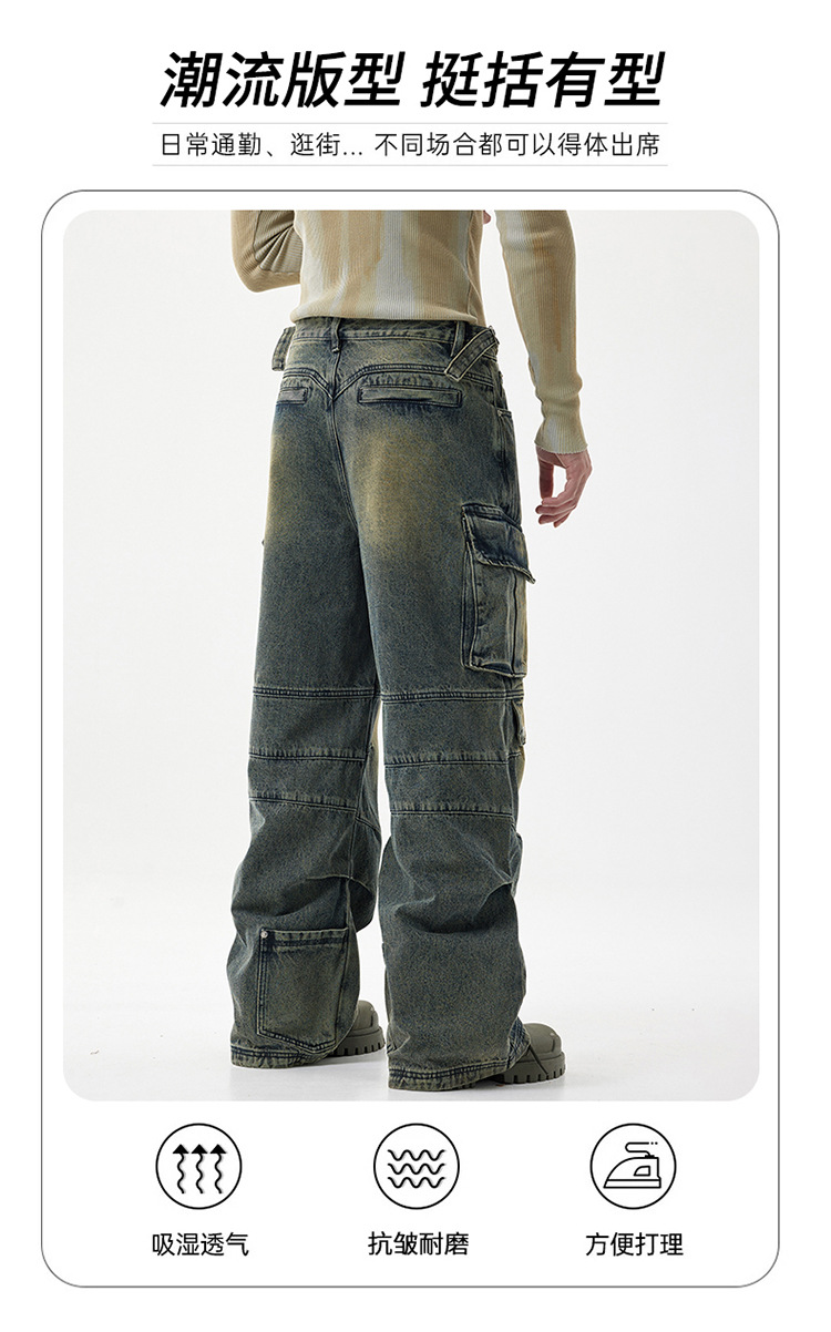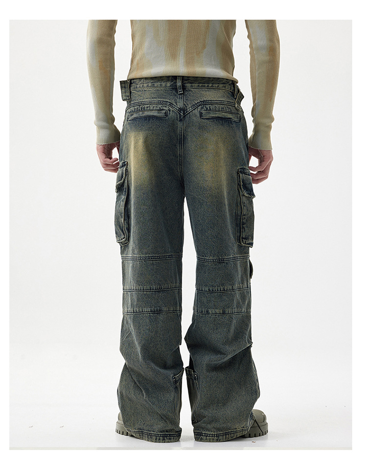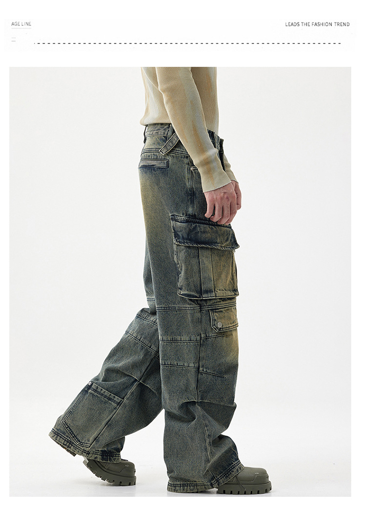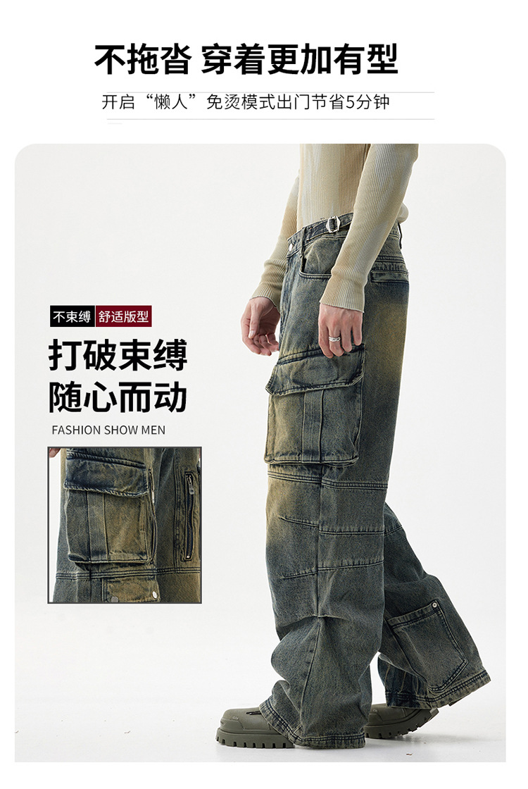 아메리칸 스타일 하이 스트리트 스트레이트 다리 청바지 남성 가을 패션 브랜드 레트로 멀티 포켓 작업 바지 무거운 느슨한 넓은 다리 바지스토어 가기