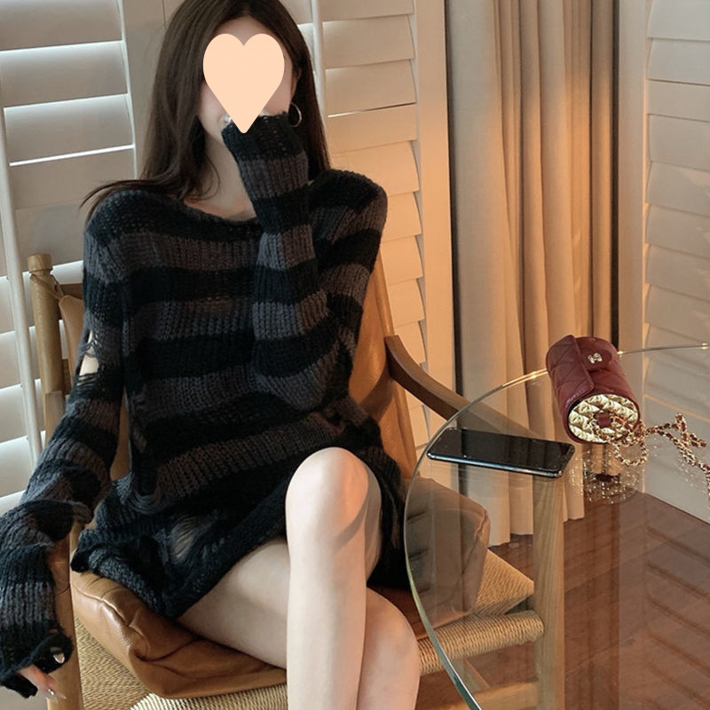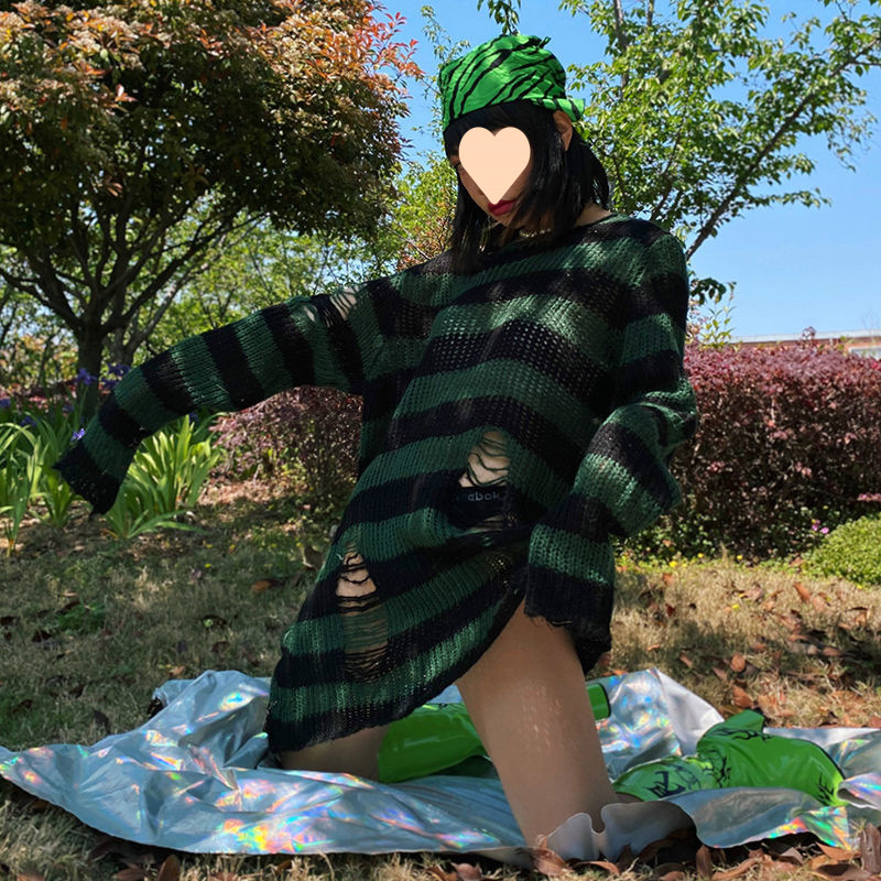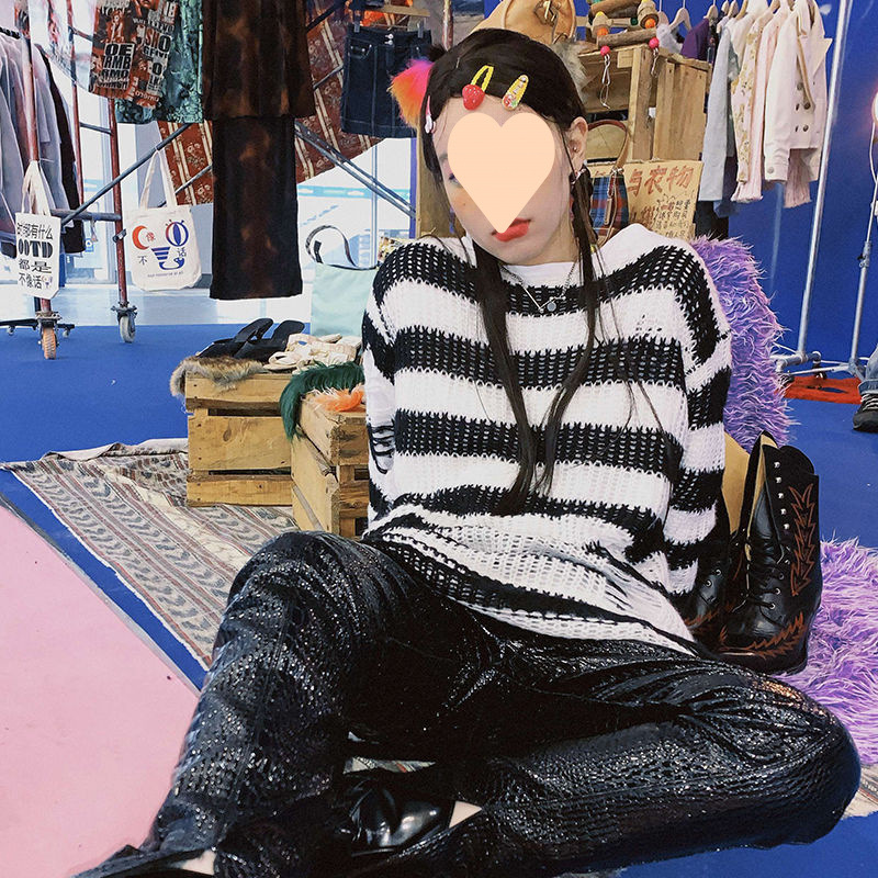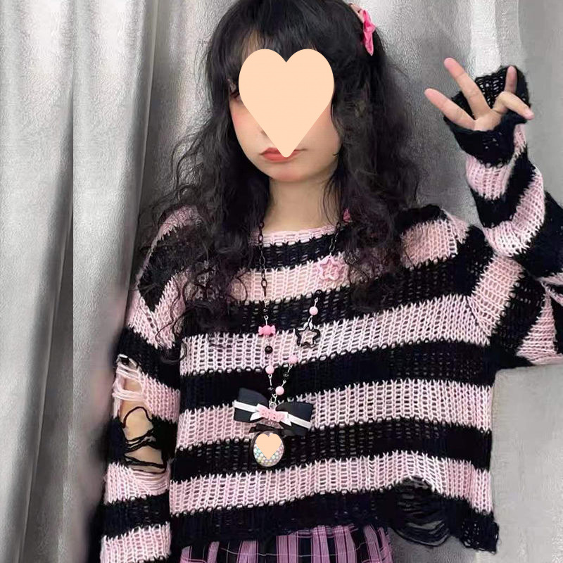 시부야 스파이스 스타일 2 Qianxi 성격 달콤한 쿨 홀 할로우 디자인 센스 대비 컬러 스트라이프 니트 펑크 스타일
