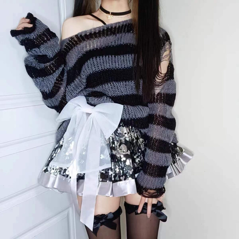 시부야 스파이스 스타일 2 Qianxi 성격 달콤한 쿨 홀 할로우 디자인 센스 대비 컬러 스트라이프 니트 펑크 스타일스토어 가기