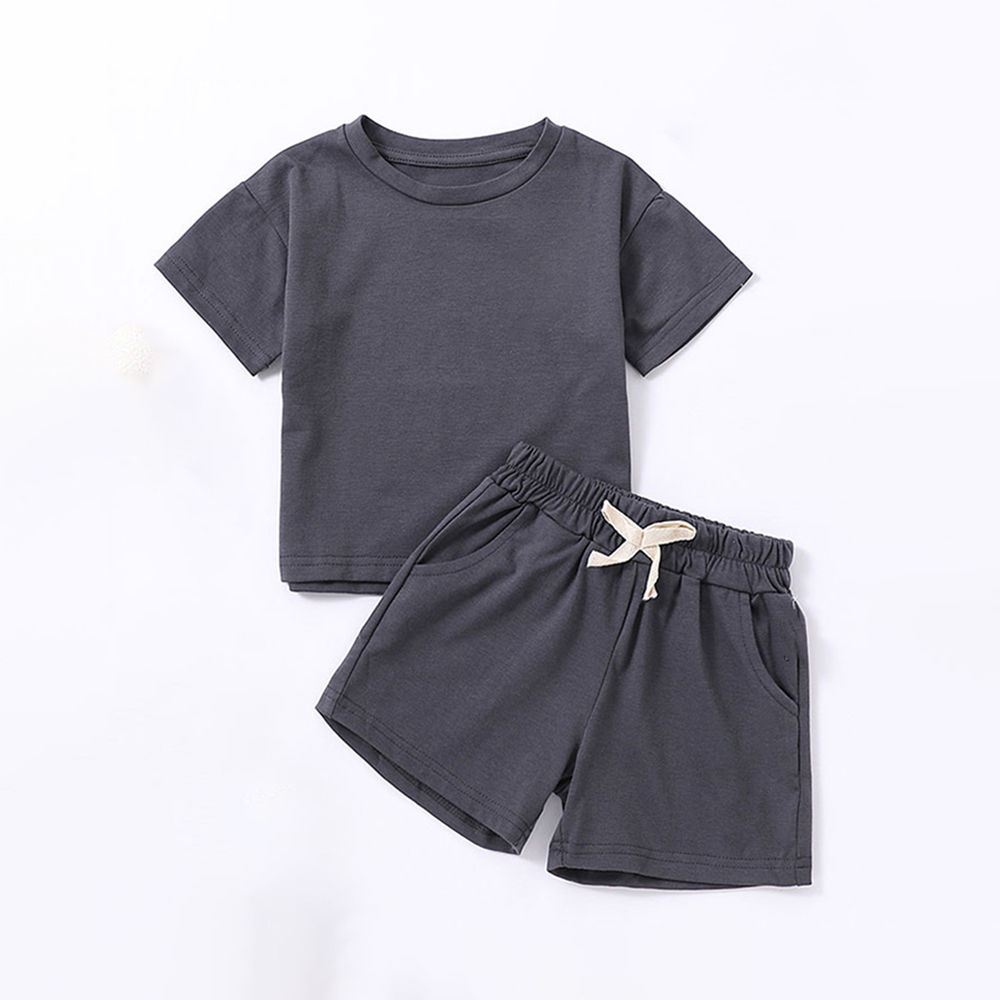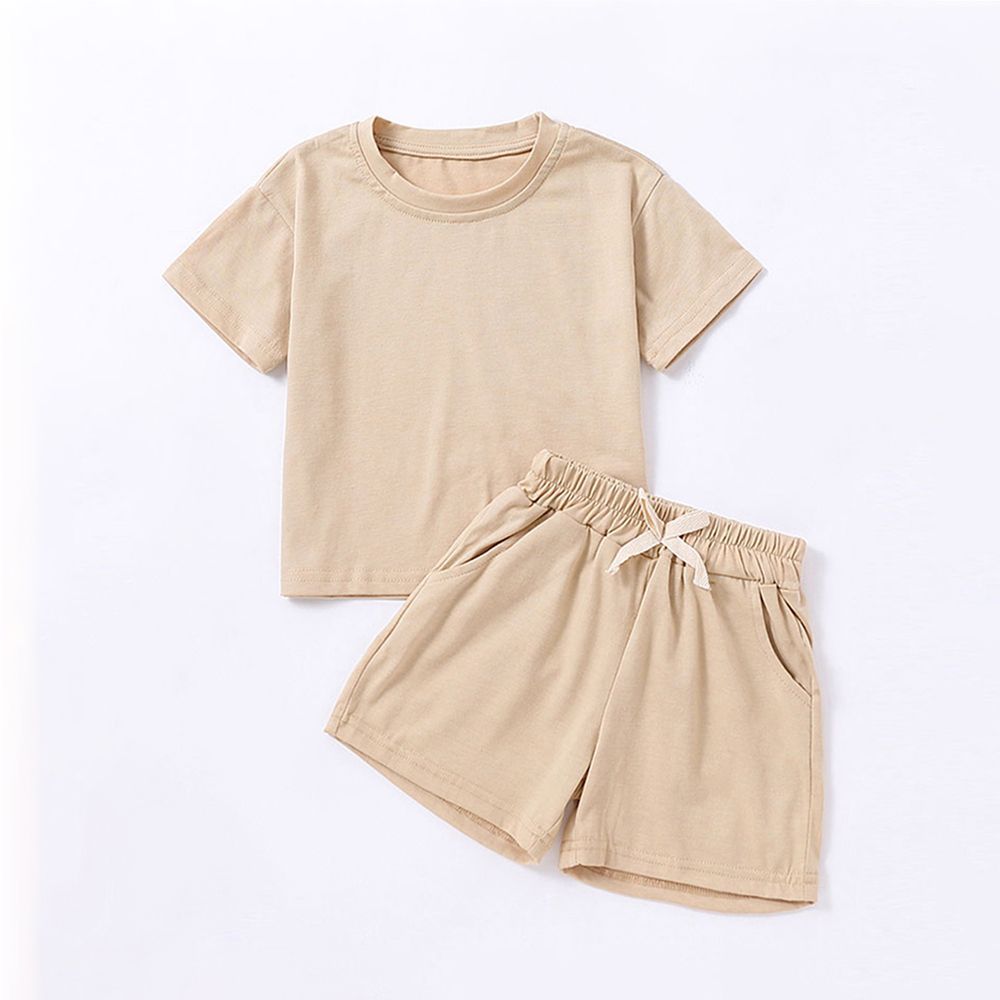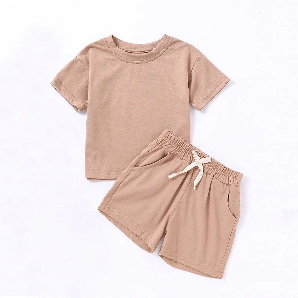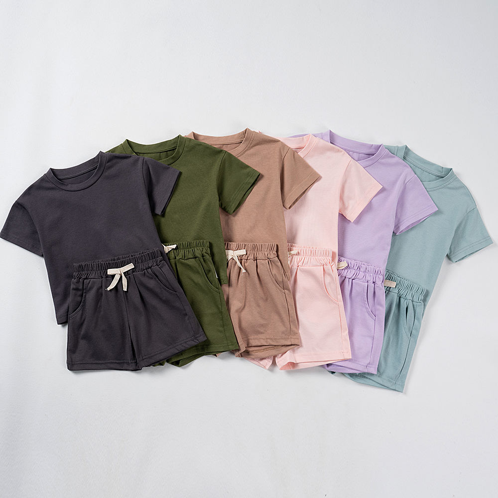 새로운 핫 어린이 여름 퓨어 코튼 심플 솔리드 컬러 반팔 티셔츠 반바지 투피스 캐주얼 스포츠 스타일