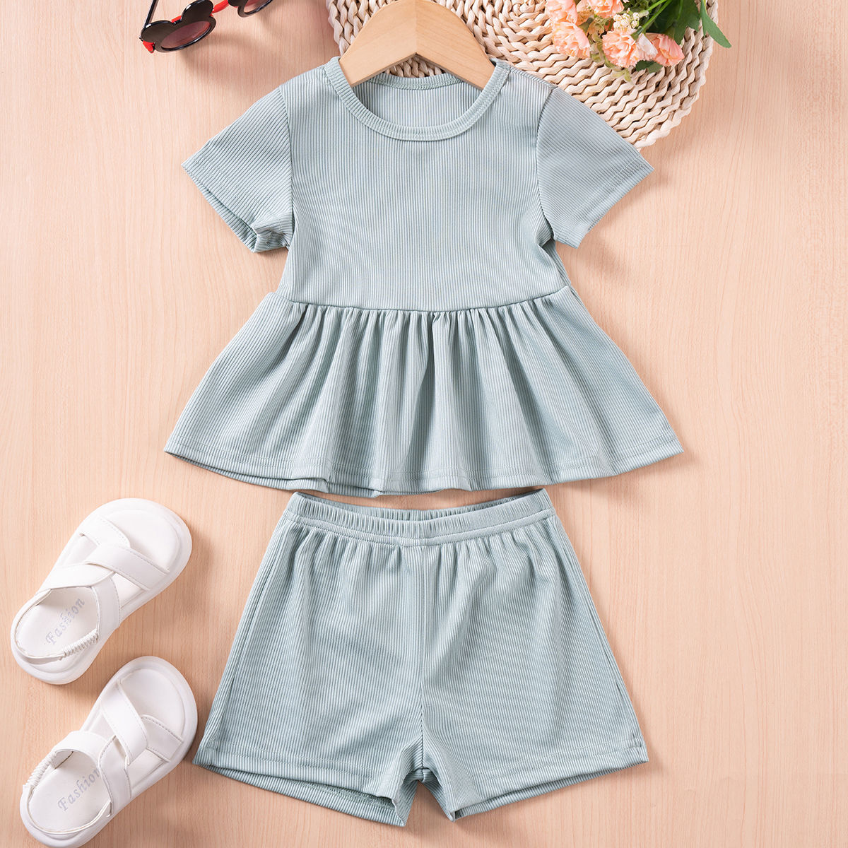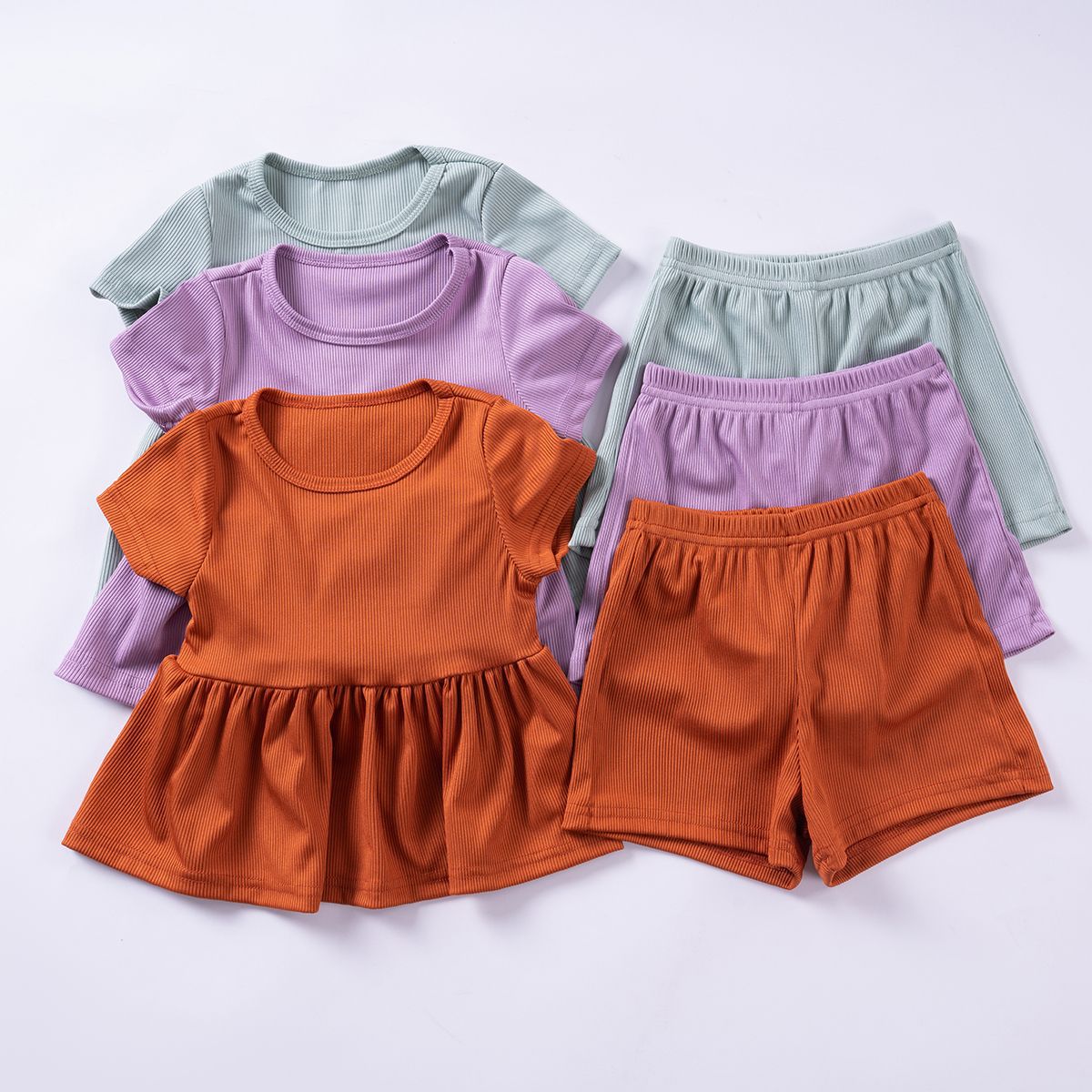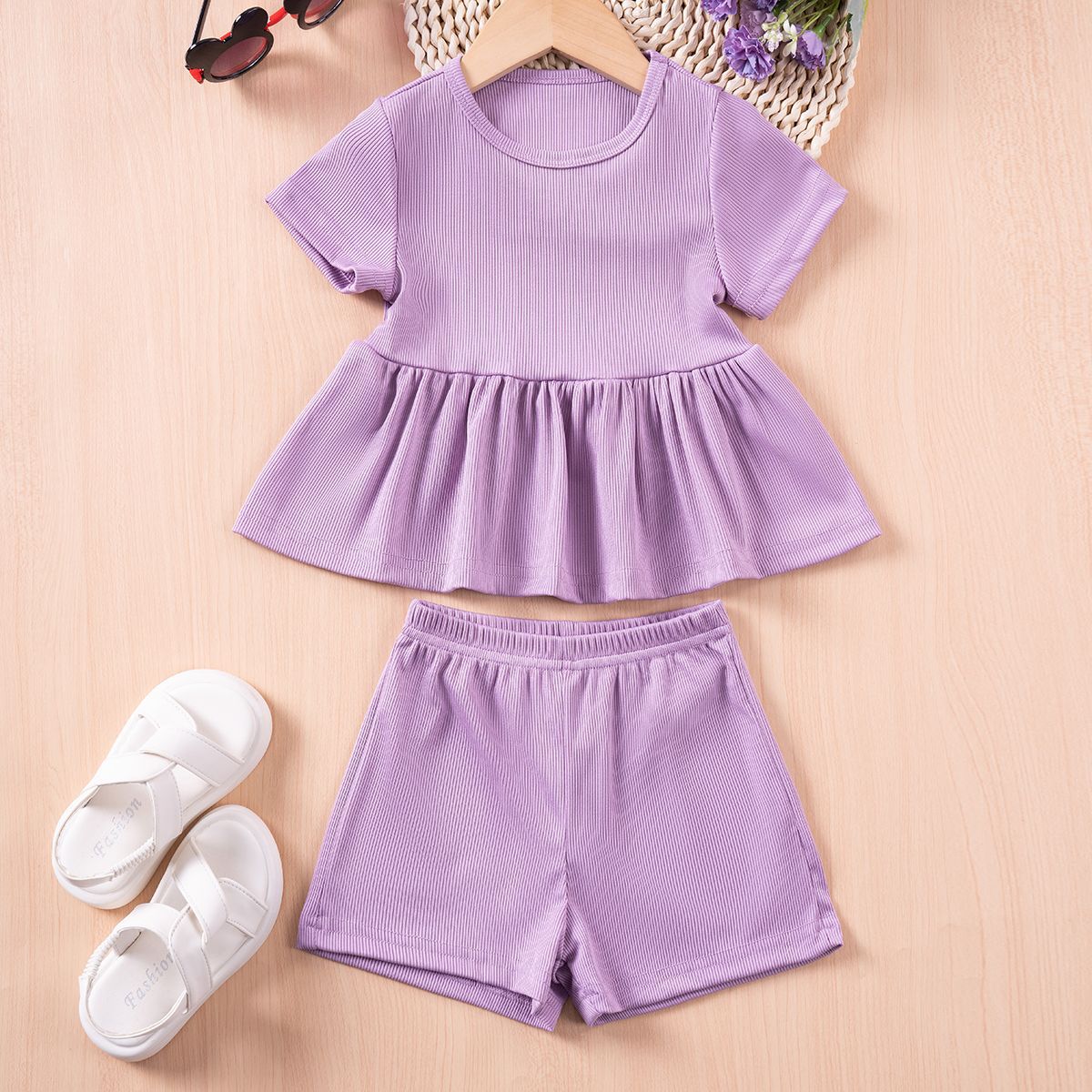 새로운 소녀 반팔 세트 얇은 단색 아동복 러플 탑 스타일 아기 반팔 반바지 투피스 세트