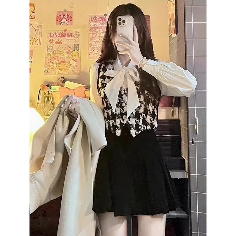 가을과 겨울 2024 여성용 차 스타일 착용 플러스 사이즈 센스 이른 봄 셔츠 조끼 원피스 샤넬 스타일 세트