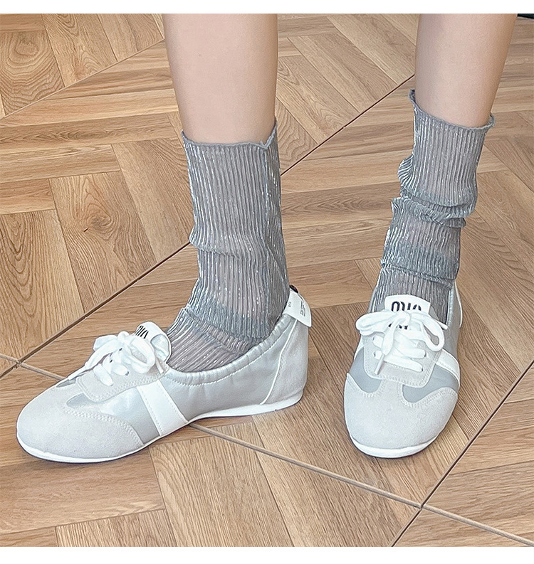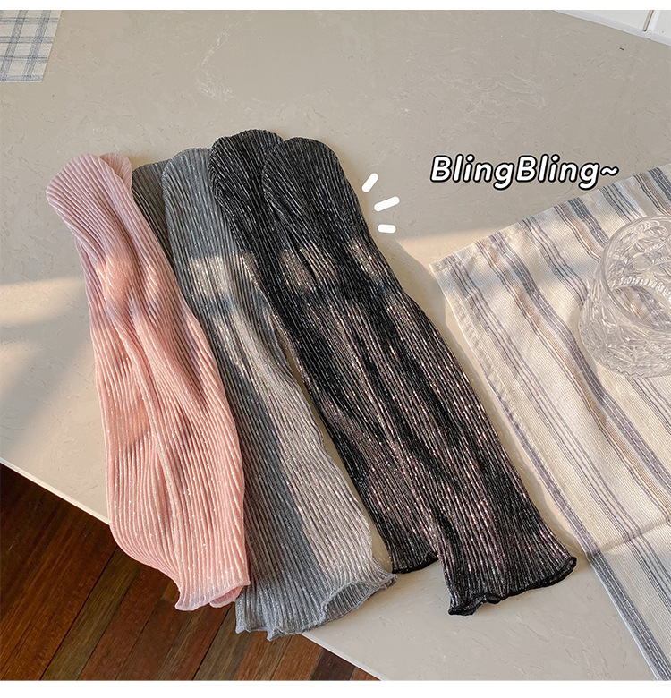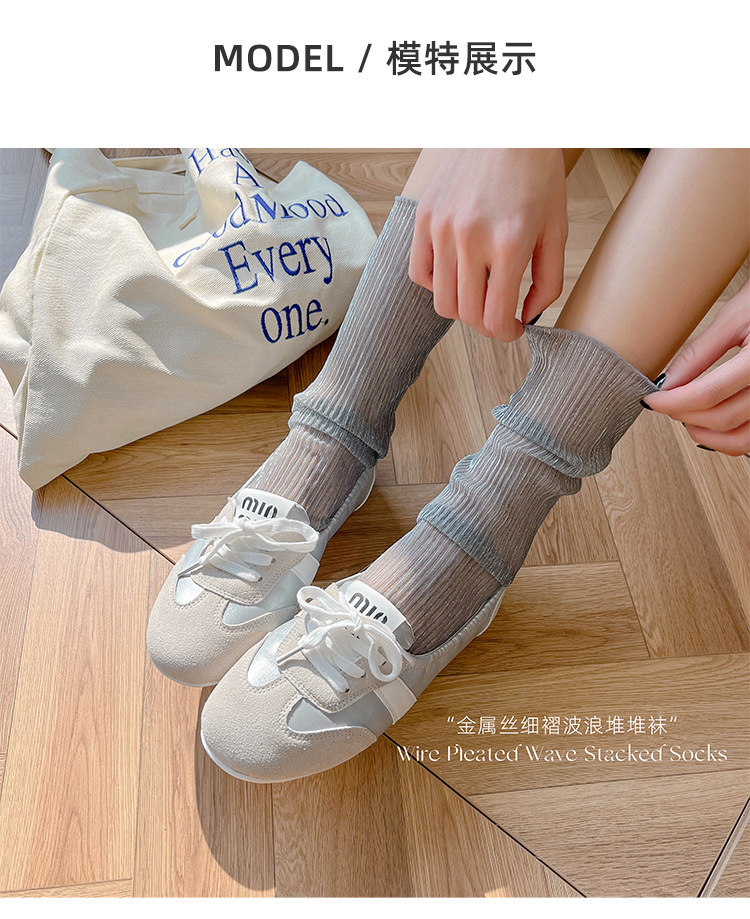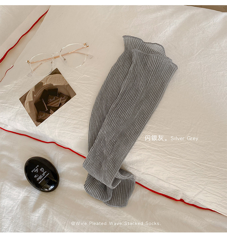 금속 와이어 주름 물결 모양의 가장자리 쌓인 양말 금속 광택 고급 고급 섬세한 피부 친화적 인 실크 양말 여성의 봄과 여름 얇은