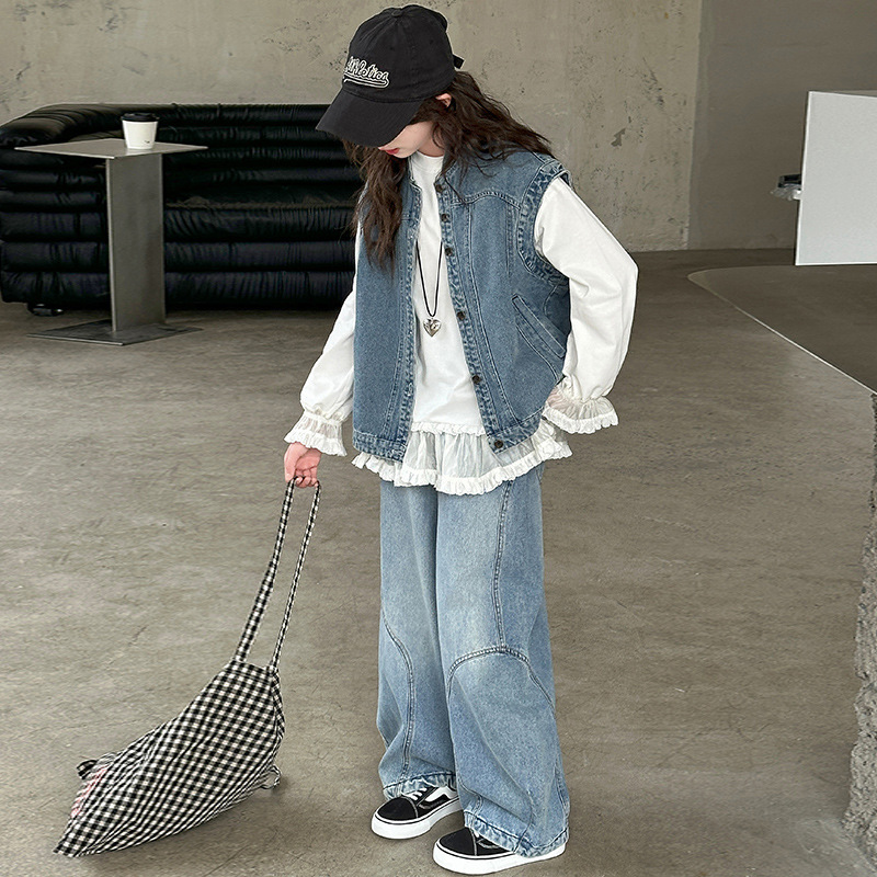 2025 데님 조끼 봄과 가을 유행 외국 스타일 소녀 유행 세 조각 세트 새로운 세트 소녀 레이스 베이스 셔츠스토어 가기