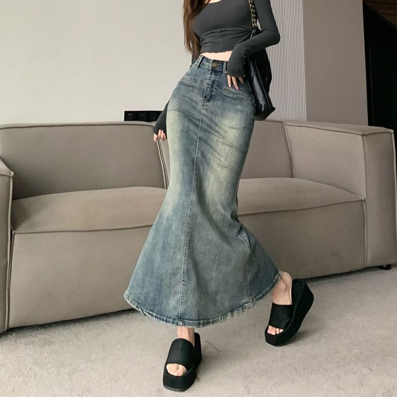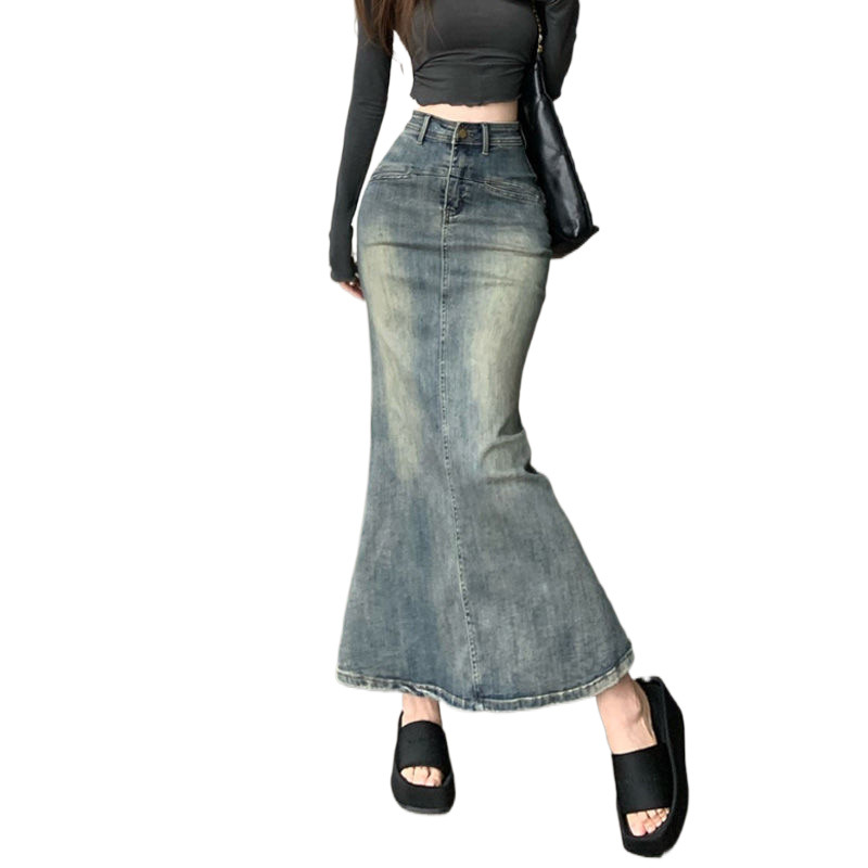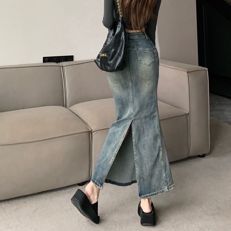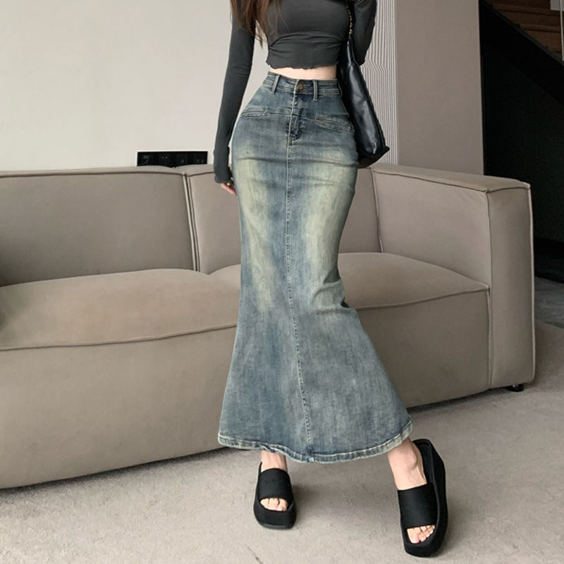 2024 봄과 가을 새로운 레트로 블루 높은 허리 엉덩이 피쉬 테일 데님 스커트 여성 슬리밍 중간 길이 분할 원피스스토어 가기