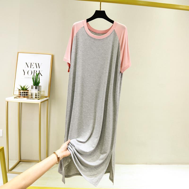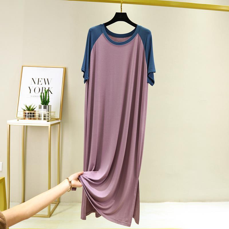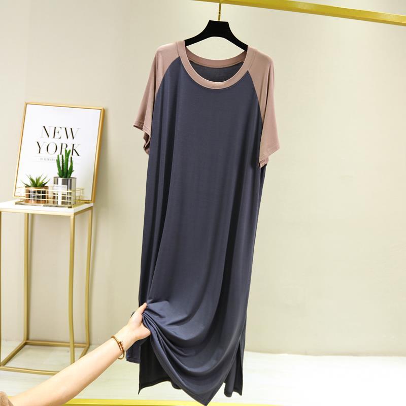 여성용 여름 느슨한 플러스 사이즈 둥근 목 캐주얼 짧은 소매 원피스 얇은 기지 분할 긴 원피스스토어 가기