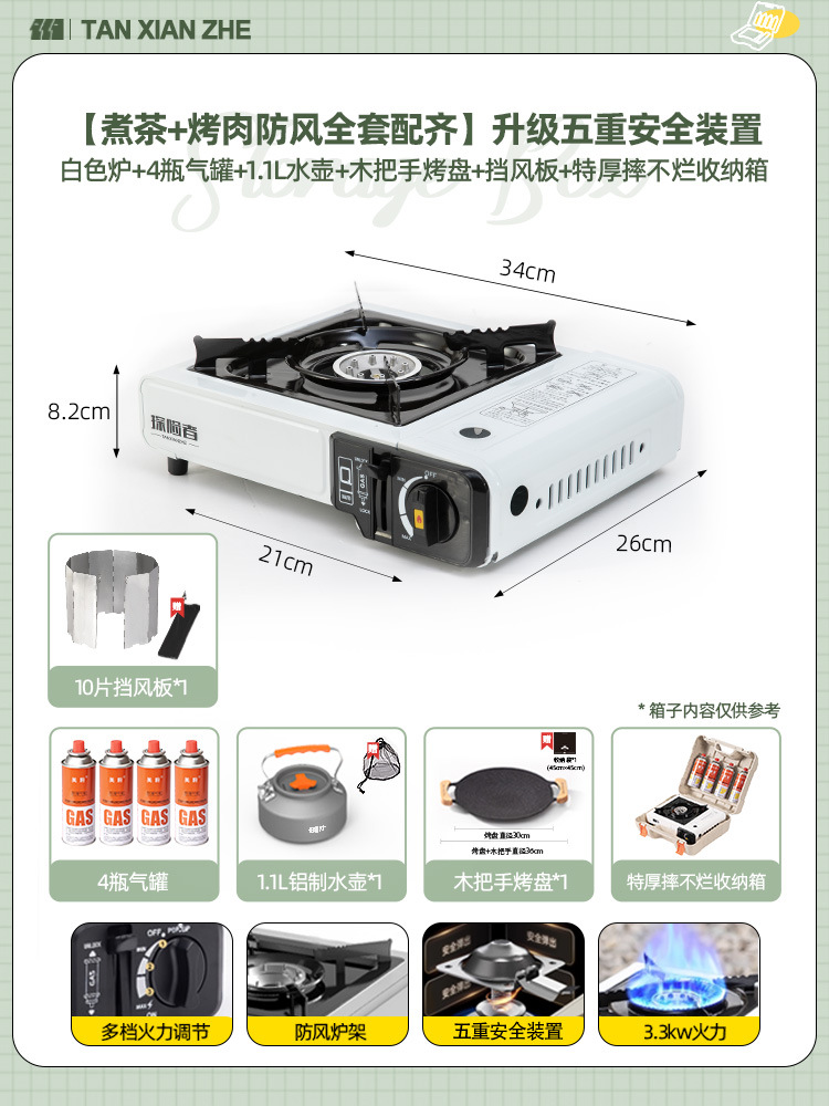• [차 끓이기 + 바비큐 방풍완비] 업그레이드된 5중 안전 화이트 스토브 + 수입 가스탱크 4병 + 1.1L 주전자 + 나무 손잡이 바비큐 접시 + 바람막이 + 특수