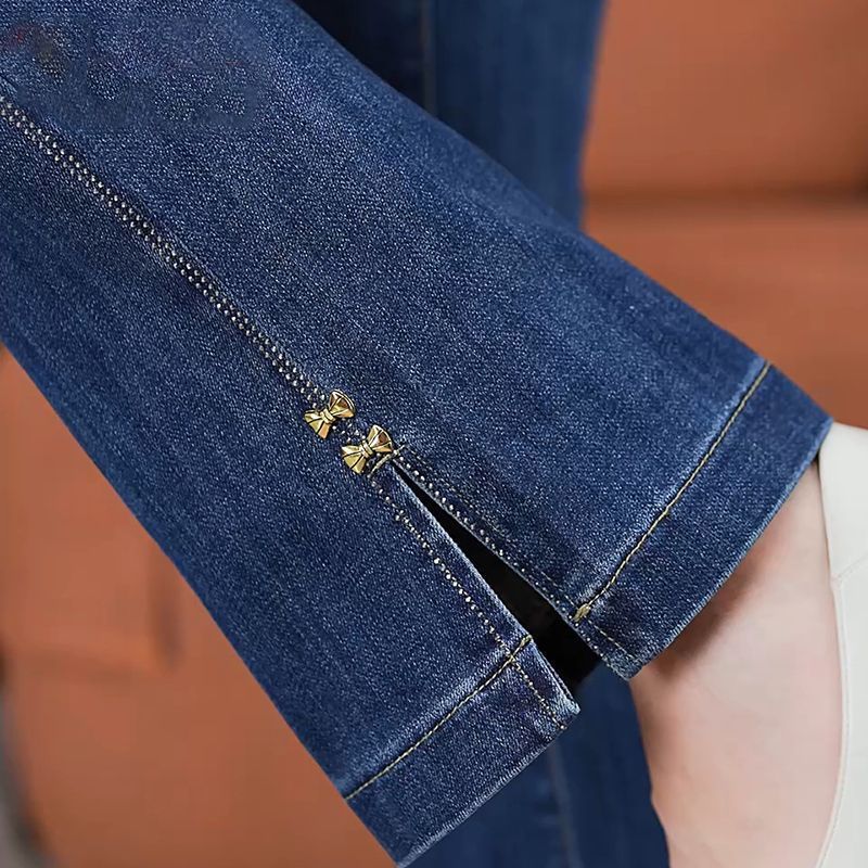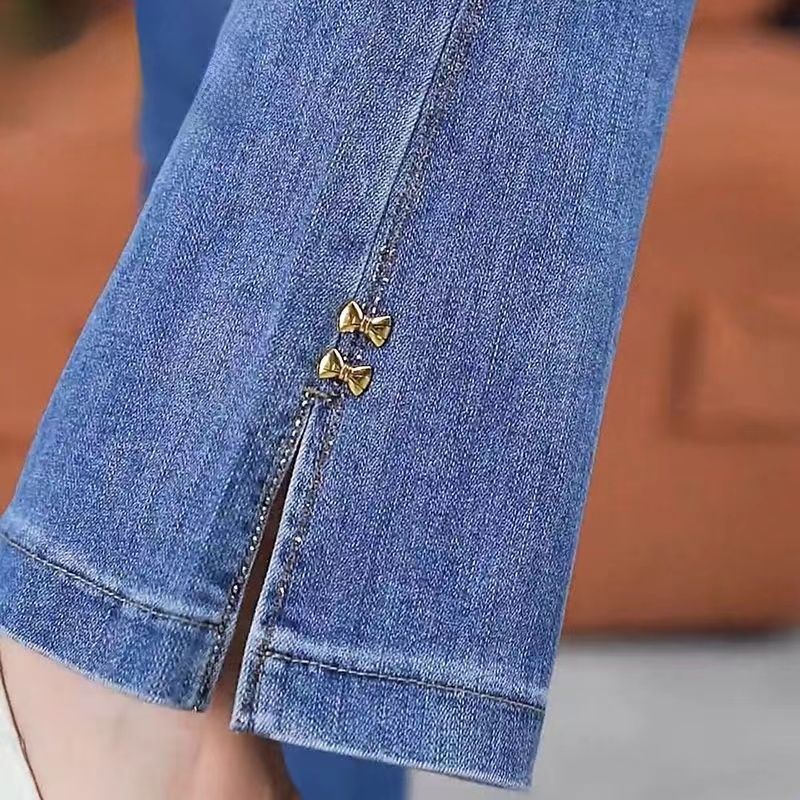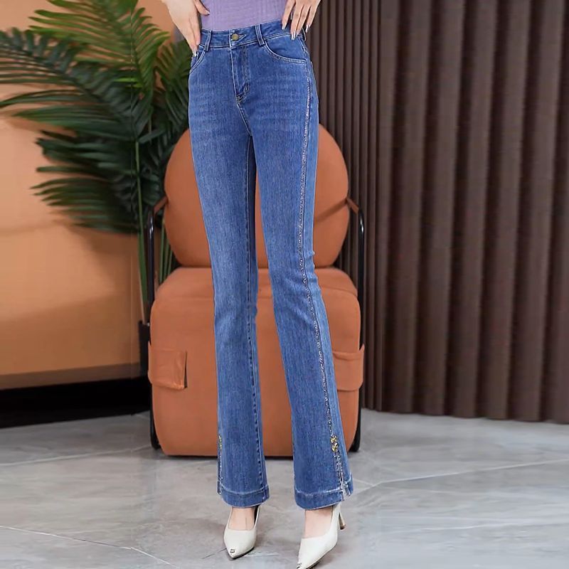 가을 새로운 도착 마이크로 라 청바지 여성 패션 높은 허리 스트레이트 튜브 스플릿 플레어 팬츠 스트레치 슬림 자른 바지 바지