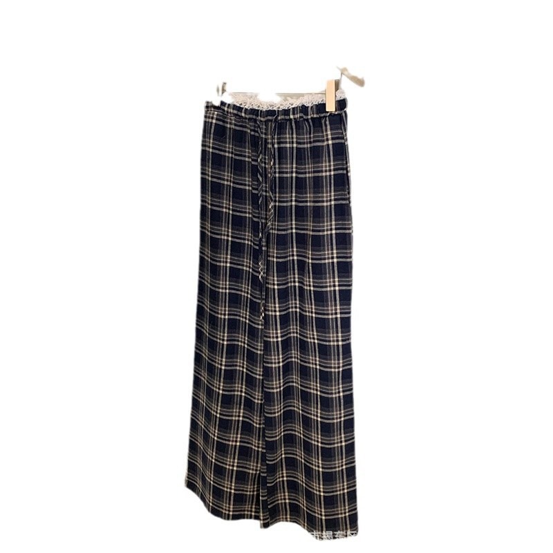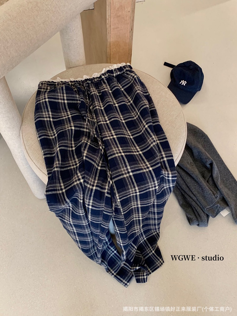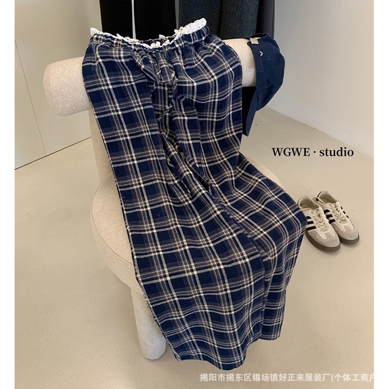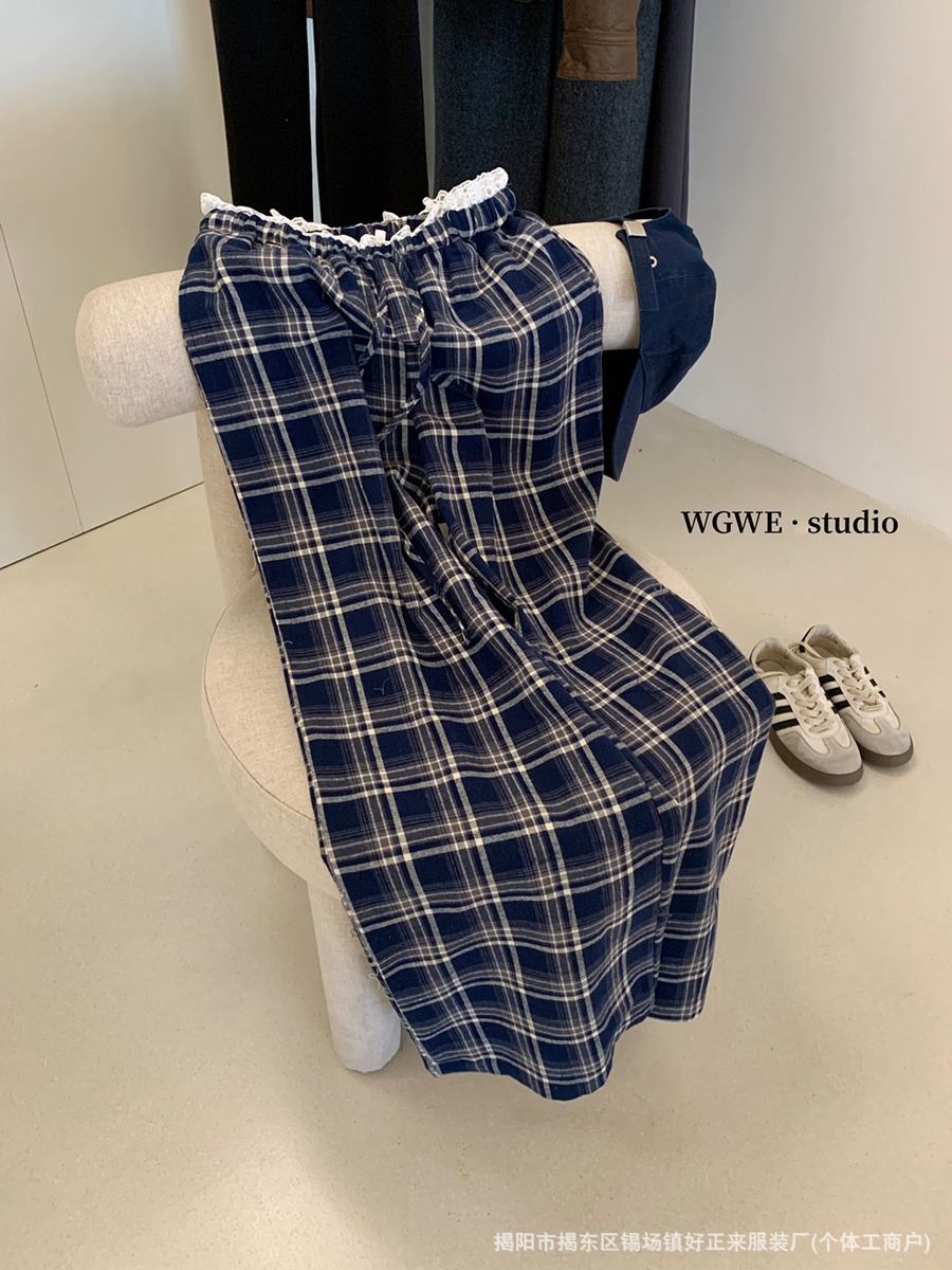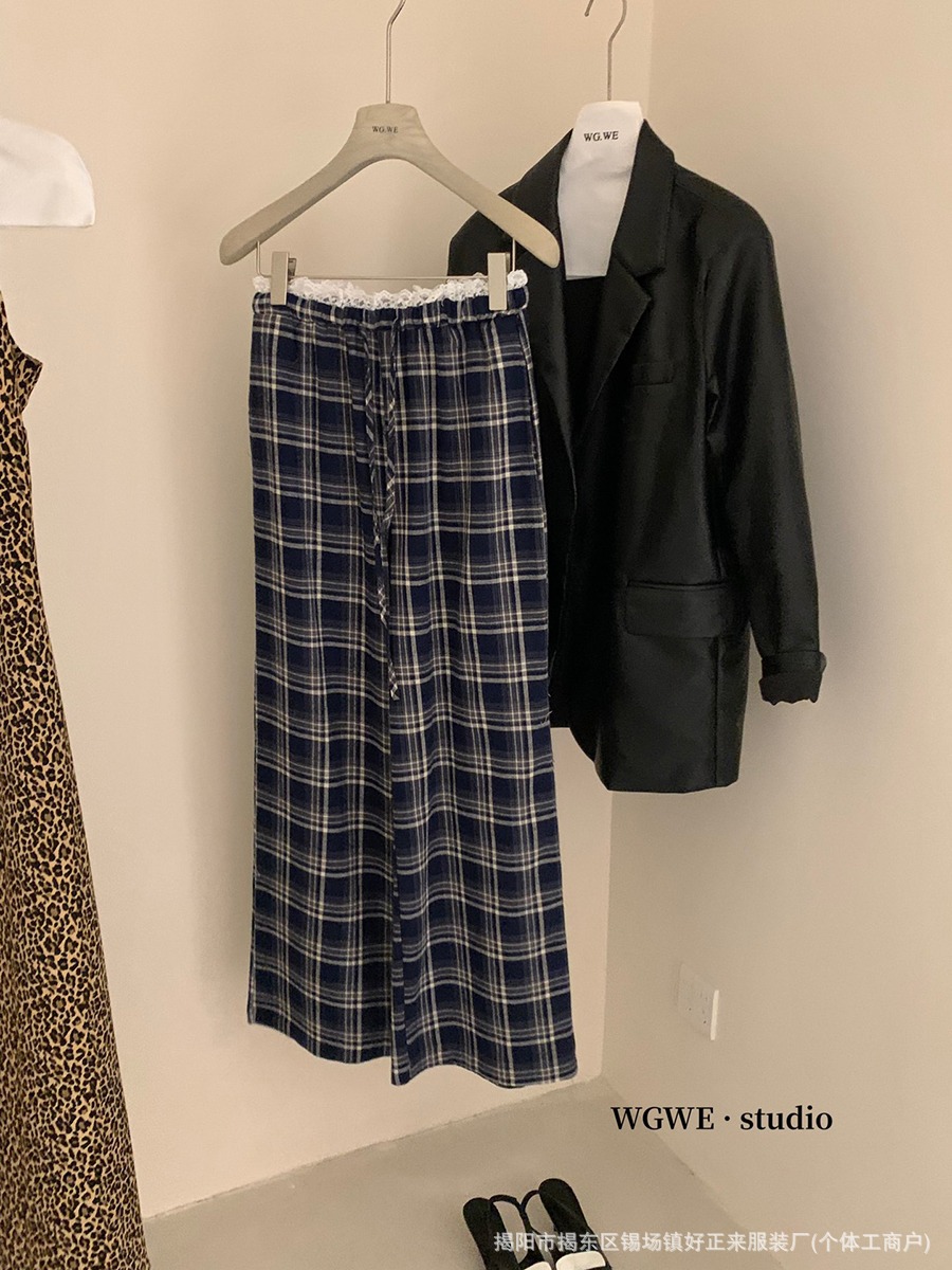 소스 제조업체 가을 및 겨울 레이스 체크 무늬 캐주얼 바지 여성의 느슨한 스트레이트 와이드 다리 바지 게으른 감각 하이 허리 바지