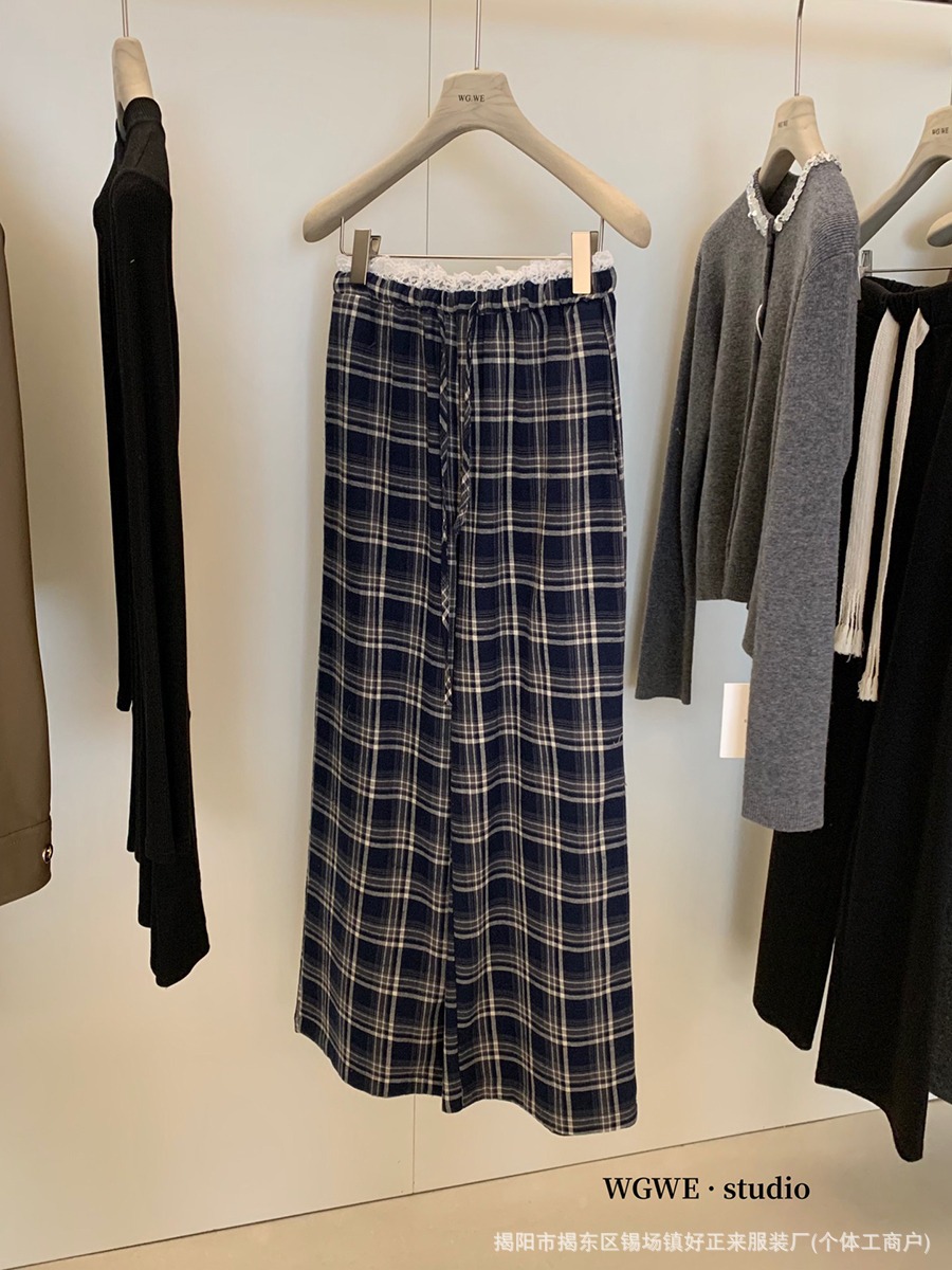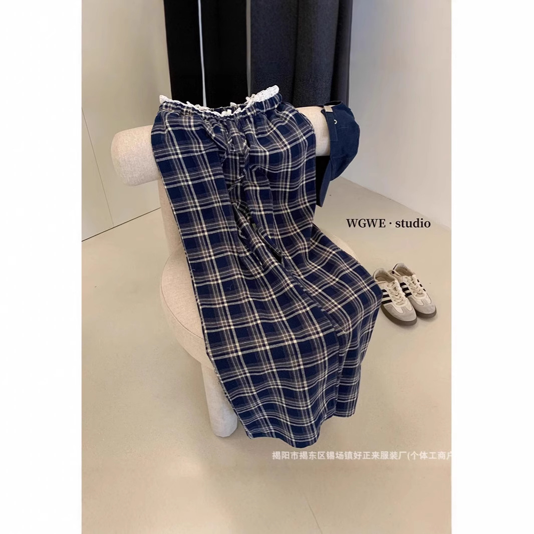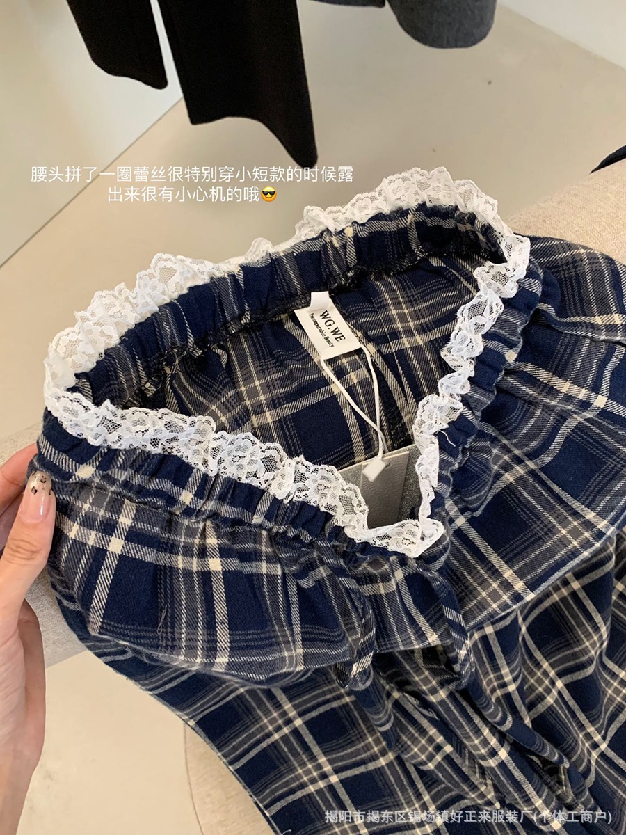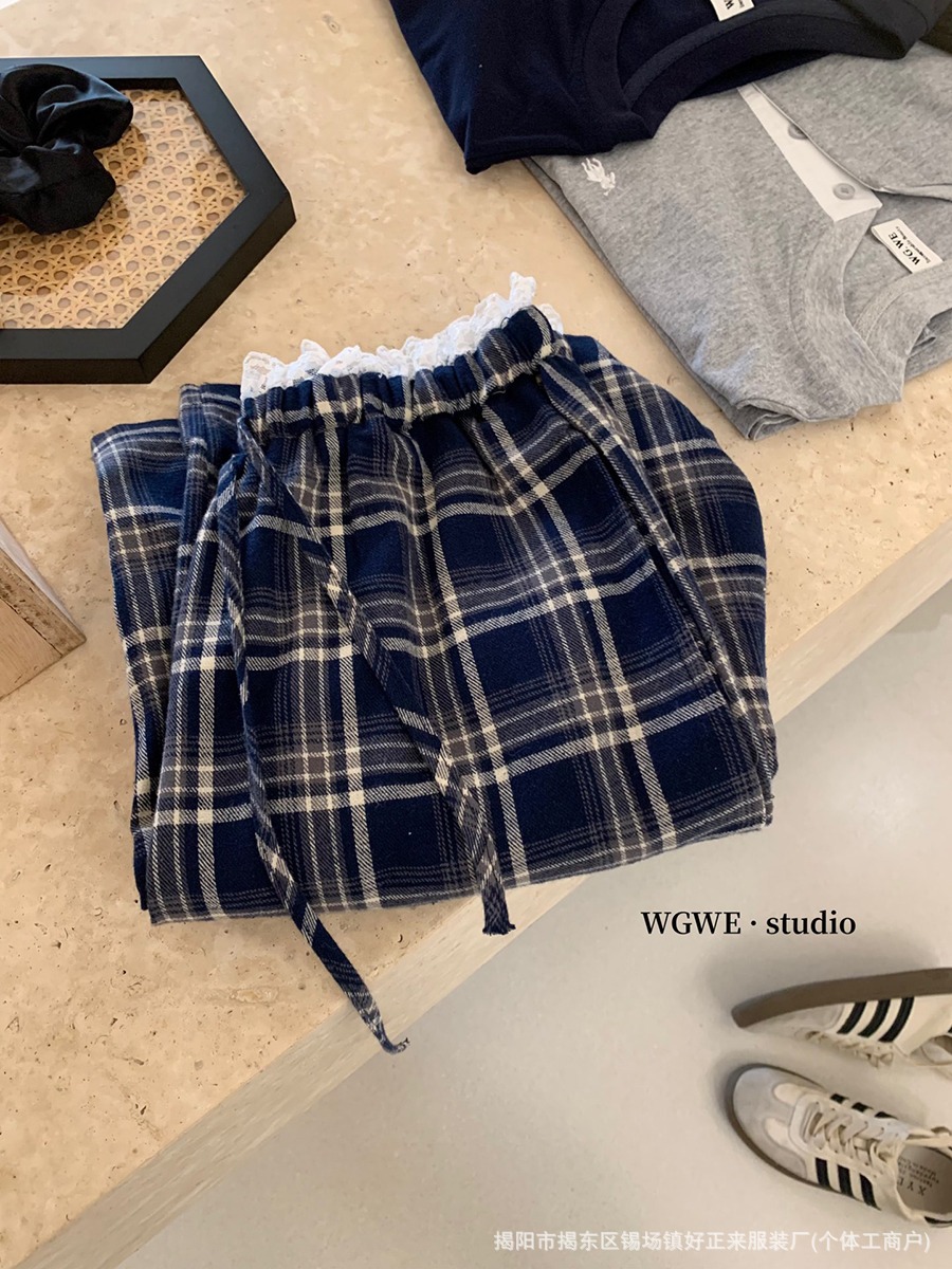 소스 제조업체 가을 및 겨울 레이스 체크 무늬 캐주얼 바지 여성의 느슨한 스트레이트 와이드 다리 바지 게으른 감각 하이 허리 바지