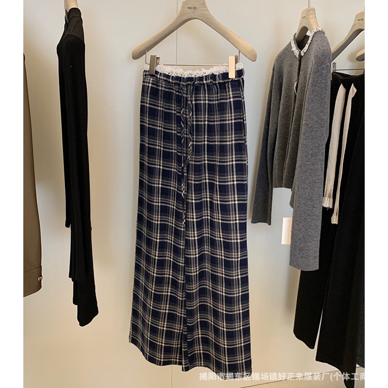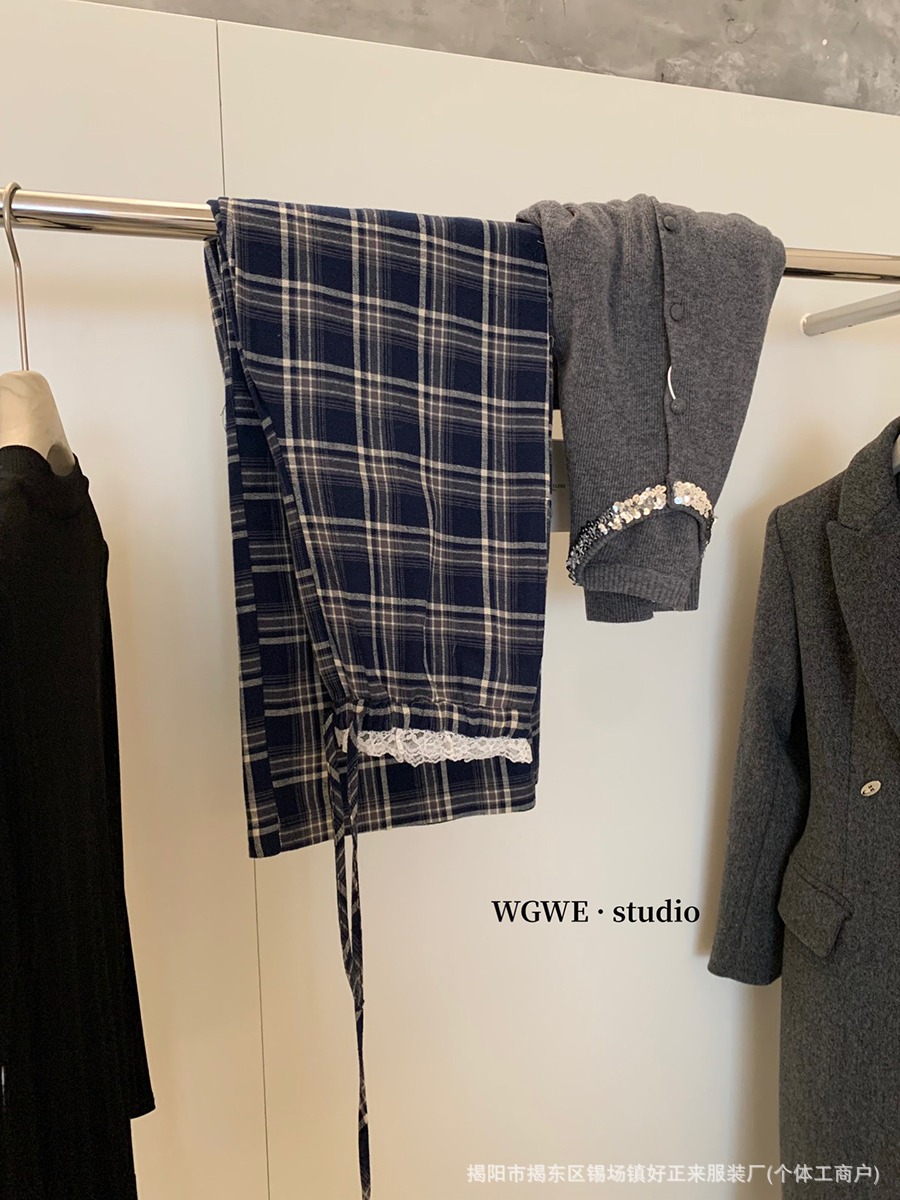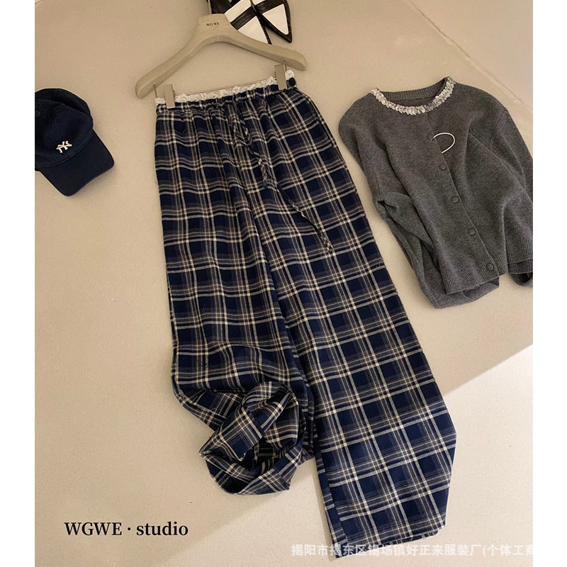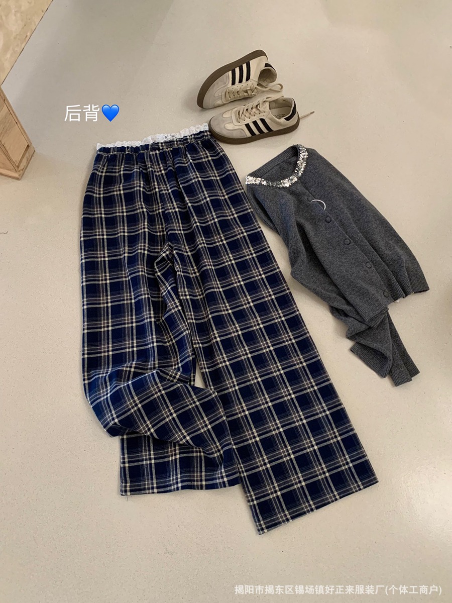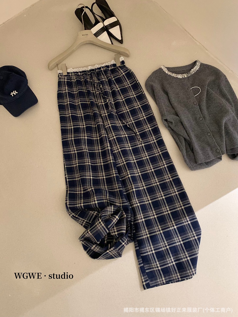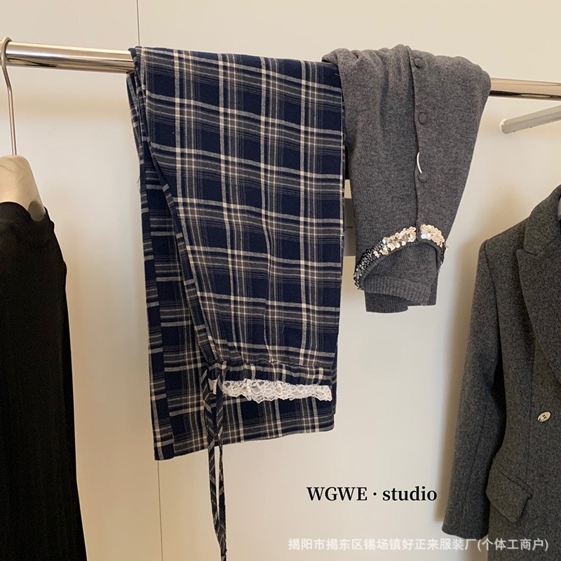 소스 제조업체 가을 및 겨울 레이스 체크 무늬 캐주얼 바지 여성의 느슨한 스트레이트 와이드 다리 바지 게으른 감각 하이 허리 바지스토어 가기