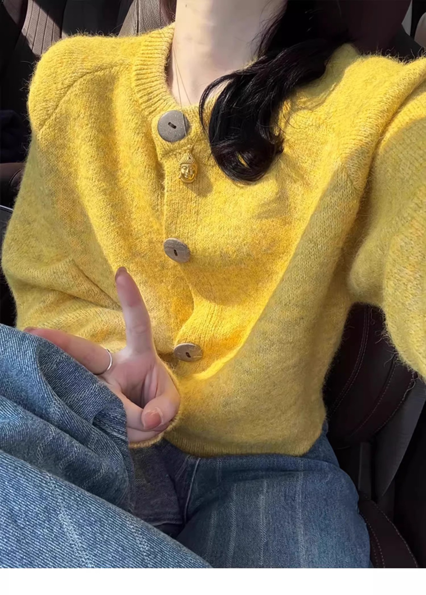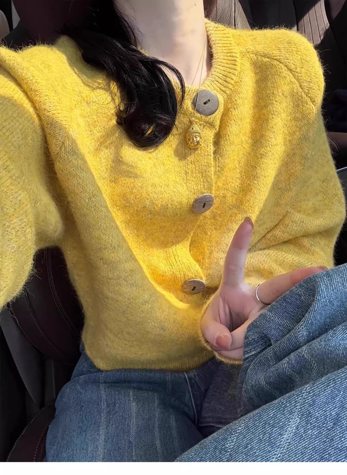 프렌치 레트로 옐로우 너구리 벨벳 카디건 스웨터 재킷 여성용 느슨한 게으른 스타일 아우터 니트 탑 봄과 가을