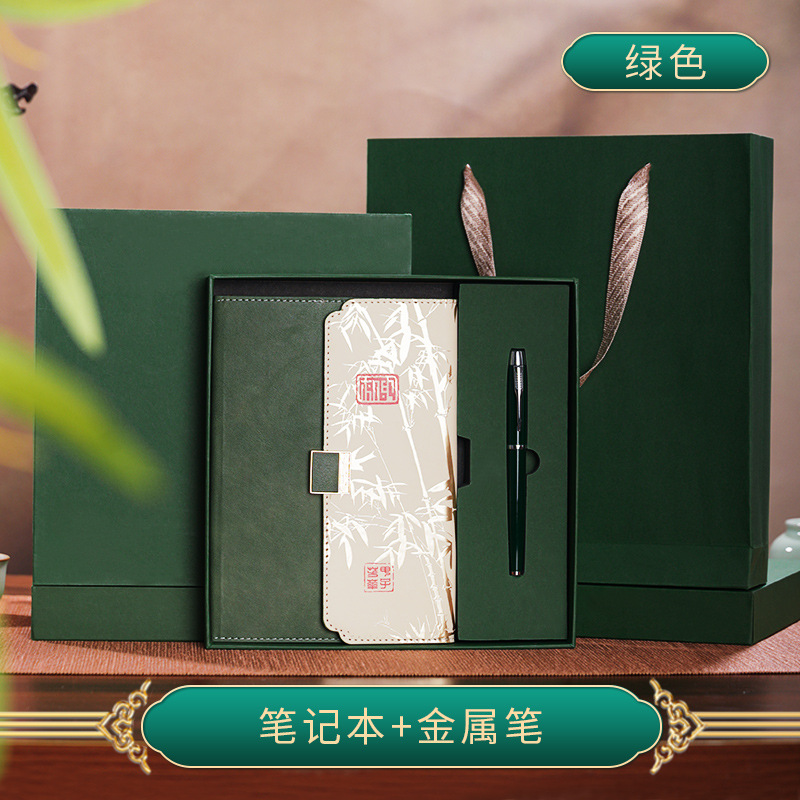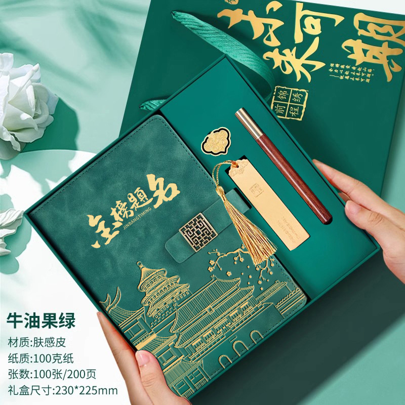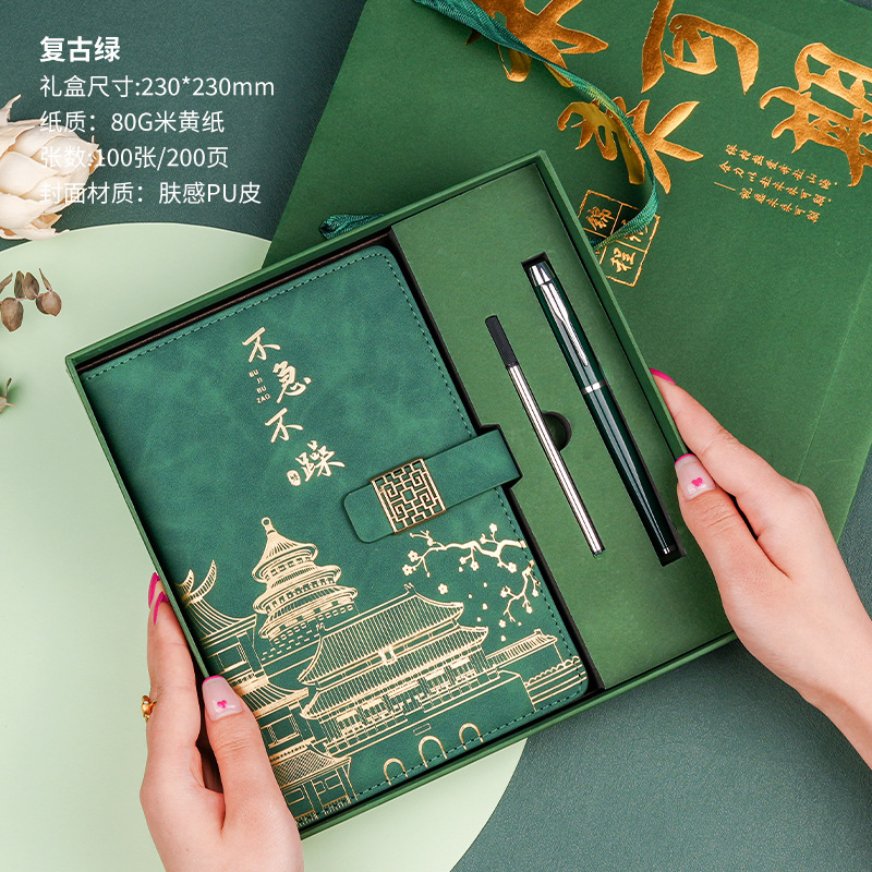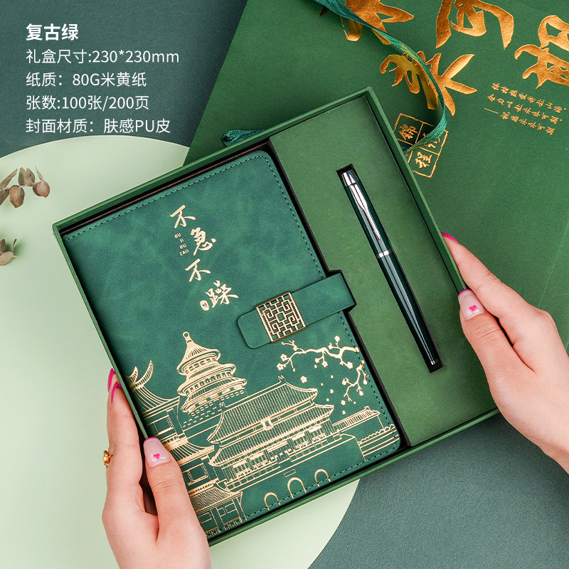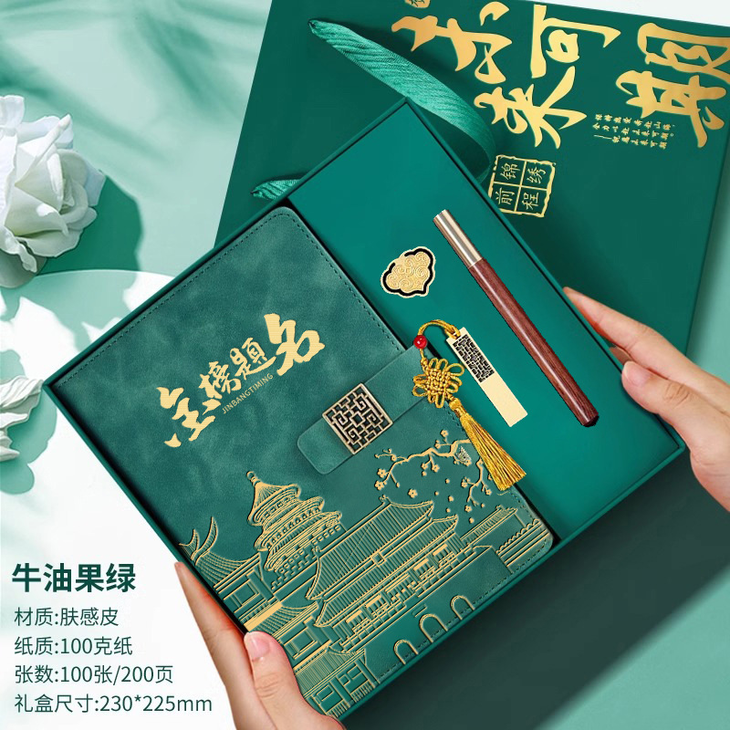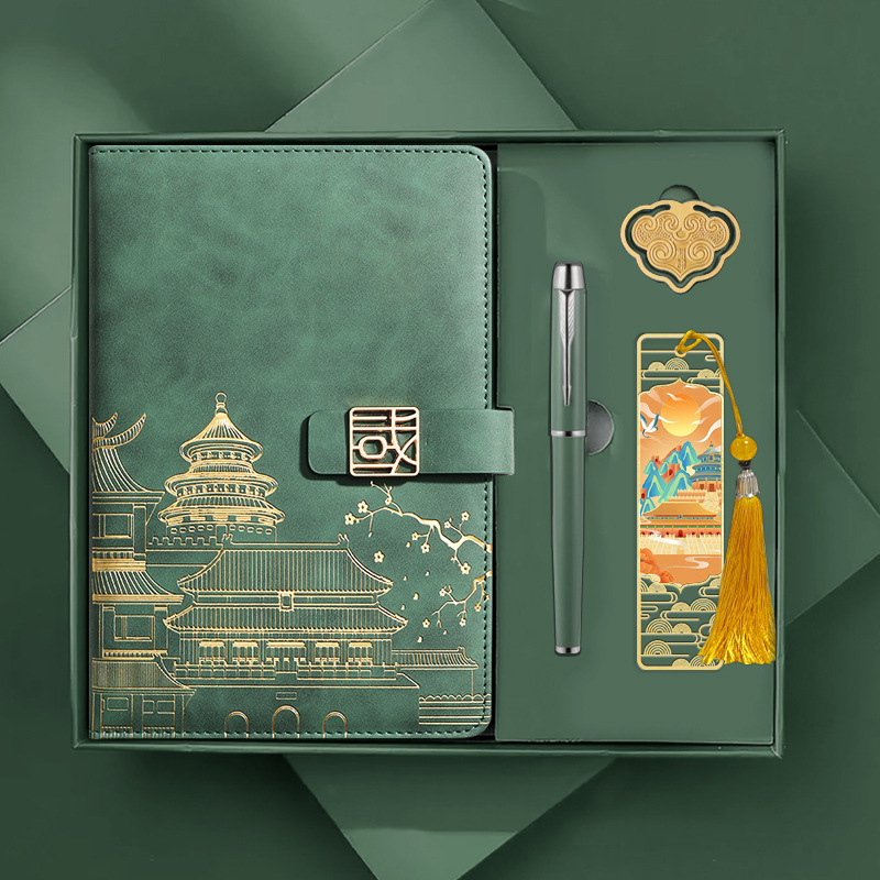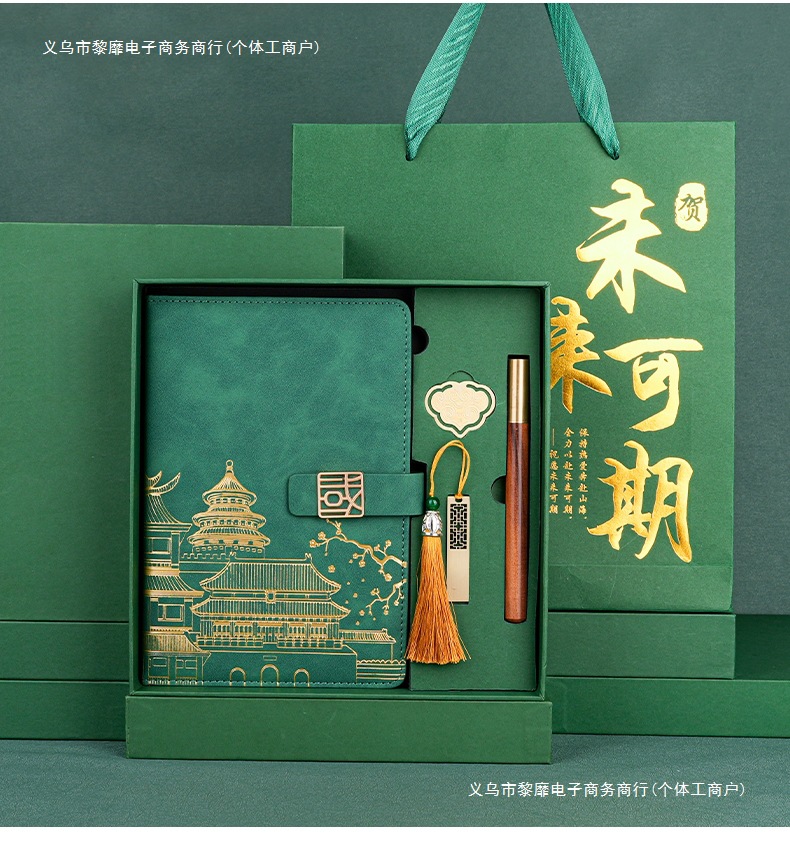 • 골드리스트 제목 [국차오 명품 4종 세트 선물가방] 짙은 녹색 한자 버클 + 금속 펜 + 국차오 책갈피 + 책꽂이