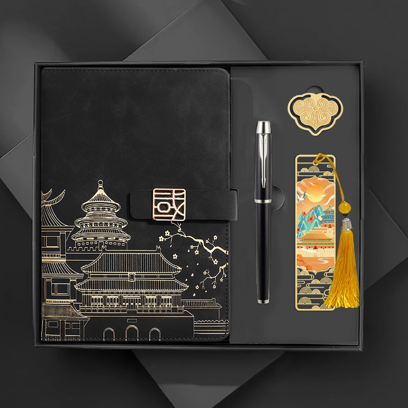 • [국차오 명품 4종 세트 선물가방] 검정 한자 버클 + 금속 펜 + 국차오 책갈피 + 책꽂이