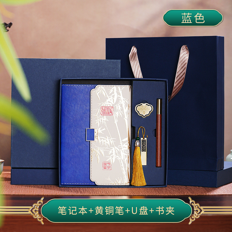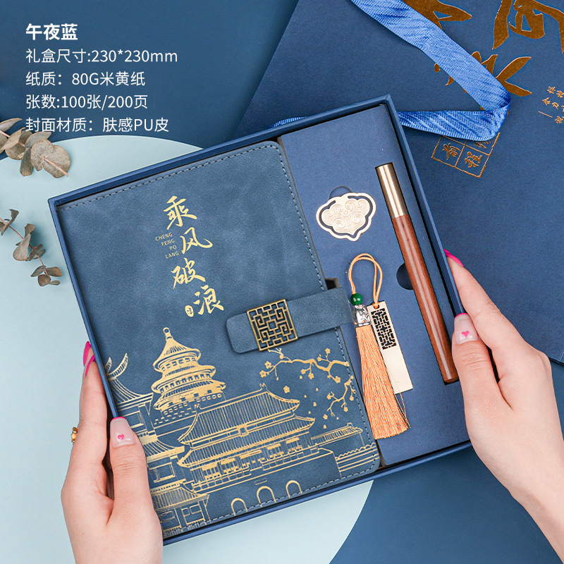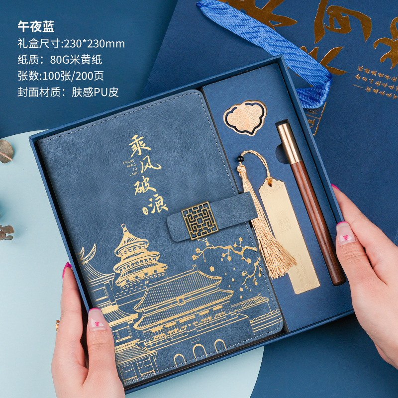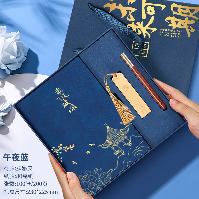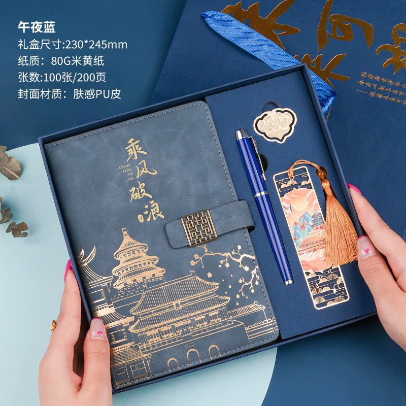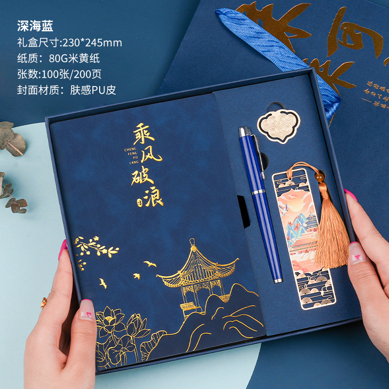 • 골드리스트 제목 [국차오 4종 세트 선물가방] 남색 창꽃단추 + 황동펜 + 책갈피 + 책꽂이