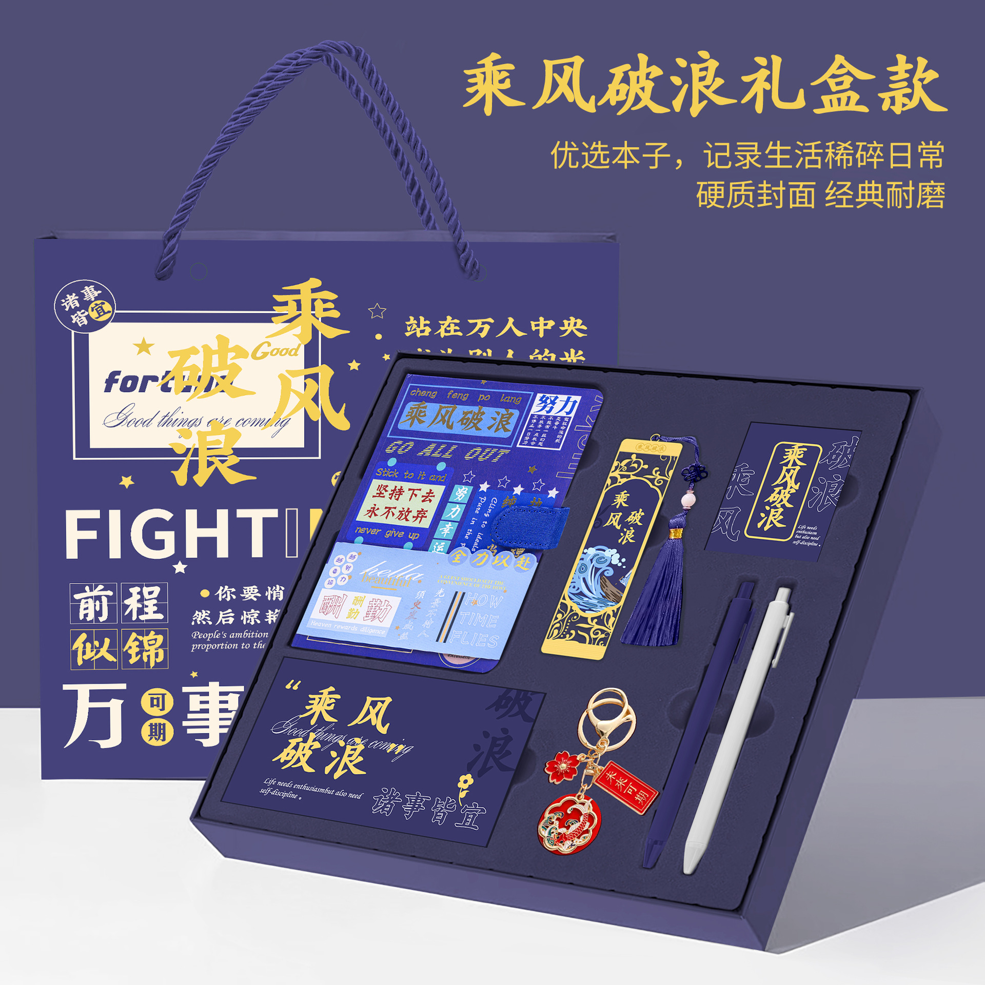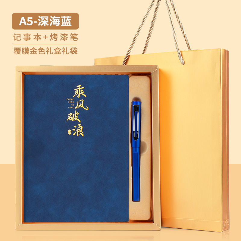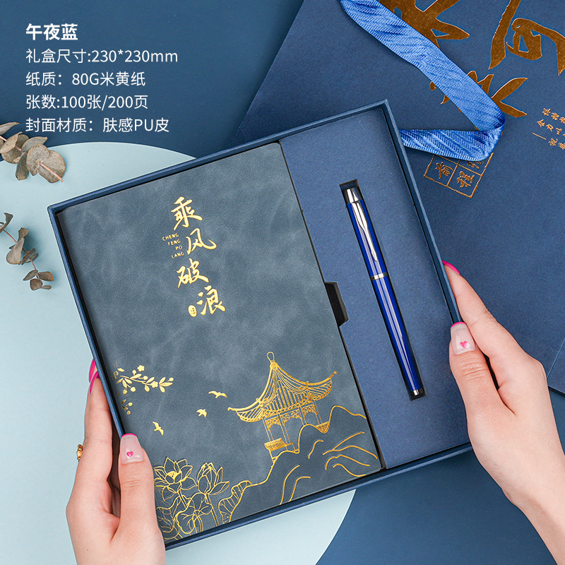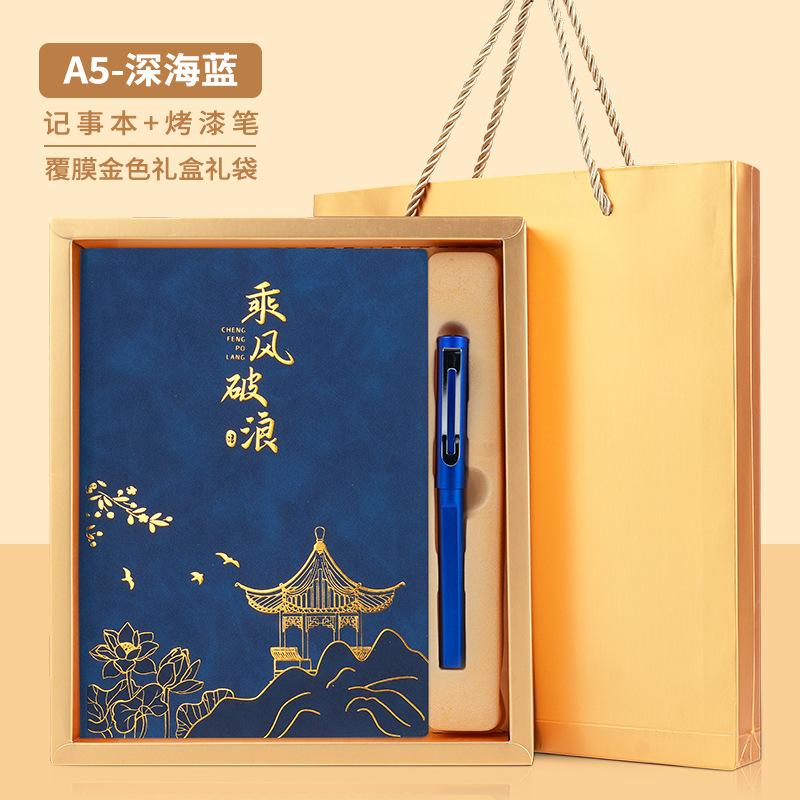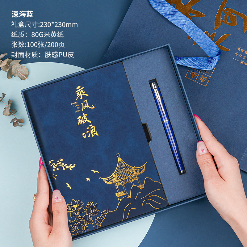 • 골드리스트 제목 [국차오 4종 세트 선물가방] 남색 창꽃단추 + 황동펜 + 책갈피 + 책꽂이