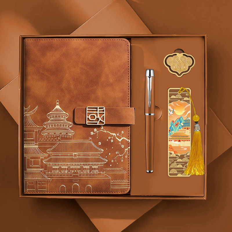 • [국차오 명품 4종 세트 선물가방] 갈색 한자 버클 + 금속 펜 + 국차오 책갈피 + 책꽂이