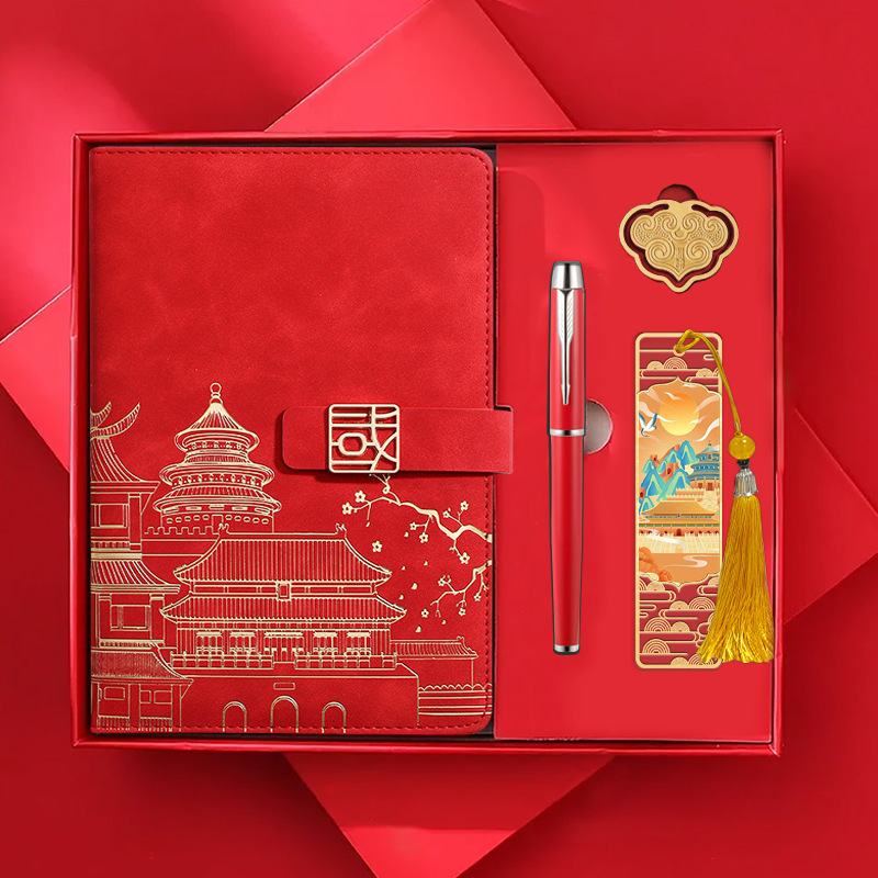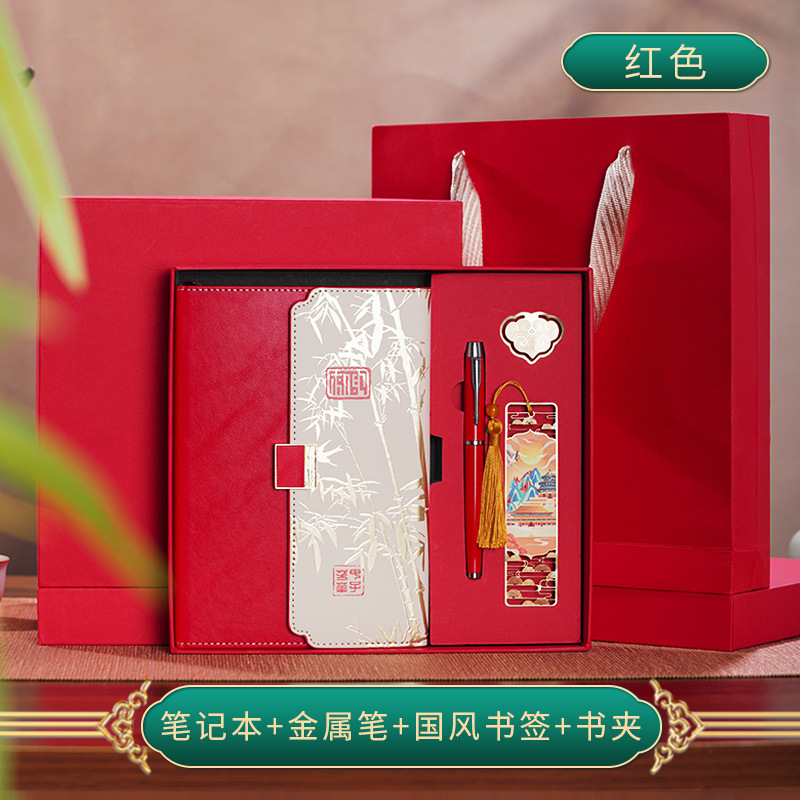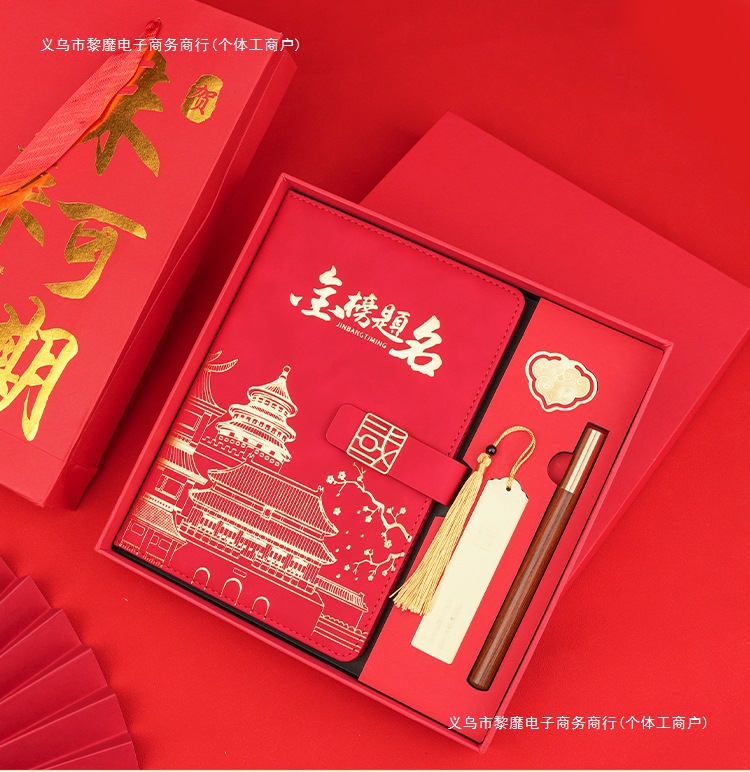 • 골드리스트 제목 [국차오 명품 4종 세트 선물가방] 빨간 한자 버클 + 금속 펜 + 국차오 책갈피 + 책꽂이