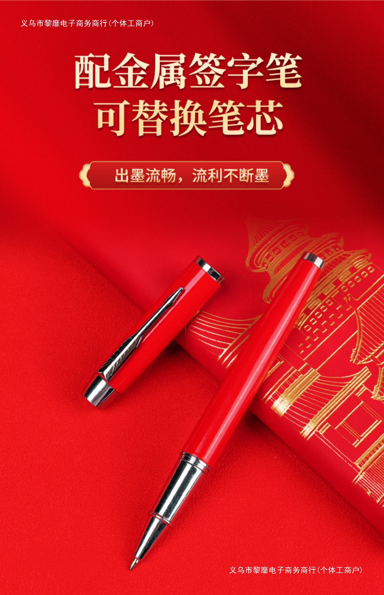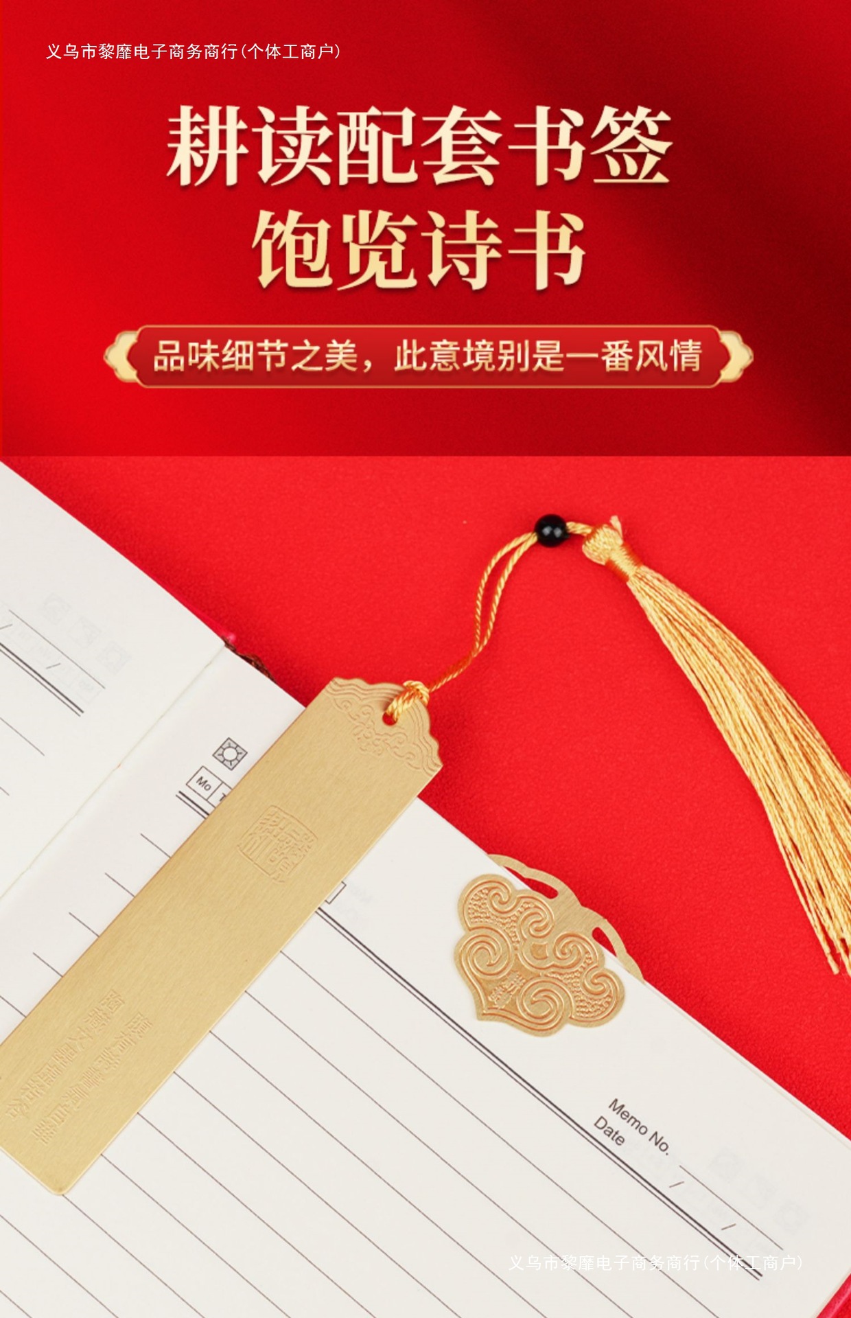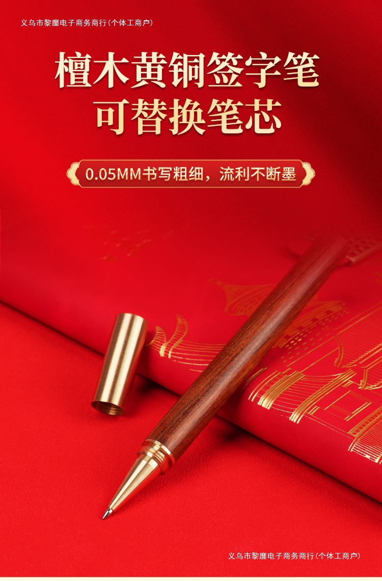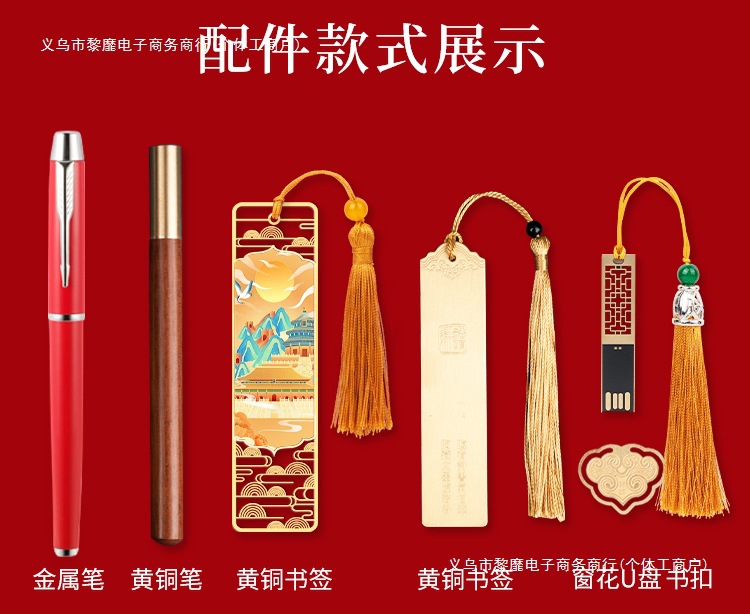 • 골드리스트 제목 [국차오 4종 세트 선물가방] 빨간색 창 그릴 단추 + 황동 펜 + 책갈피 + 책꽂이