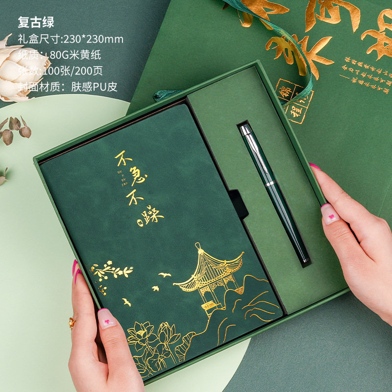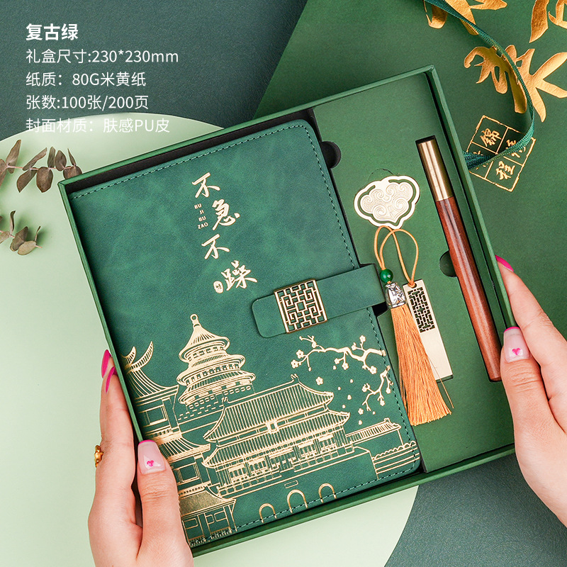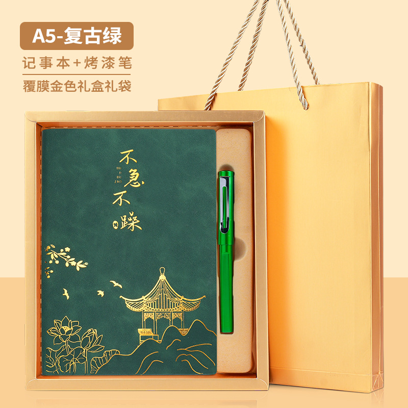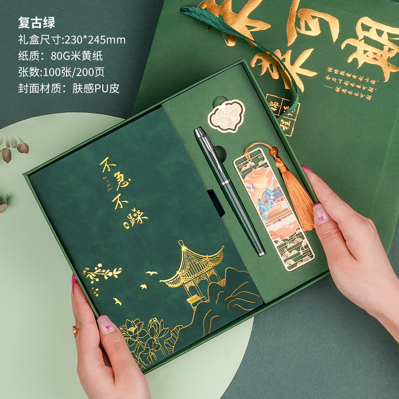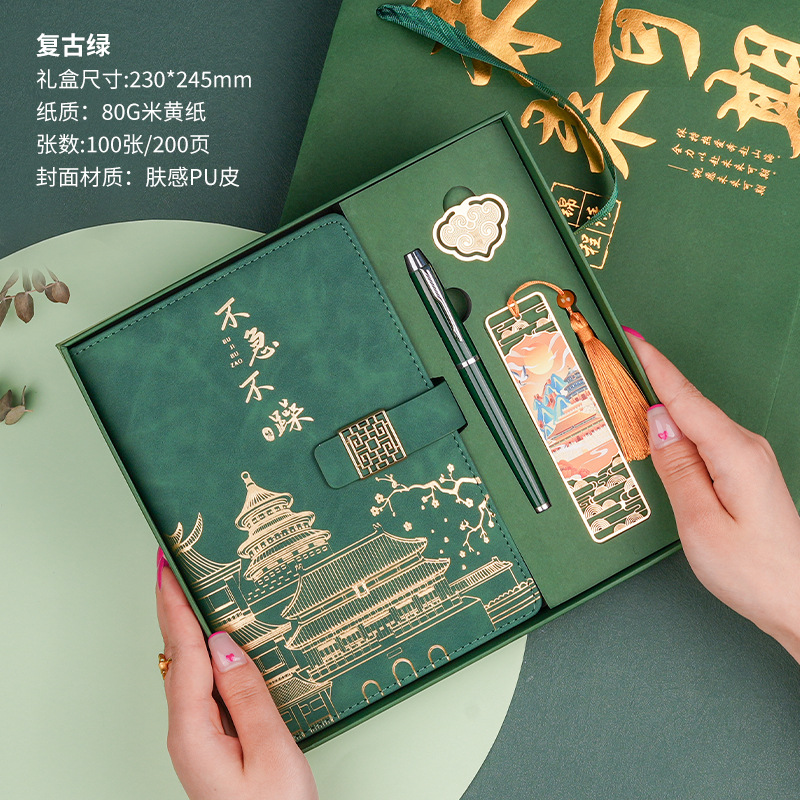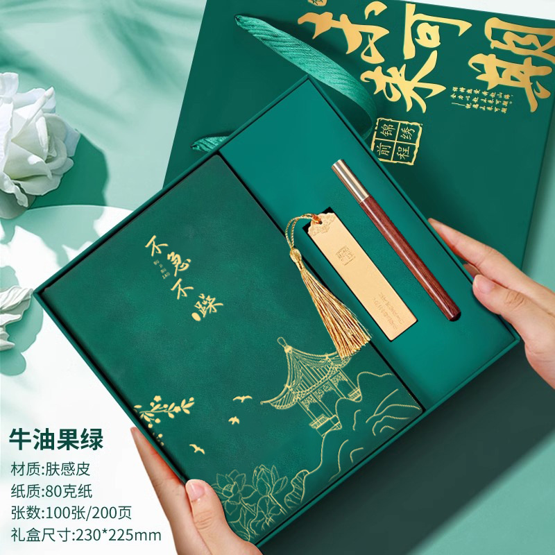 • 서두르지 마세요 [명품 4종 세트 + 선물가방] 레트로 그린 양가죽 + 메탈 펜 + 중국식 책갈피 + 북클립