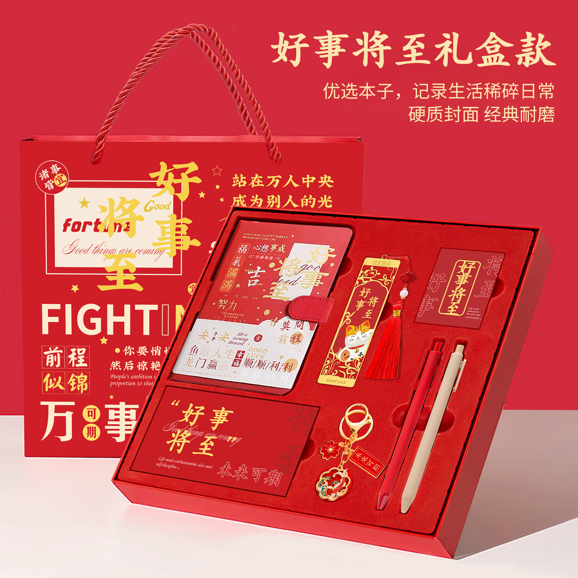 • [좋은 일이 온다] 빨간색 선물 상자 - 노트 + 책갈피 + 책꽂이 + 열쇠고리 + 펜 2개 + 축하 카드 + 선물 가방