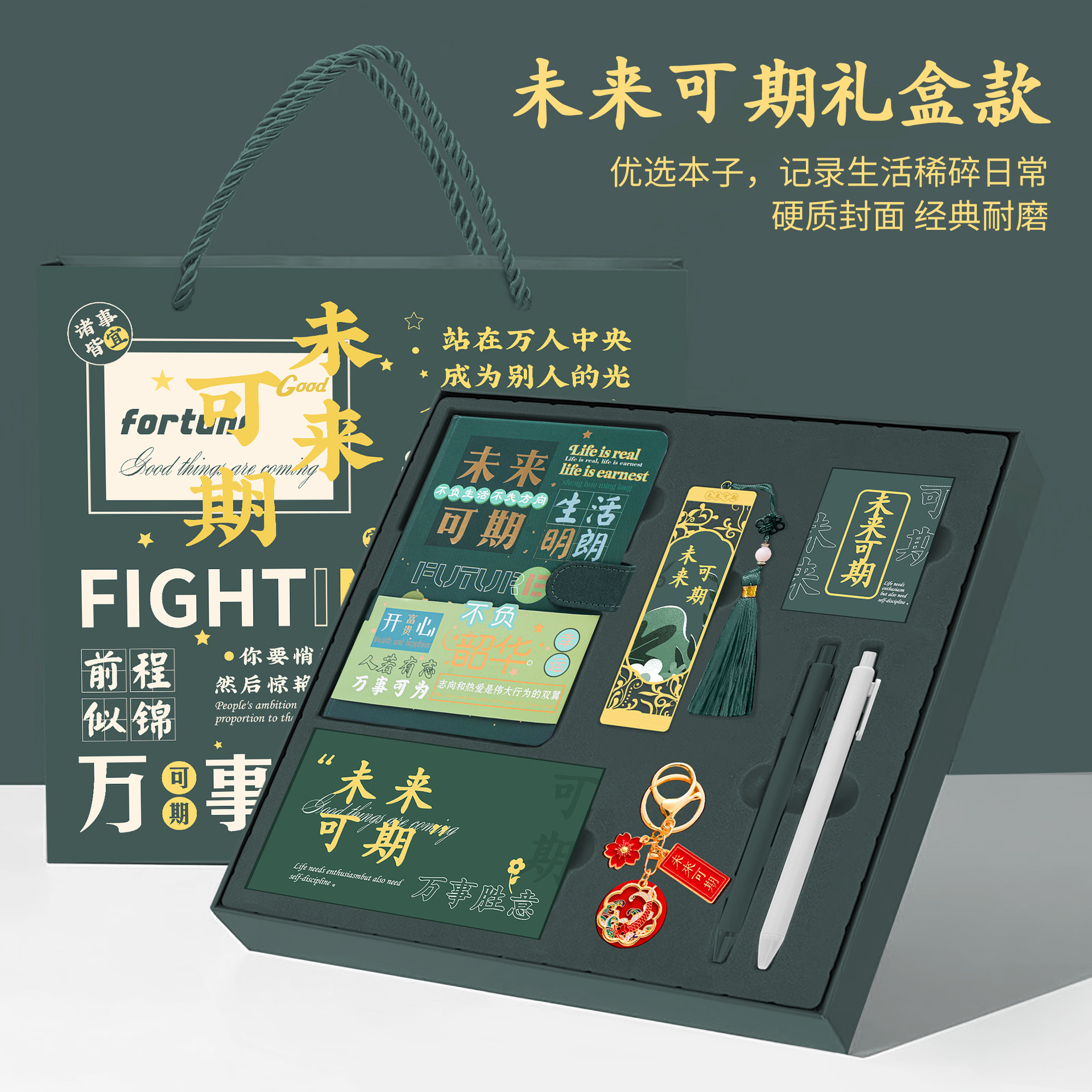 • [미래는 유망하다] 그린 선물상자 - 노트 + 책갈피 + 책꽂이 + 열쇠고리 + 펜 2개 + 축하카드 + 선물가방