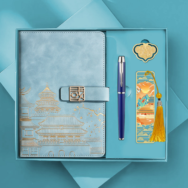 • [국차오 명품 4종 세트 선물가방] 남색 한자 버클 + 금속 펜 + 국차오 책갈피 + 책꽂이