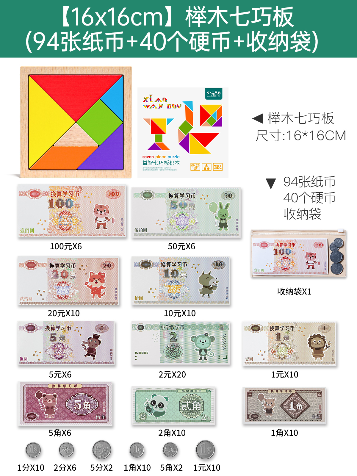 • [16x16cm] 너도밤나무 탱그램 + (지폐 94장 + 동전 40장 + 수납가방)
