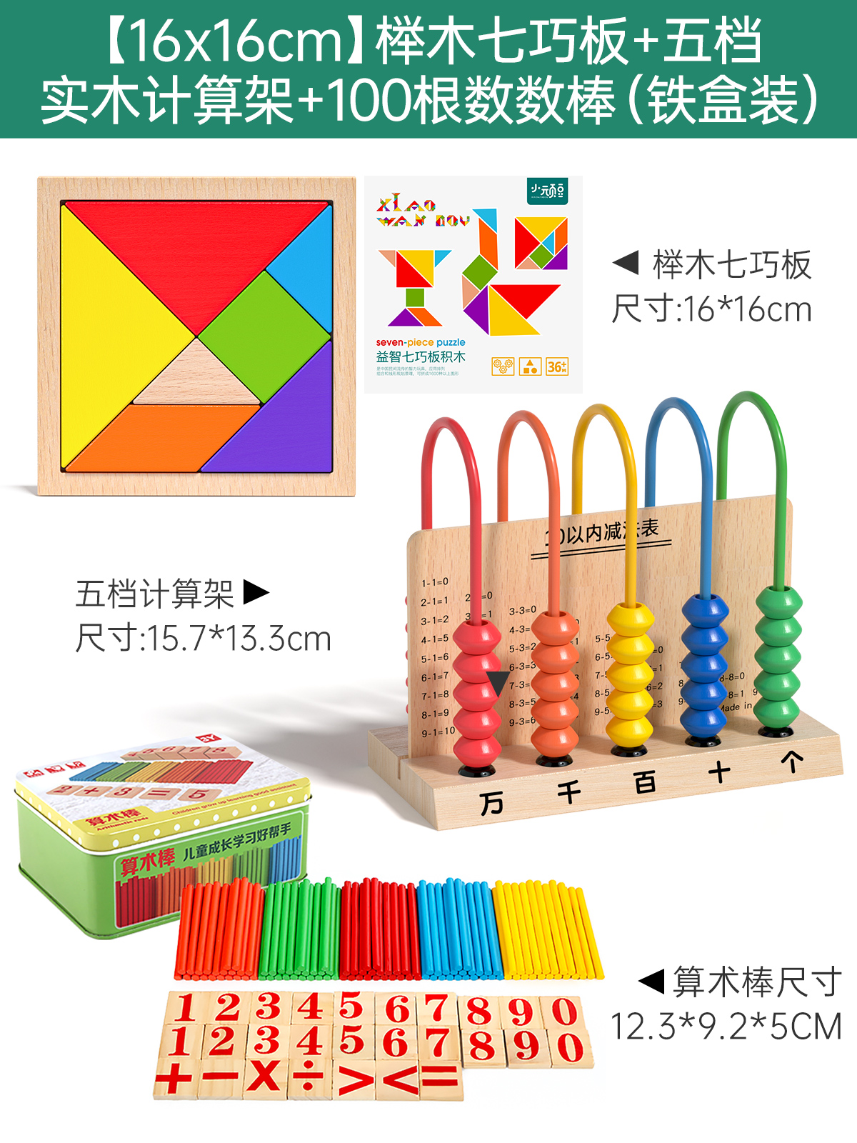 • [16x16cm] 너도밤나무 칠교놀이 + 5단 원목 계산대 + 계수 막대 100개(철 상자에 포장)