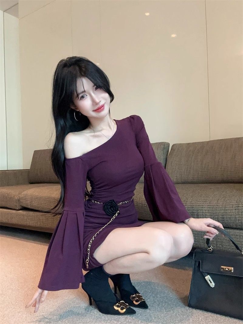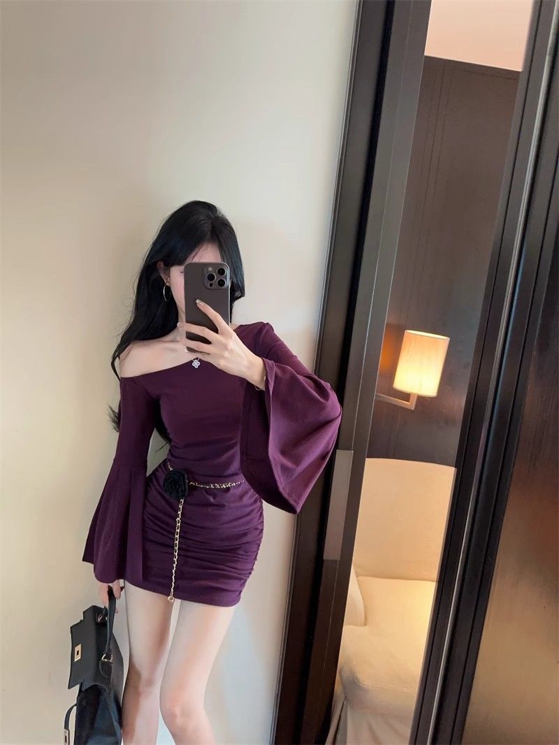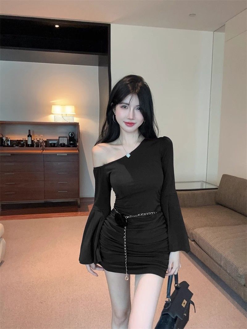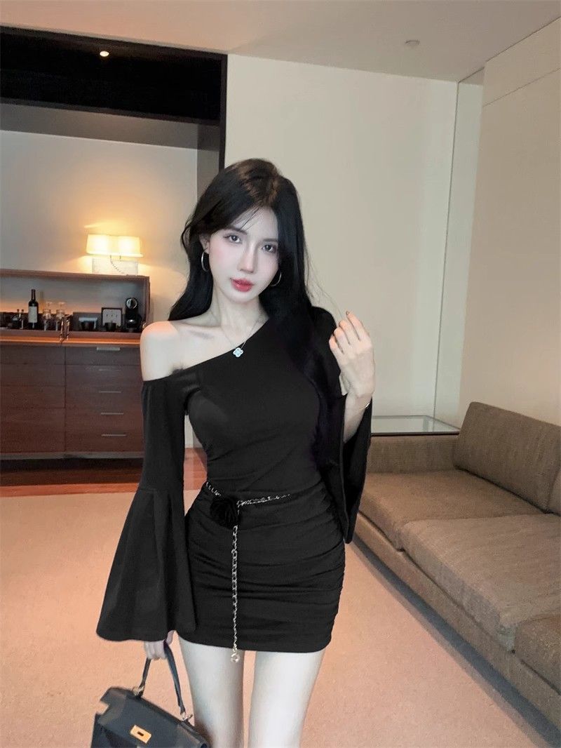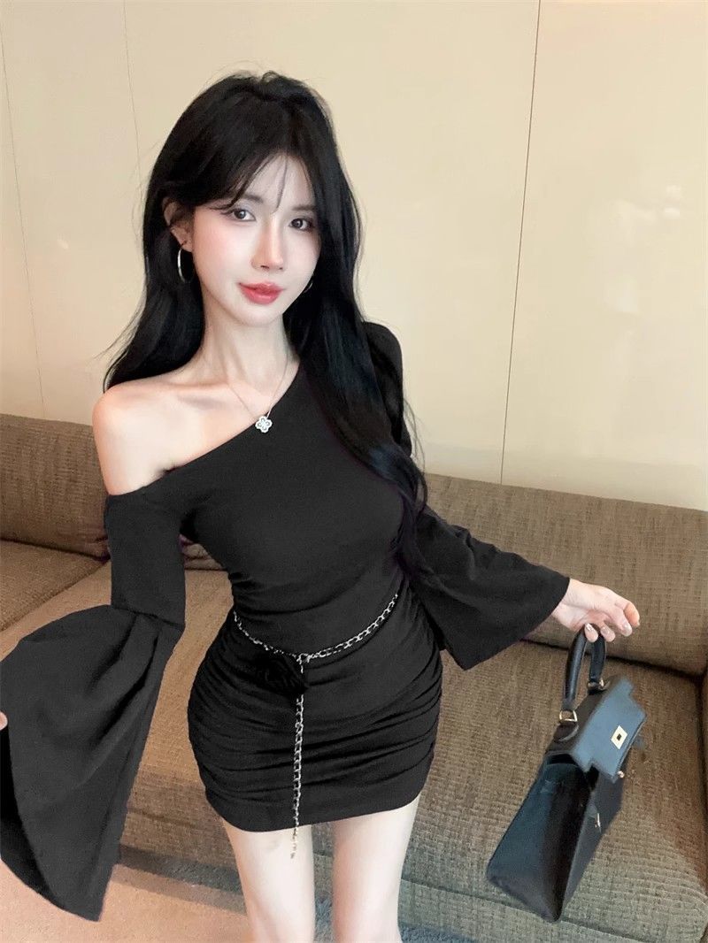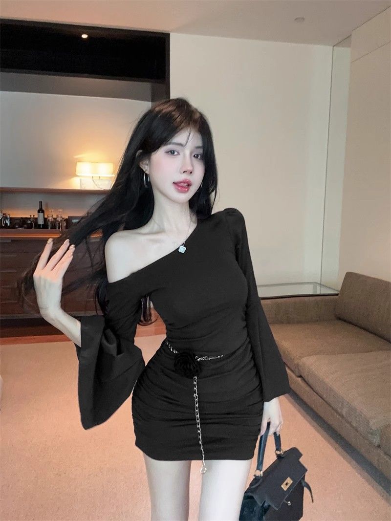 검은 색 칼라 트럼펫 슬리브 원피스 여성의 가을 뜨거운 소녀 어깨 스커트 슬림 핏 타이트한 허리 주름 엉덩이 스커트스토어 가기