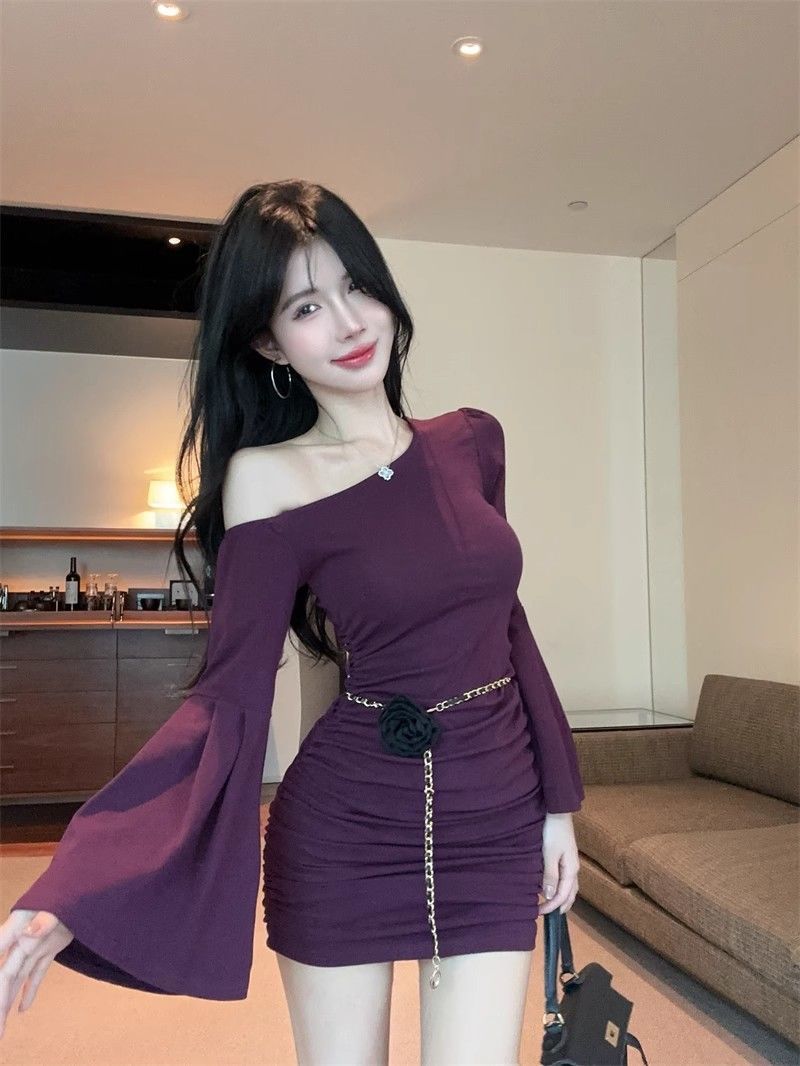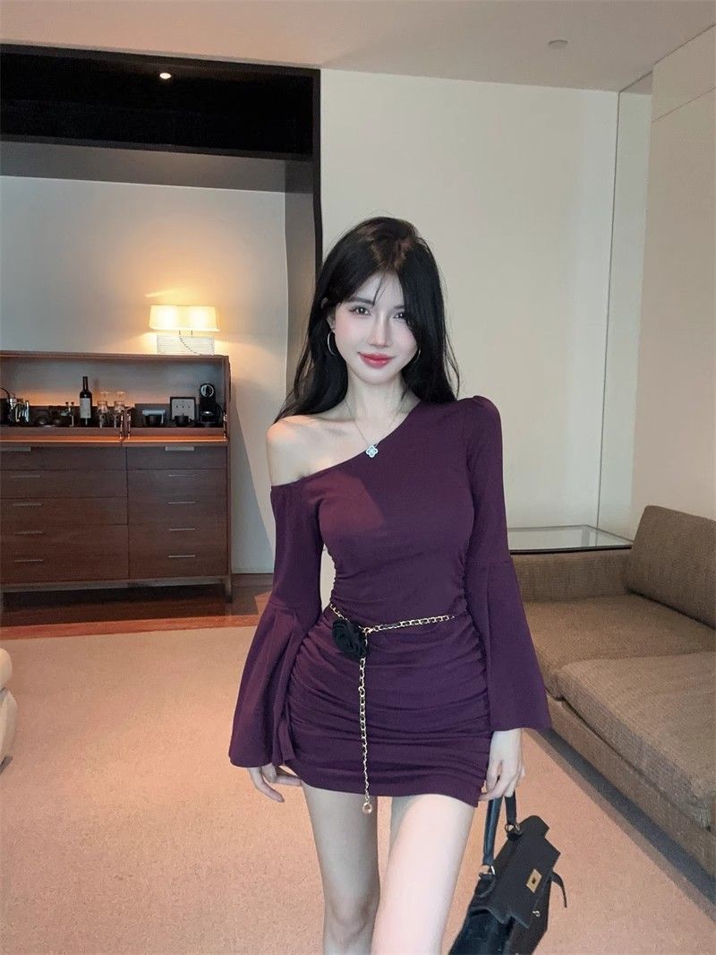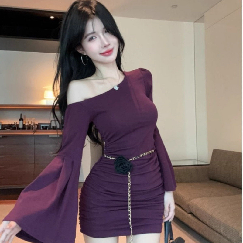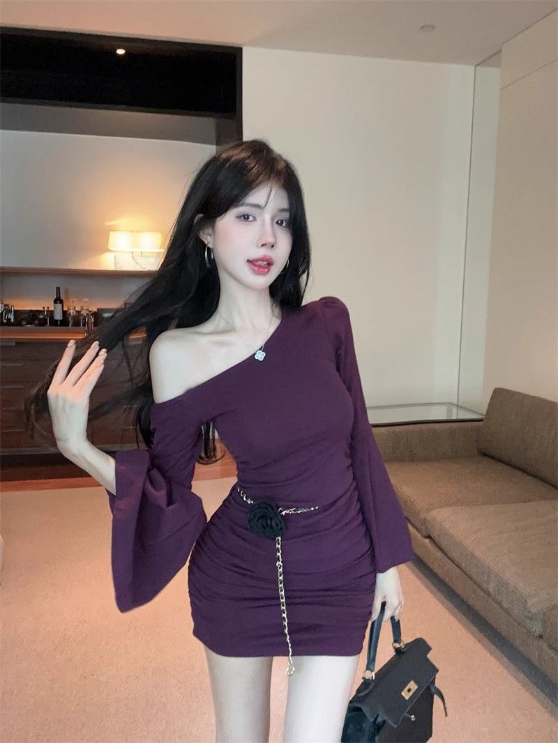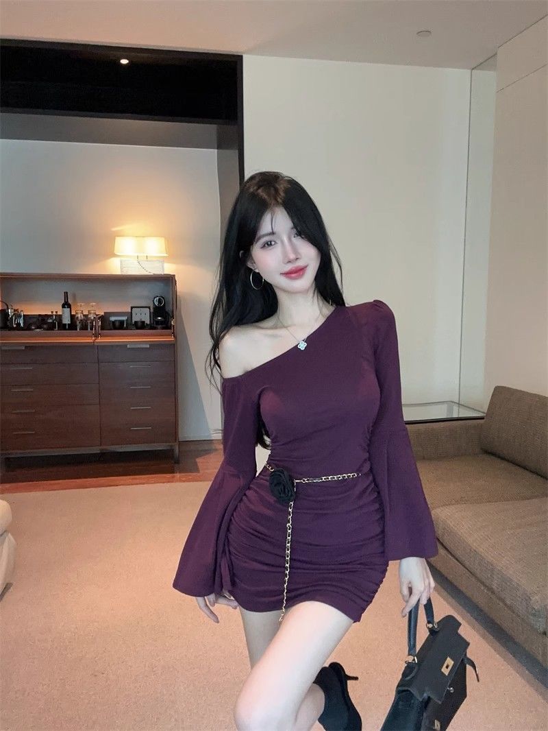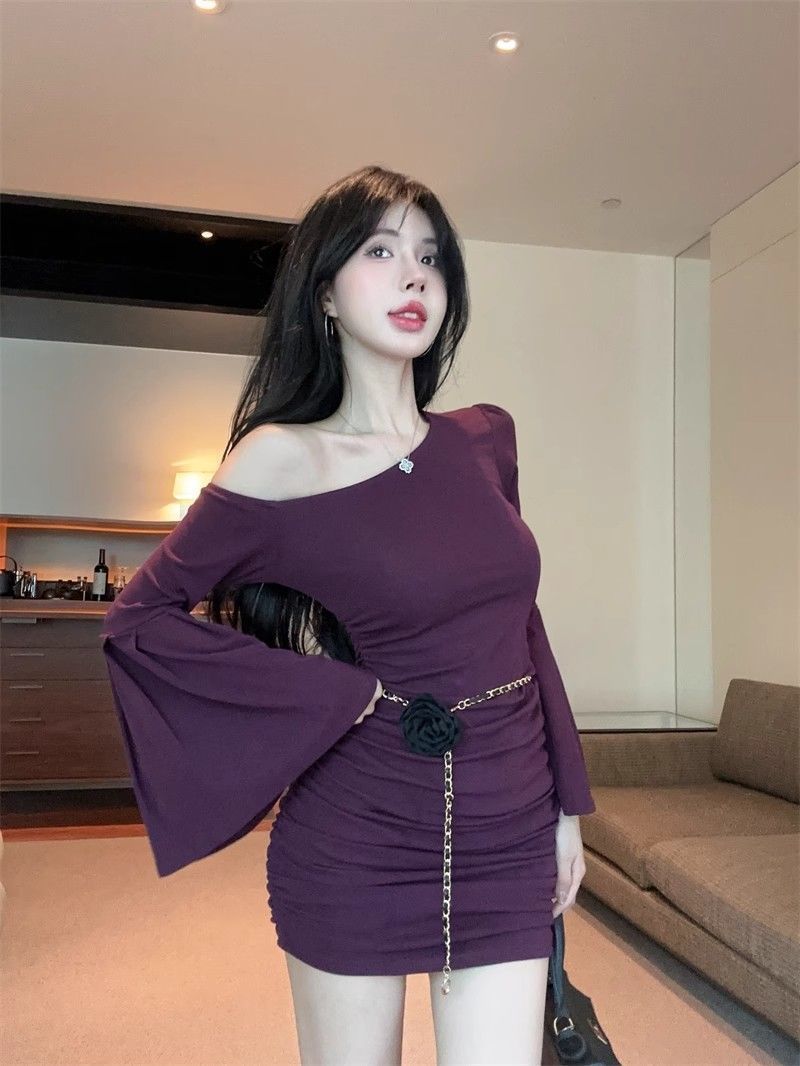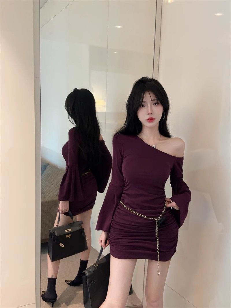 검은 색 칼라 트럼펫 슬리브 원피스 여성의 가을 뜨거운 소녀 어깨 스커트 슬림 핏 타이트한 허리 주름 엉덩이 스커트스토어 가기