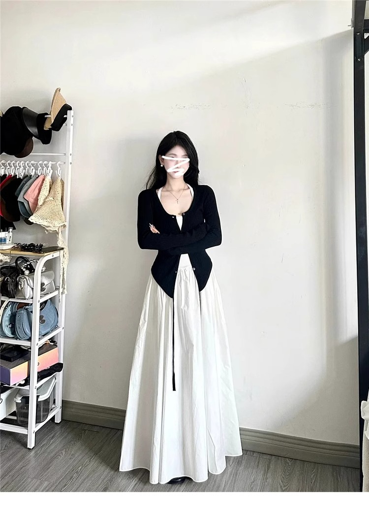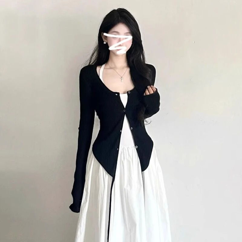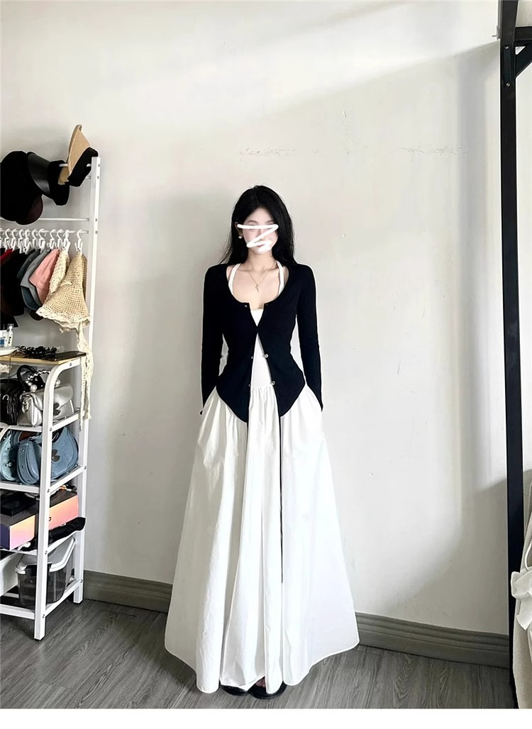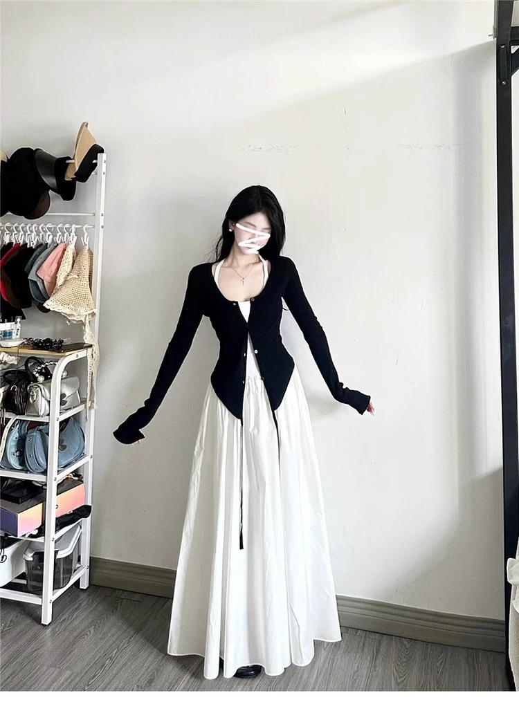 한국 스타일 캐주얼 화이트 슬링 원피스 초가을 2024 새로운 블랙 우아한 카디건 간단한 긴 원피스 투피스 세트