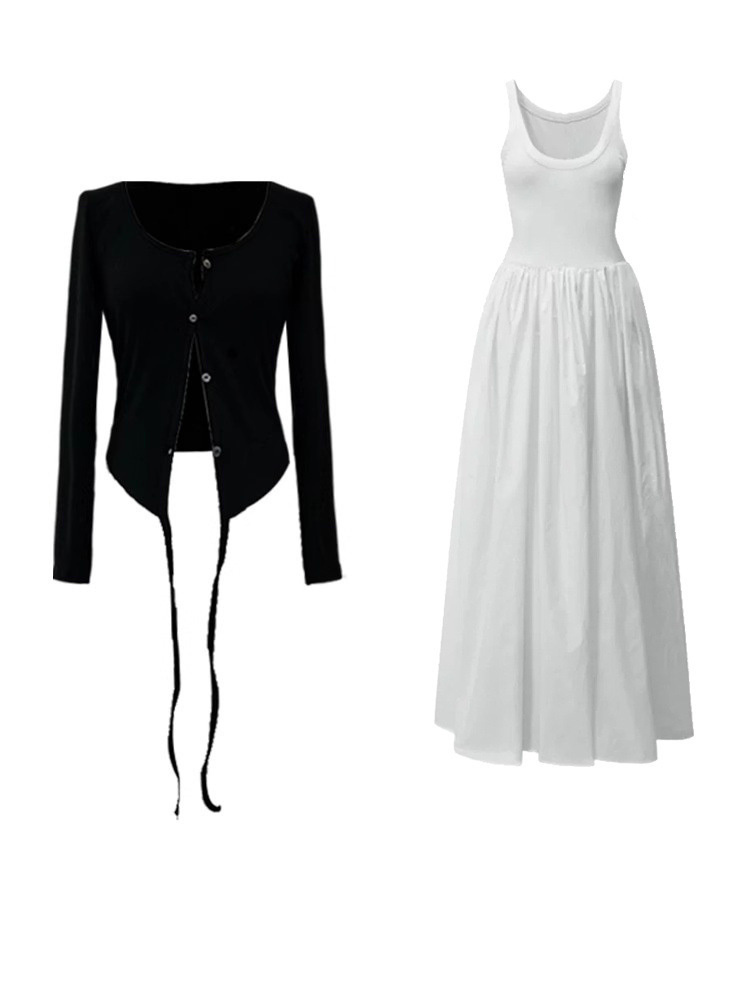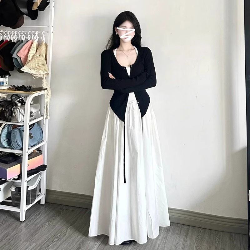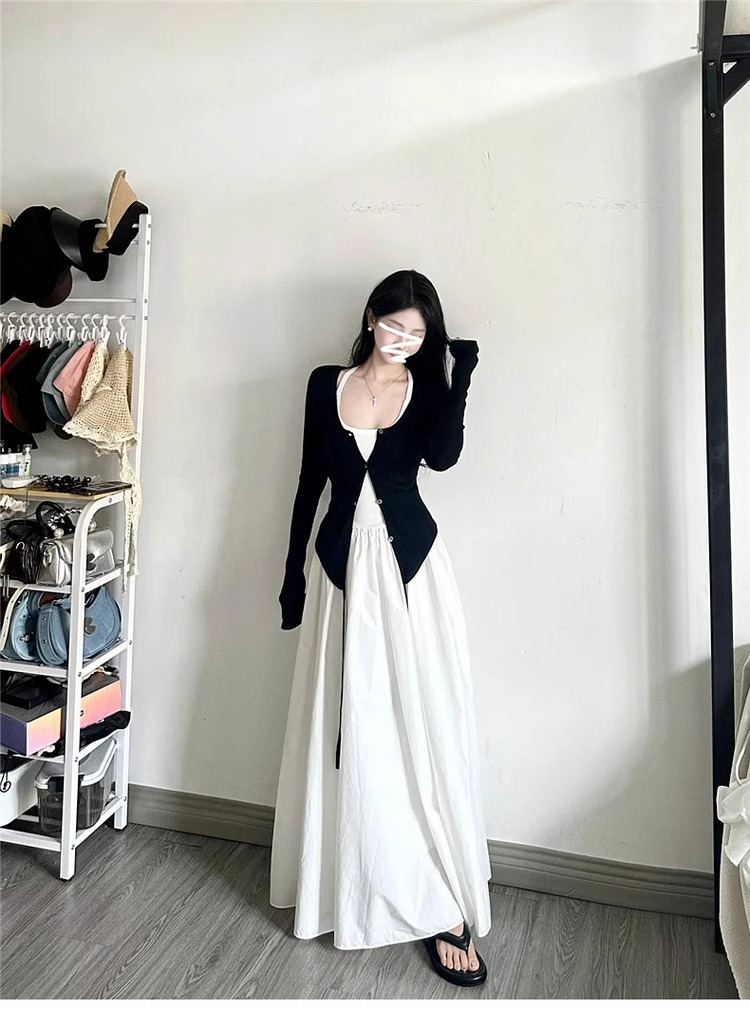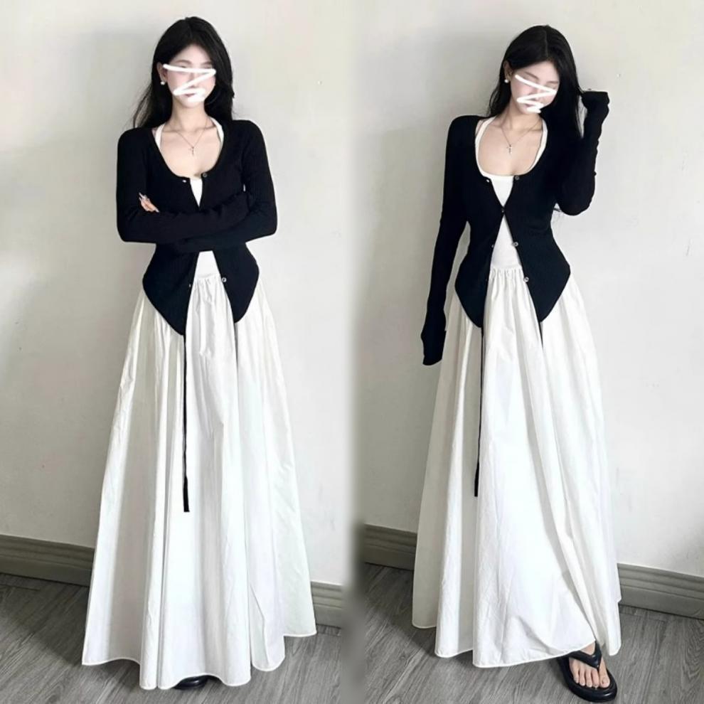 한국 스타일 캐주얼 화이트 슬링 원피스 초가을 2024 새로운 블랙 우아한 카디건 간단한 긴 원피스 투피스 세트스토어 가기